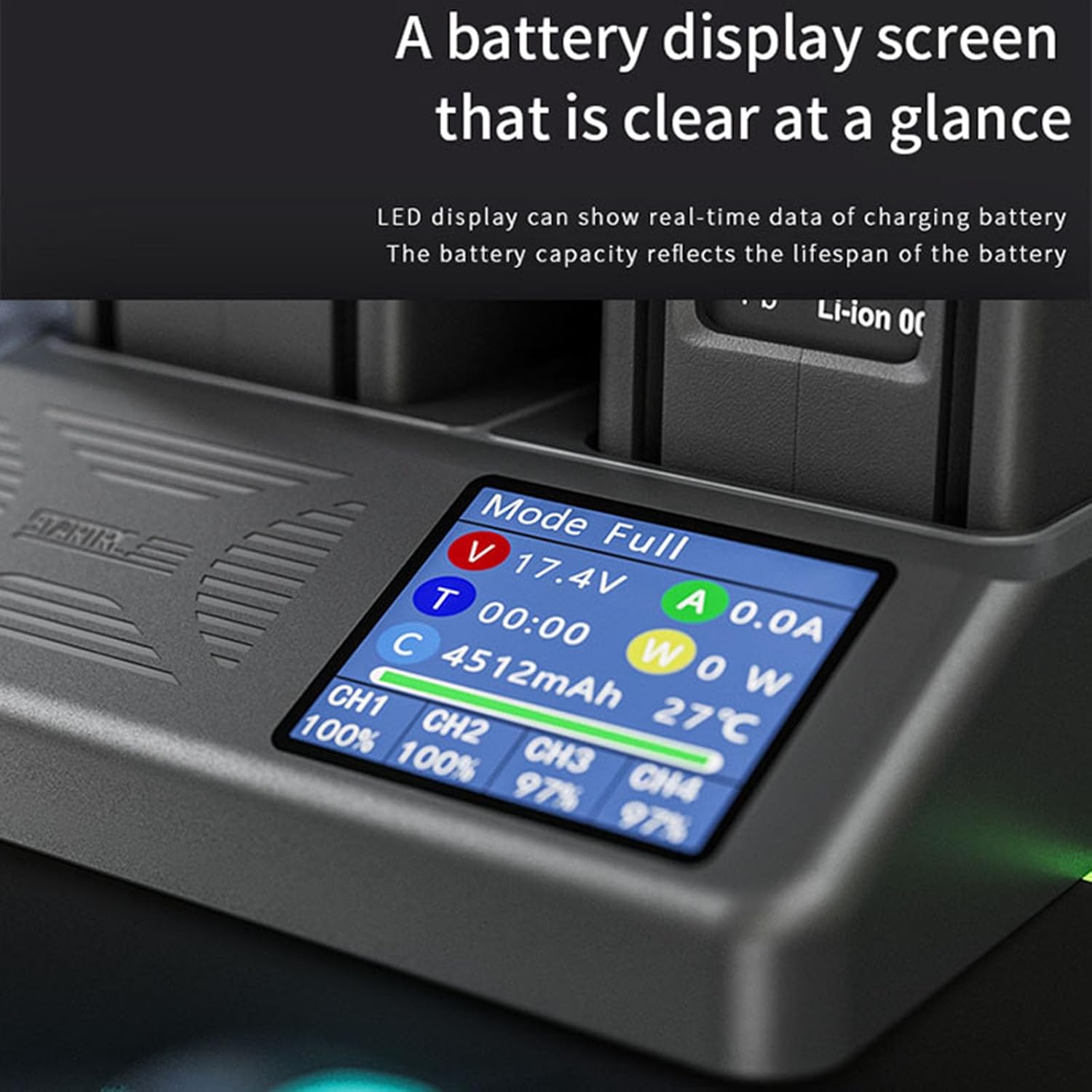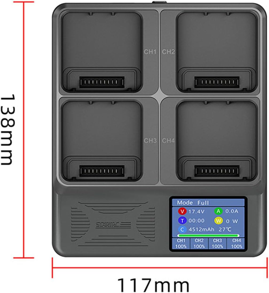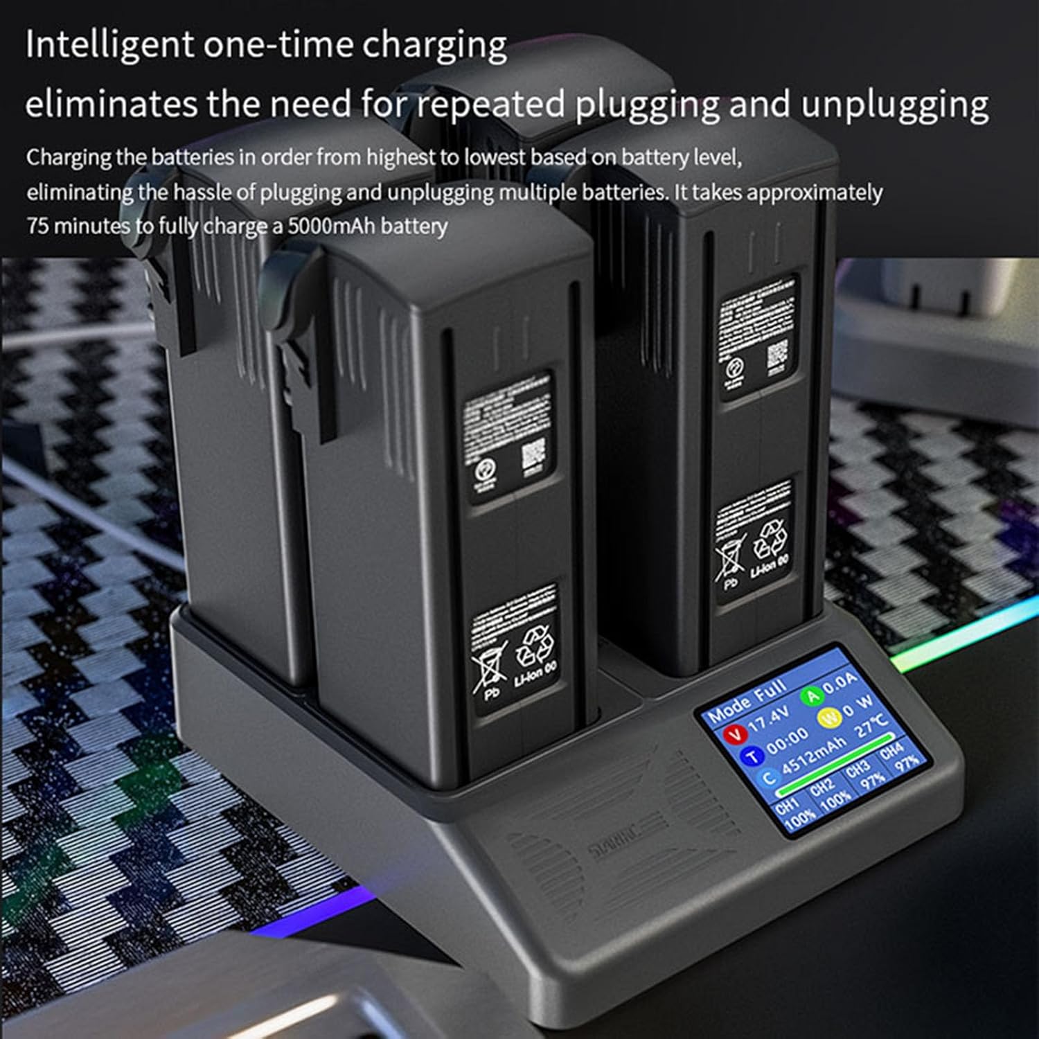 Design personalizzato per batterie Mavic serie 3: progettato per batterie Mavic 3 Pro/Mavic 3 Classic/Mavic 3 Cine/Mavic 3, viene fornito con un cavo USB-C e si consiglia di utilizzare caricabatterie USB-C da 65 W o altri caricabatterie che supportano il protocollo di ricarica rapida USB PD. Efficiente e risparmio di tempo: può caricare fino a quattro batterie Mavic serie 3 (5000 mAh), caricandole in ordine dal livello della batteria più alto al più basso, eliminando il fastidio di collegare e scollegare una per una quando si caricano più batterie. Tutte e quattro le porte supportano la ricarica rapida PD, ci vogliono circa 75 minuti per caricare completamente una batteria da 5000 mAh. La spia non lampeggia alla fine della ricarica. Lo schermo è chiaro a colpo d'occhio: il display LCD mostra i dati in tempo reale delle batterie ricaricabili: tensione, corrente, potenza, tempo di utilizzo, capacità della batteria, temperatura della batteria, avanzamento della carica e livello della batteria; il display LCD può visualizzare il livello di potenza delle quattro batterie, non c'è bisogno di inserire le batterie nel drone, mettere le batterie nel gestore di carica, premere il pulsante della batteria per controllare il livello della batteria; la capacità della batteria può riflettere la durata della batteria. Modalità di ricarica e modalità di archiviazione: premere a lungo il pulsante di accensione per passare dalla modalità di ricarica alla modalità di archiviazione, la modalità di ricarica si carica fino al 100%, la modalità di archiviazione si carica fino al 60% quando il livello della batteria è inferiore al 60%. Quando la batteria è pronta per essere conservata per un lungo periodo di tempo, deve essere mantenuta a circa il 50%-80%, la piena potenza e la bassa potenza causeranno danni alla batteria, quindi la modalità di archiviazione può proteggere le batterie quando non si utilizzano le batterie per un lungo periodo di tempo. Protezione di ricarica: l'hub di ricarica ha otto funzioni di sicurezza per proteggere da sovraccarico, sovratensione e cortocircuiti, garantendo la sicurezza delle batterie e dei dispositivi. La corrente di mantenimento intelligente garantisce la saturazione della batteria riducendo la temperatura di carica della batteria per proteggere efficacemente la durata della batteria.