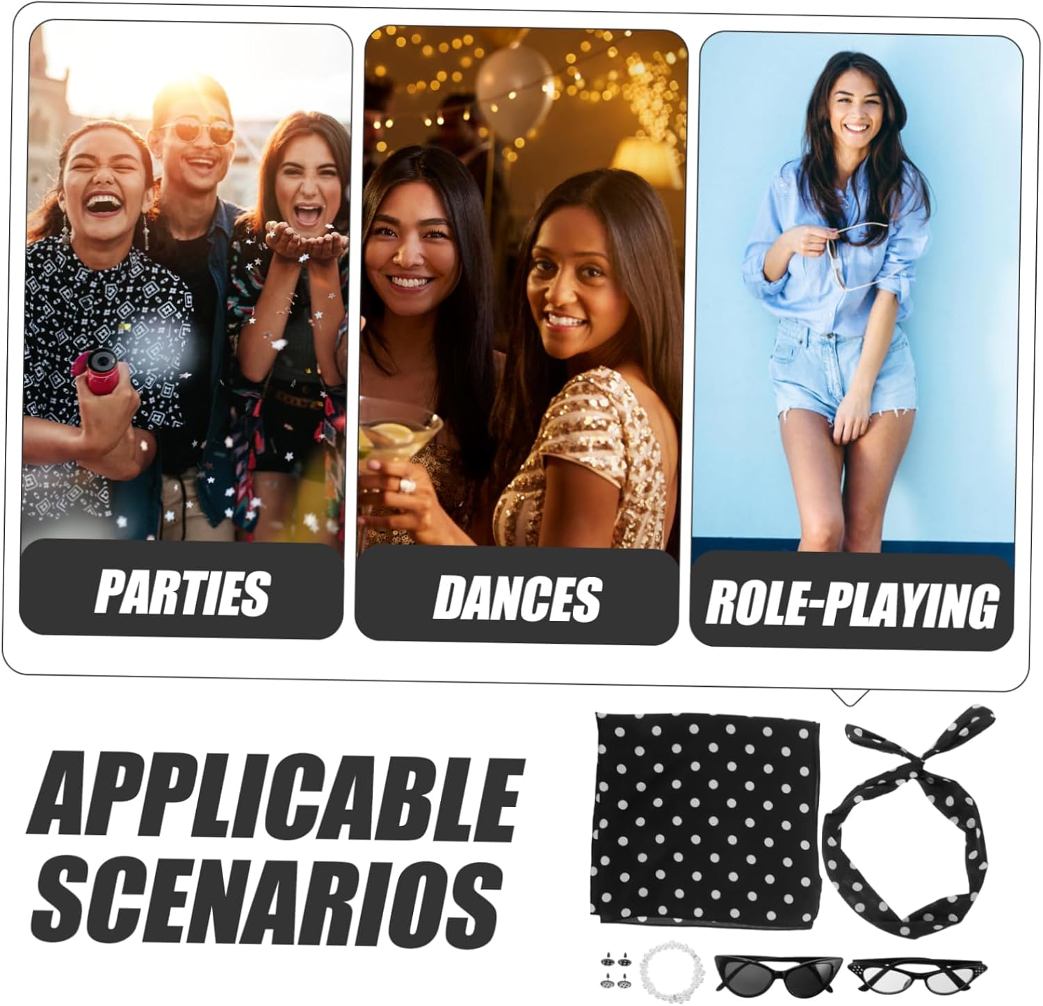 il pacchetto include 1 braccialetto 1 fascia per 1 sciarpa 2 occhiali 2 paia di orecchini caratteristiche -il design classico degli anni '50 aggiunge un tocco di divertimento: il design del set per feste anni '50 riporta il retrò costume adulto . -dimensioni: 46,00x46,00x0,20 cm/18,08x18,08x0,08 pollici oggetti di scena per costumi da gioco di ruolo -facile da indossare: la fascia per feste anni '50 è progettata per essere indossata facilmente e può adattarsi comodamente a oggetti di scena cosplay per donne di qualsiasi dimensione della testa. -dimensioni:75,00x5,50x0,20 cm/29,48x2,16x0,08 pollici accessori cosplay - :come mostrato donne -buoni materiali garantiscono durata: il set è realizzato con materiali piacevoli, la sua è tè. - Stili multipli: ci sono vari stili nel set di oggetti di scena per feste, che consentono di scegliere l'oggetto di scena cosplay preferito. -materiale: poliestere, gonne in plastica -il set è adatto a persone di tutte le età, rendendolo adatto a persone a cui piacciono i giochi di ruolo o le attività di cosplay. descrizione della merce Accessori per costumi anni '50 adatti per la maggior parte delle occasioni, come feste, cosplay, quotidiani, Halloween, spettacoli, oggetti fotografici, ecc. Oggetti di scena per cosplay per donne, comodi e disponibili in una varietà di stili per soddisfare esigenze diverse. Oggetti di scena per feste in cosplay per donne, questo set di oggetti per feste anni '50 è un classico gioco di ruolo adatto a feste, balli e cosplay