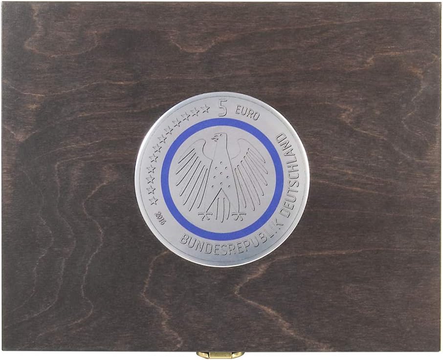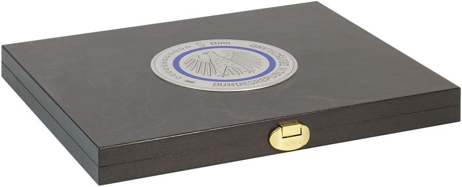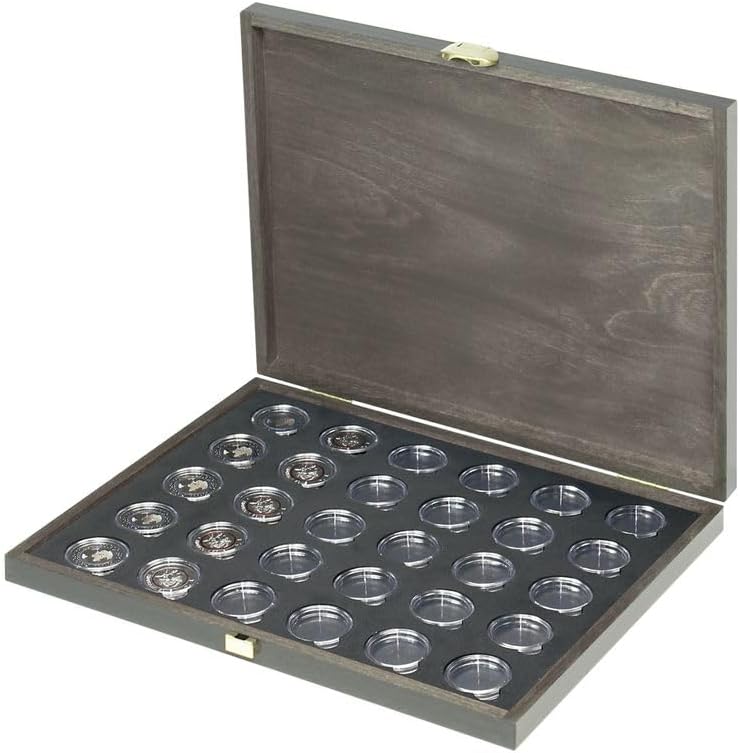 Cassetta per monete in vero legno con inserto per monete in schiuma BLACK VELVET con 30 rientranze rotonde. incl. 30 capsule portamonete LINDNER per monete da collezione tedesche da 5 euro. Formato: 303 x 240 x 30 mm. PRODOTTO IN GERMANIA.