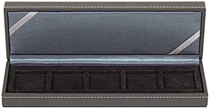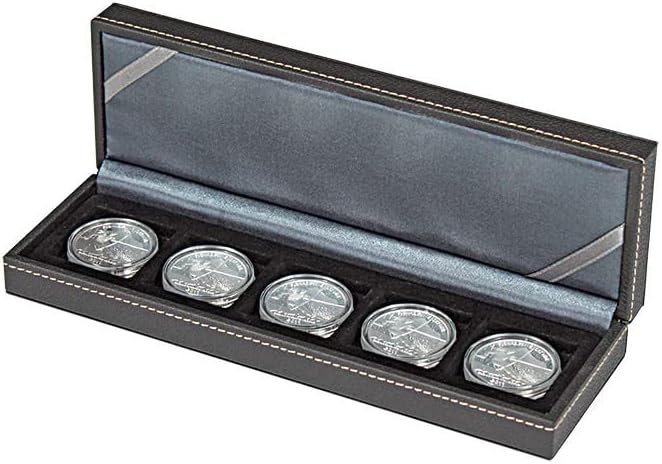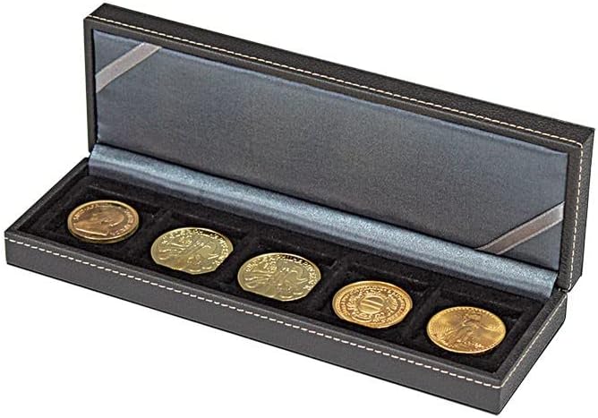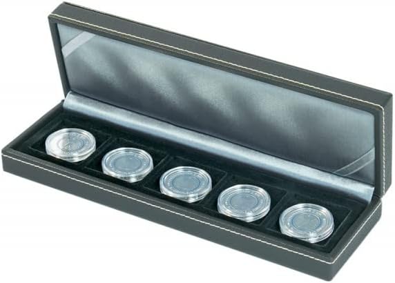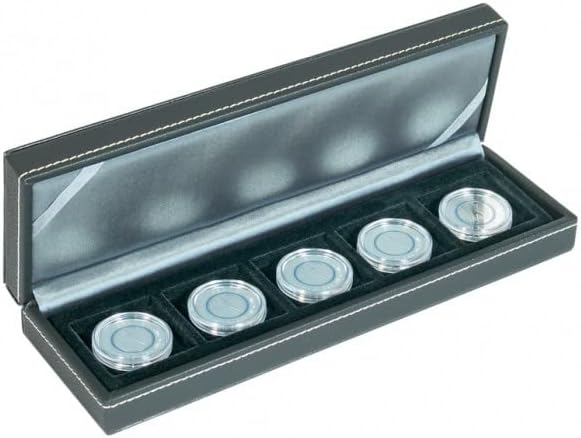 Cassetta portamonete con superficie nera granulata in elegante similpelle e leggere cuciture decorative. Cuscino coperchio color antracite. Con un inserto portamonete nero con 5 scomparti quadrati. L'inserto per monete è ricoperto da un fiocco di velluto di alta qualità. Formato: 243 mm x 77 mm x 38 mm. Adatto per monete/capsule per monete fino a un diametro esterno di 40 mm.