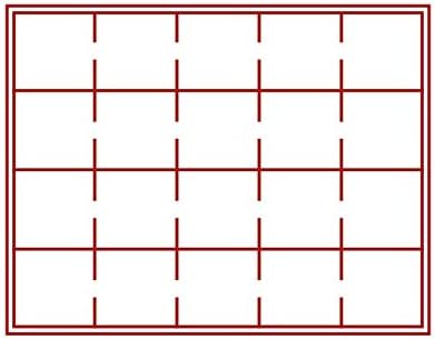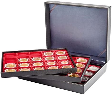 Cassetta per monete con superficie nera ruvida in elegante similpelle e cuciture decorative chiare. Con cuscino interno in color antracite. Con 3 vassoi e inserti per monete rosso chiaro con 20 scomparti quadrati ciascuno. L'inserto è rivestito di pregiato velluto. Misure esterne: 310 mm x 255 mm x82 mm. Adatto per cornicette per monete 50x50 mm, capsule per monete CARRÉE o OCTO.