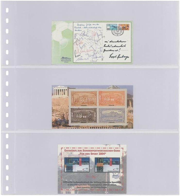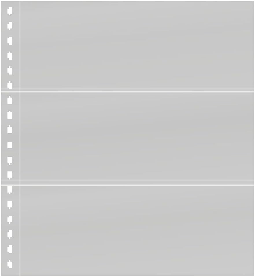 Crystal clear pocket page with 3 strips (90 mm). Max. insertion width 242 mm. Black interleaving. External measurements: 272 x 296 mm.