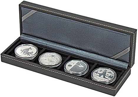 Portamonete con superficie scanalata nera in pregiata similpelle e cuciture decorative bianche. Imbottitura interna color antracite nel coperchio. Con vassoio numismatico nero con 4 celle quadrate. Il vassoio numismatico è ricoperto da un floccaggio di velluto di alta qualità. Formato: 243 mm x 77 mm x 38 mm. Adatto per monete/capsule fino a est. Ø. 52 mm, ad es. per casse numismatiche 50x50 mm, capsule SQUARE o capsule OCTO.