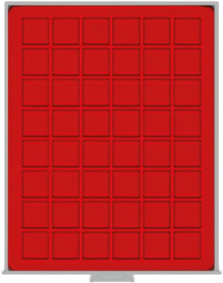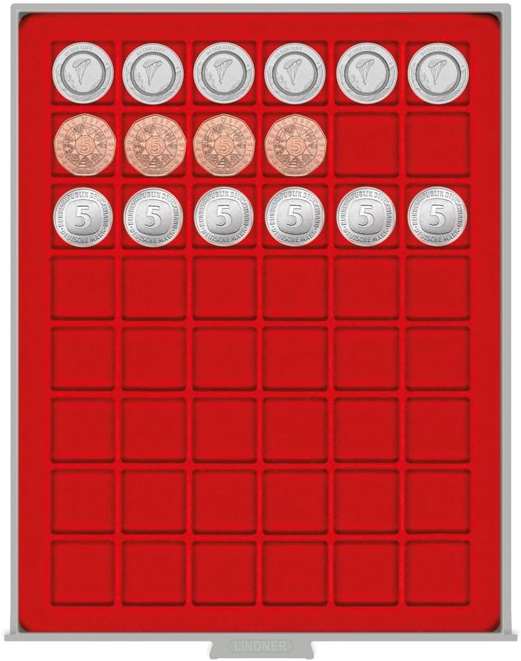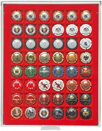 Cassetta portamonete con cassetto grigio chiaro e coperchio trasparente. Vassoio numismatico rosso brillante con 48 celle quadrate. Formato: Altezza 20 mm, Larghezza 236 mm, Profondità 303 mm. La parte superiore è ricoperta da un floccaggio di velluto rosso brillante di alta qualità. Adatto per monete/capsule fino a est. Ø. 30 mm e anche capsule di champagne.