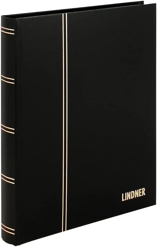Stamp album, unpadded leatherette. 32 black pages (16 sheets) with linen hinge 9 transparent strips per page, double interleaving pages Format: 230 x 305 Golden stripes on lid and spine