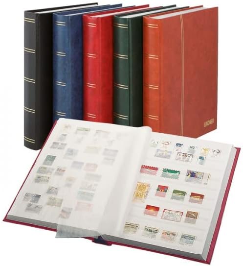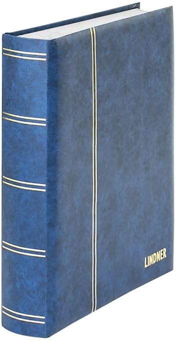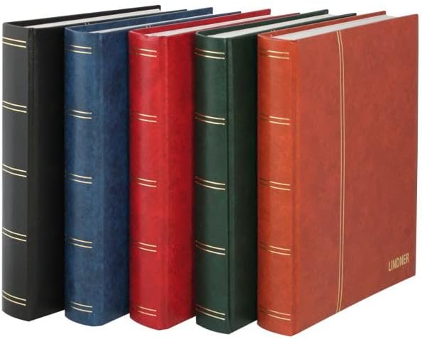 Album per francobolli con copertina imbottita in similpelle. 60 pagine bianche (30 fogli) con doppia cerniera in lino. 10 strisce continue di pergamina per pagina, doppi interfogli di pergamina. Formato: 230 x 305 mm. Strisce dorate sul coperchio e sul dorso.