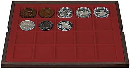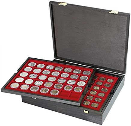 Cassetta in vero legno con quattro vassoi e inserti portamonete rosso scuro con scomparti quadrati di diverse dimensioni. Gli inserti per monete sono ricoperti da un fiocco di velluto di alta qualità. Capacità: 127 monete Classificazione dei vassoi: Un vassoio con 20 scomparti per monete fino a Ø 47 mm, un vassoio con 24 scomparti per monete fino a Ø 42 mm, un vassoio con 35 scomparti per monete fino a Ø 36 mm, un vassoio con 48 spazi per monete fino a Ø 30 mm. Formato: 325 x 265 x 65 mm. PRODOTTO IN GERMANIA.