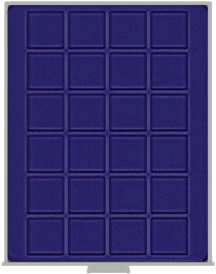 Gettoniera con cassetto grigio chiaro e cornice trasparente. Inserto portamonete blu scuro con 24 scomparti quadrati. Formato: altezza 20 mm, larghezza 236 mm, profondità 303 mm. L'inserto per monete è rivestito con un fiocco di velluto blu scuro di alta qualità. Adatto per monete/capsule per monete fino a un diametro esterno di 42 mm.