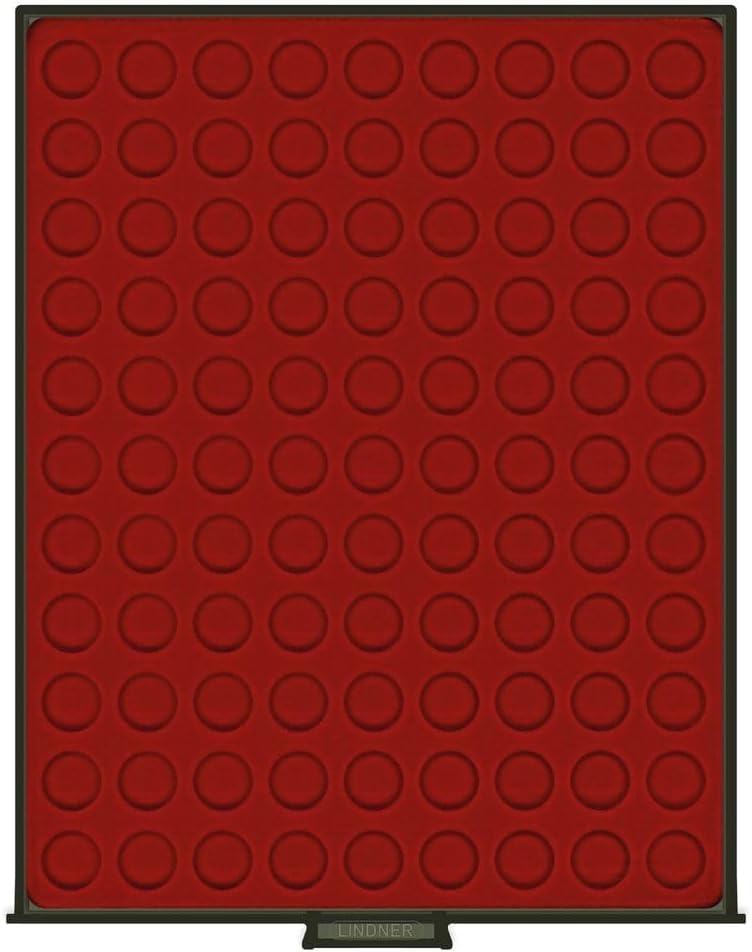 Gettoniera con cassetto in effetto vetro fumé e cornice trasparente. Inserto per monete rosso scuro con 99 rientranze rotonde. Formato: altezza 20 mm, larghezza 236 mm, profondità 303 mm. L'inserto per monete è ricoperto da un fiocco di velluto rosso scuro di alta qualità. Adatto per monete con un diametro di 19,25 mm, ad es. per 2 centesimi di euro.