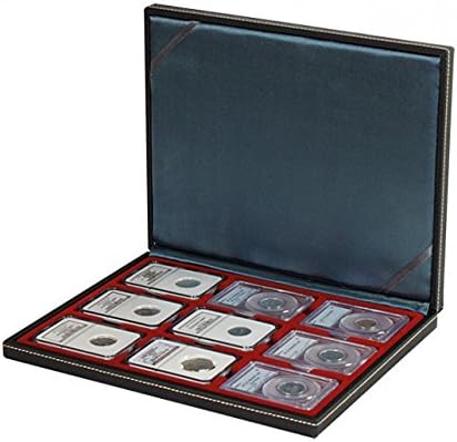 Cassetta portamonete con superficie nera granulata in elegante similpelle e leggere cuciture decorative. Cuscino coperchio color antracite. Con inserto portamonete rosso scuro con 9 scomparti rettangolari. L'inserto per monete è ricoperto da un fiocco di velluto di alta qualità. Formato: 298 mm x 243 mm x 35 mm. Adatto per capsule portamonete USA (slab) fino al formato 63x85 mm.