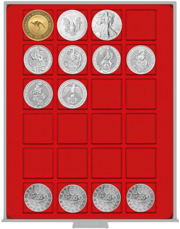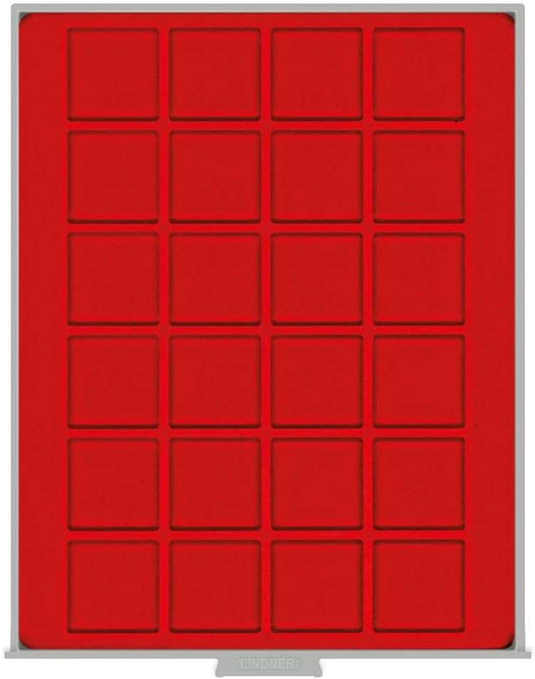 Gettoniera con cassetto grigio chiaro e cornice trasparente. Portamonete rosso chiaro con 24 scomparti quadrati. Formato: altezza 20 mm, larghezza 236 mm, profondità 303 mm. L'inserto per monete è ricoperto da un fiocco di velluto rosso chiaro di alta qualità. Adatto per monete/capsule per monete fino a un diametro esterno di 42 mm.