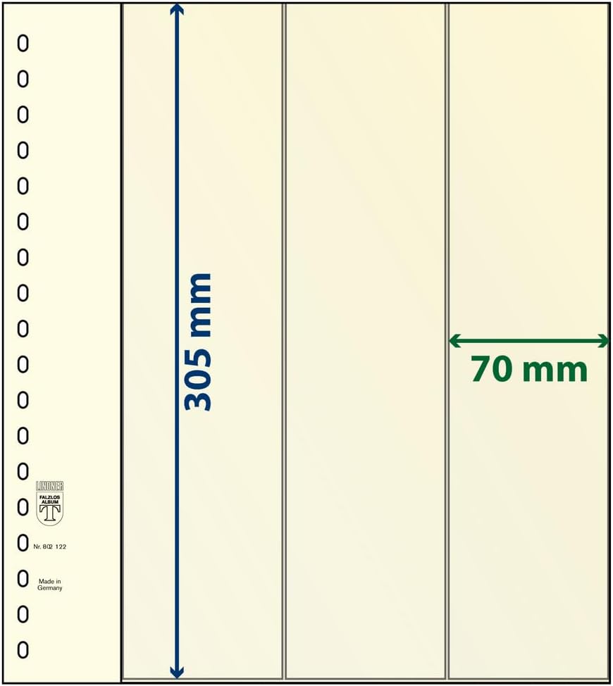 Descrizione prodotto Each page of the LINDNER-T system consists of a PERMAPHIL card page and a PVC foil sheet which is fixed on the left side. The stamps are placed inside the sheet strips and are protected on both sides by the sheet pockets. The sheet foil is tightly attached to the left margin of the card page with a special glue method, allowing for easy leafing. This way both the front and back of the stamp can be viewed, without having to remove it from the protective sheet. This is the typical LINDNER-T system trait. All pages of the LINDNER-T system have 18-ring hole punch, which gives them a sturdy hold in all LINDNER ring binders with 18-ring mechanism. Avviso di sicurezza Non adatto a bambini sotto i 3 anni!