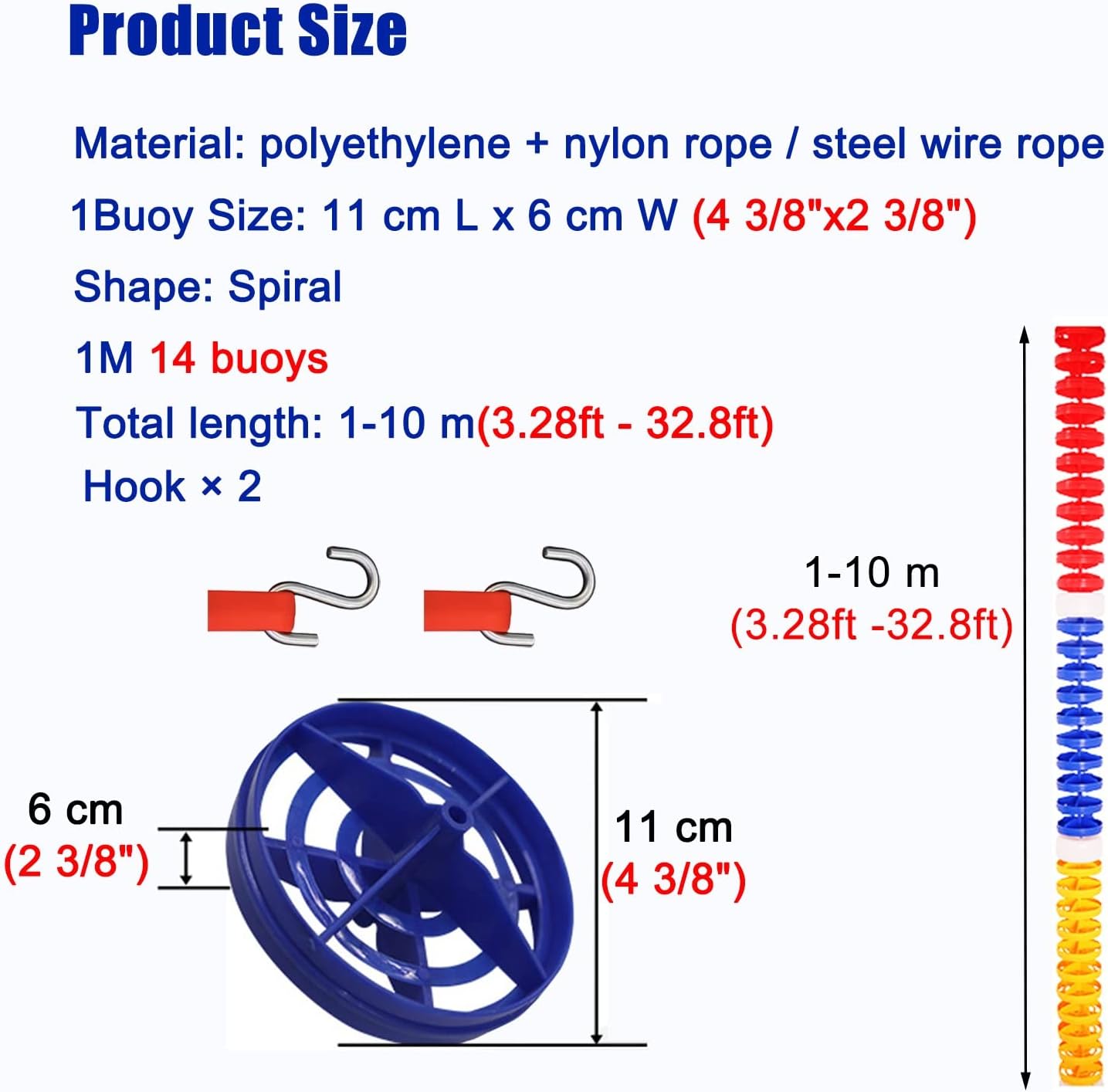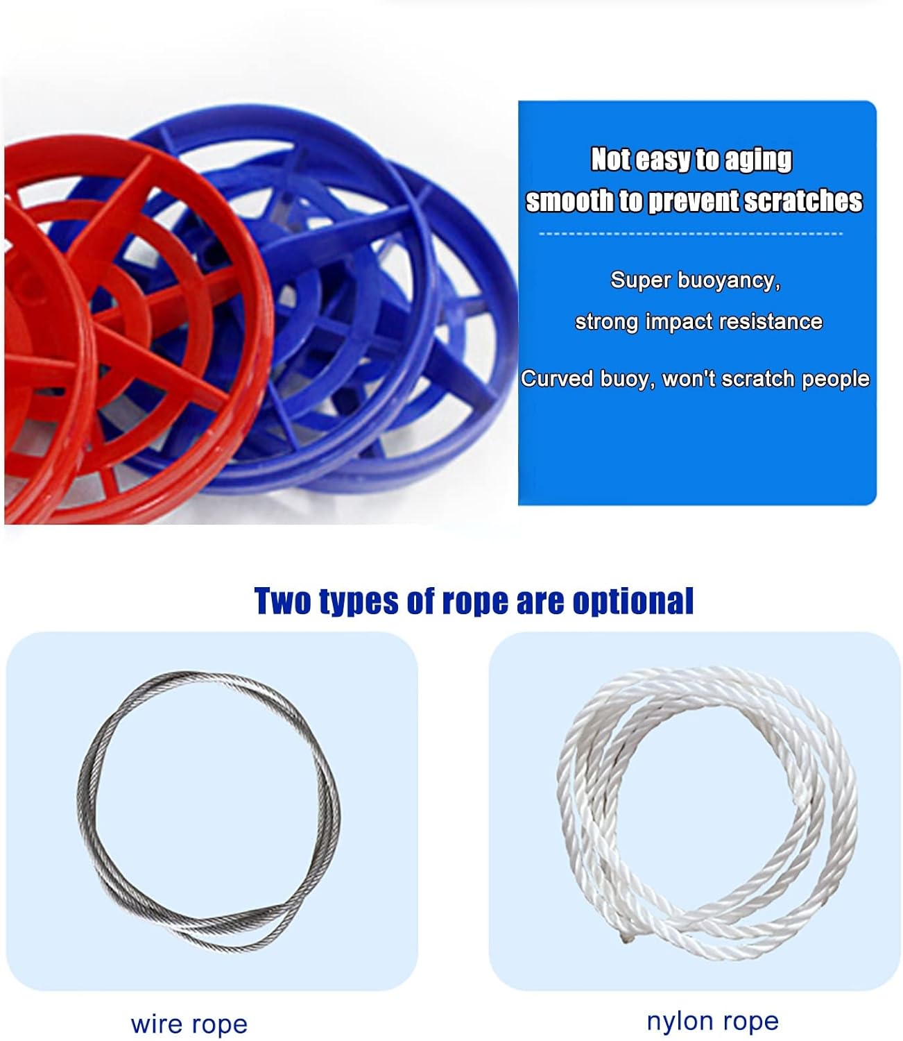 【Specifiche della corda divisoria per piscine】 Dimensioni di ciascuna boa: 11 cm L x 6 cm L (4 3/8"x2 3/8"). Quantità boe piscina: 14 / m. 【Facile da installare】 Fissare entrambe le estremità della linea della boa di sicurezza agli ancoraggi a muro con i nostri ganci. È molto stabile dopo il fissaggio, non si allenta né cade e può essere utilizzato a lungo. 【Ampia applicazione】 Utilizzato per separare corsie e aree di nuoto, ampiamente utilizzato in piscine, corsi d'acqua, aree pericolose, spiagge, ostacoli bassi, ecc. 【Divisore per corsia della piscina durevole】 Realizzato con fune in nylon/acciaio di alta qualità + boa in plastica HDPE, resistente e leggero, forte galleggiabilità, protezione ambientale, resistente all'usura, anti-ultravioletto, riutilizzabile. 【Visibilità sicura ed efficace】 I colori vivaci delle boe sono facili da identificare nell'acqua e possono distinguere chiaramente le estremità profonde e poco profonde della piscina e le corsie di nuoto. Mantieni tutti al sicuro mentre nuoti.