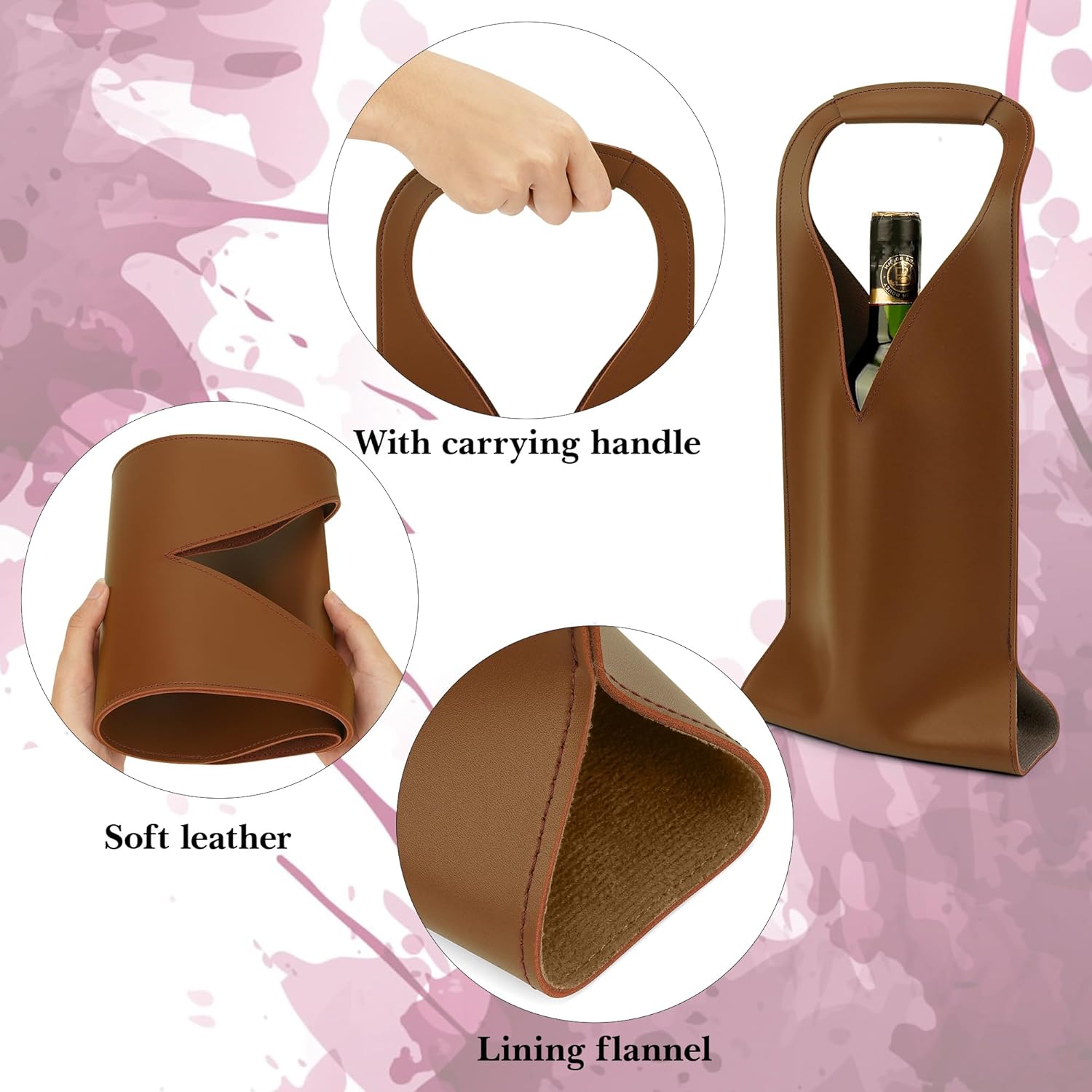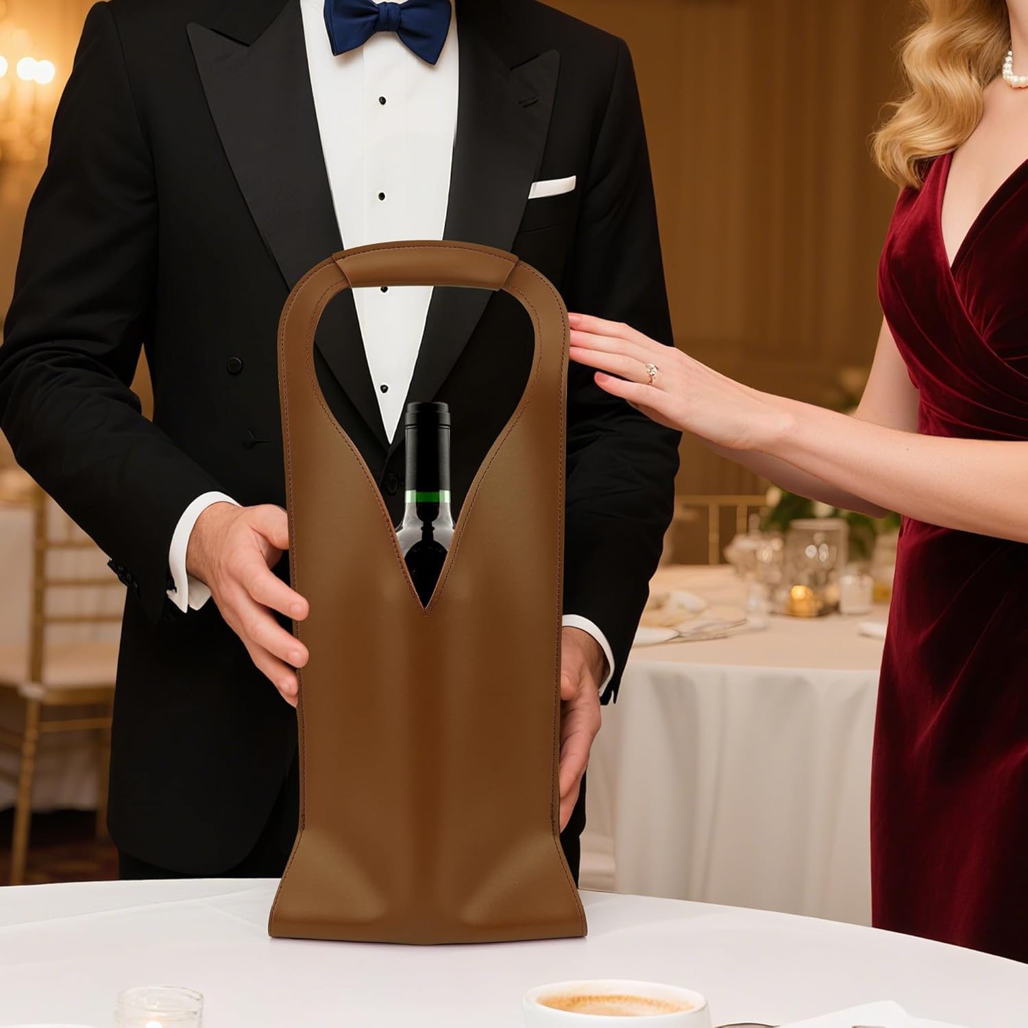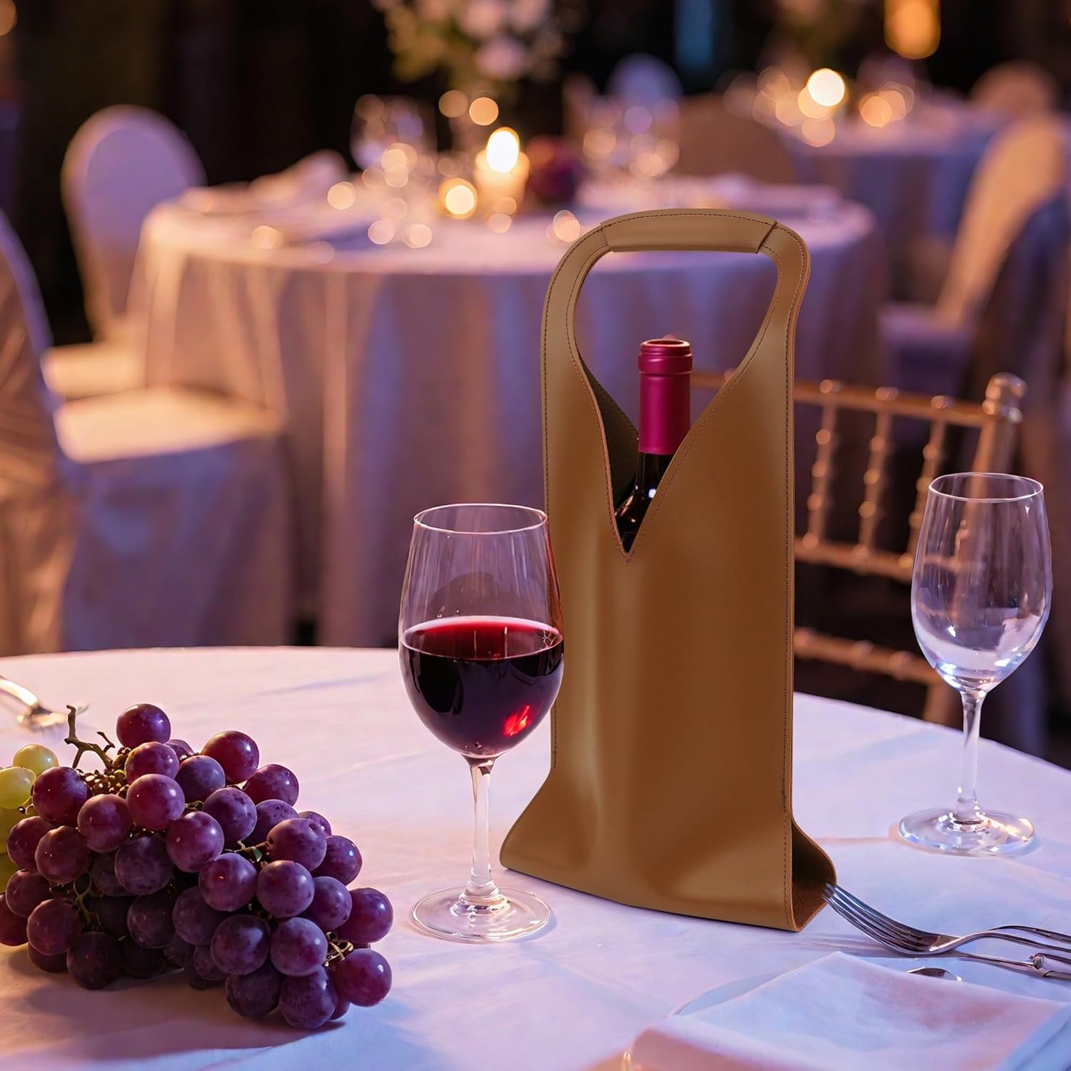 Borsa regalo per bottiglia di vino realizzata in pelle vegana, buona durata, resistente agli strappi e riutilizzabile. Le borse riutilizzabili per bottiglie di vino con manici possono ospitare facilmente le tue bottiglie di vino standard. I sacchetti regalo di vino di Natale sono perfetti per la presentazione nella maggior parte delle occasioni, rendendo i regali speciali. Dimensioni borsa vino: 42,5 x 17,5 cm. Contenuto della confezione: 1 sacchetto regalo per bottiglia di vino con manici, altri non inclusi.