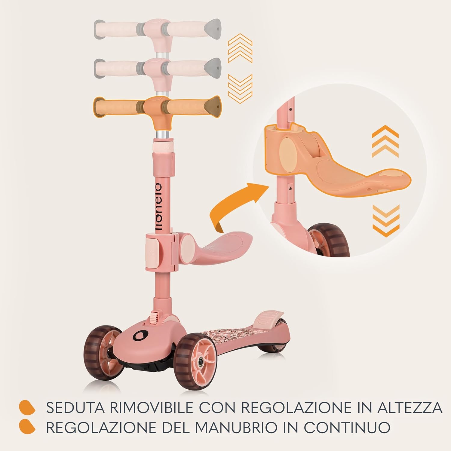 MONOPATTINO 3 RUOTE MULTIFUNZIONE 2 IN 1: è un prodotto versatile che combina le funzioni di una bici senza pedali da 1 a 20 kg e di un triciclo per bambini da 3 a 50 kg, ideale per i bambini che crescono. Franky è il regalo perfetto per invogliare il bambino a trascorrere del tempo all'aria aperta, imparando fin da piccolo l'equilibrio e la coordinazione dei movimenti. GUIDA SICURA: 3 grandi ruote (anteriori 12 cm, posteriori 9 cm) garantiscono l'elevata stabilità e il comfort di guida. Il monopattino ha un design ergonomico adatto alle proporzioni del corpo del bambino. La sicurezza è garantita dal rivestimento antiscivolo della pedana grande e dal freno integrato nell'asse posteriore. GUIDA COMFORTEVOLE: il monopattino è dotato della regolazione continua dell'altezza del manubrio nell'intervallo 58-82 cm. La seduta rimovibile può essere regolato in altezza di 22 cm e 25 cm. Le comode impugnature migliorano il comfort di guida, mentre il limitatore della sterzata del manubrio a 65 gradi impedisce che il monopattino si ribalti durante la guida. RUOTE ILLUMINATE A LED: il monopattino a tre ruote è una grande attrazione per i bambini e un effetto sorprendente grazie all'illuminazione a LED sulle ruote attivate e alimentate dal movimento. Il monopattino e la bici sono dotati di cuscinetti ABEC-9 che garantiscono la guida molto fluida e silenziosa. PRATICO: il monopattino può essere facilmente piegato senza dover smontare il manubrio. Franky è facile da pulire - è sufficiente passare leggermente con un panno umido. Il pratico cestino sarà perfetto per trasportare merendine o giocattoli. Il peso del monopattino per bambini è di 2,9 kg e, con la seduta, di 3,5 kg.