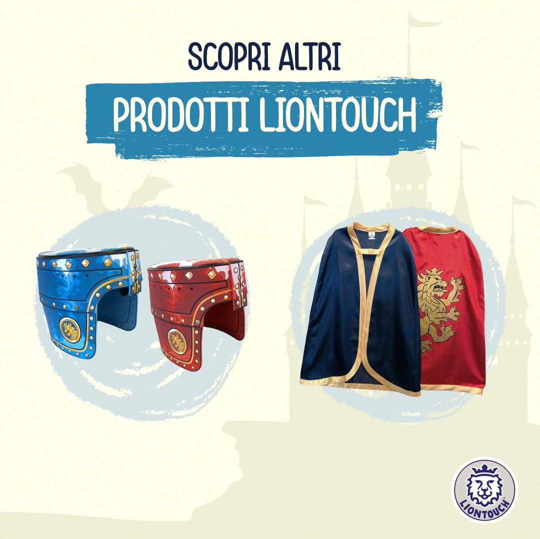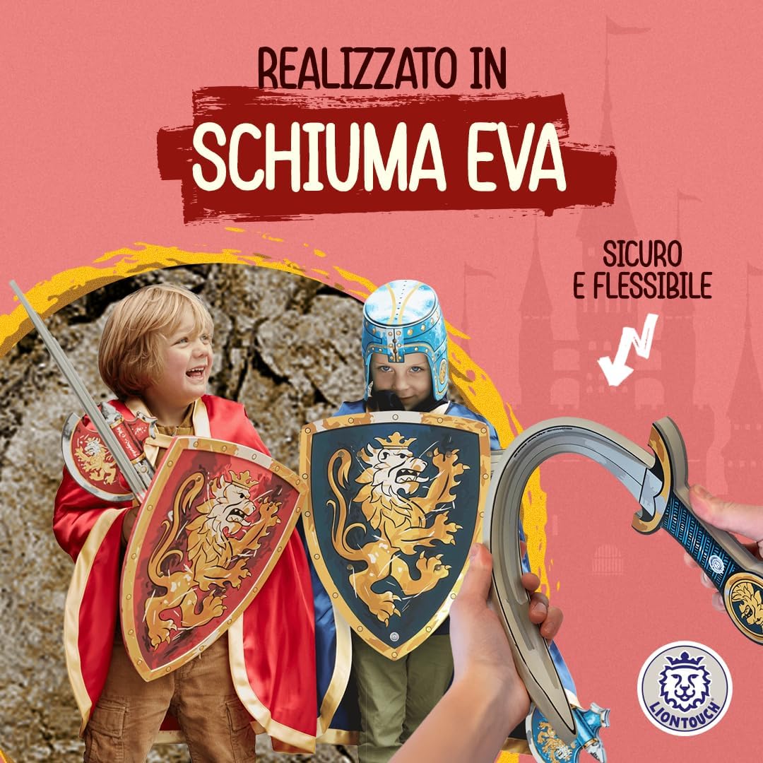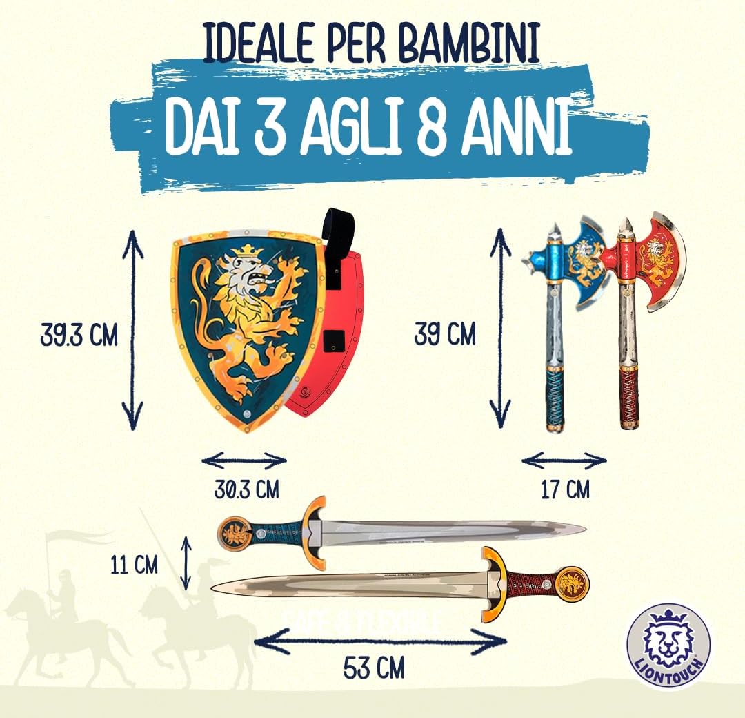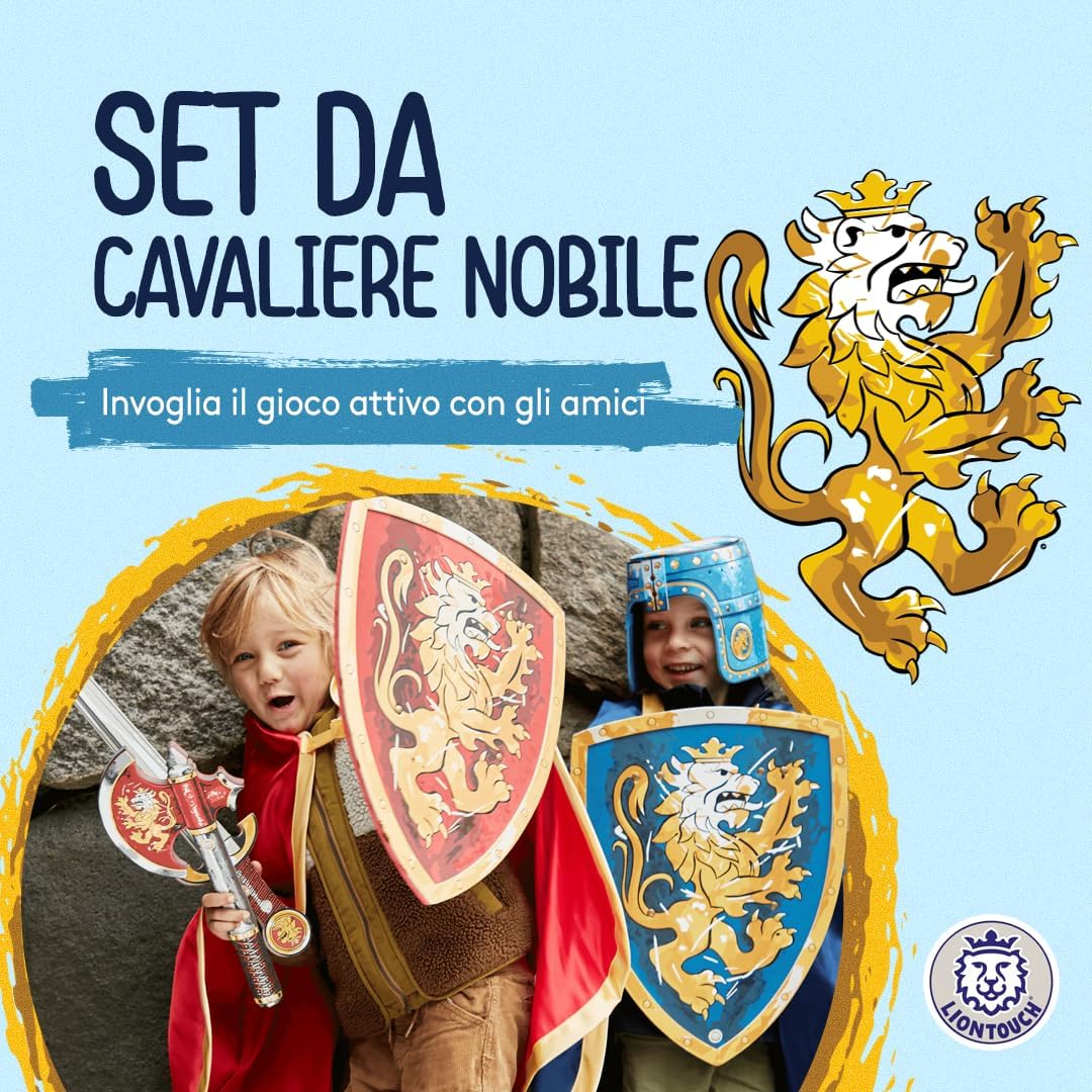 GIOCO DI RUOLO per bambini dai 3 agli 8 anni. Incarna il Nobile Cavaliere, il protettore del re, e impegnati in nobili missioni. Ideale per compleanni, regali di Natale, o per vestirsi per Halloween e Carnevale LE SPADE, GLI SCUDI E LE ASCIE sono realizzati in schiuma morbida e flessibile che garantisce un cosplay sicuro con dettagliate decorazioni a tema Nobile Cavaliere con il Leone Dorato come motivo. Preparati a sconfiggere i draghi e partire in missioni per salvare il Regno dal male. SPEDITO IN UNA SCATOLA REGALO pronta per essere consegnata e garantire una piacevole esperienza di unboxing - contiene anche un piccolo catalogo dell'universo Liontouch. Ideale per ogni occasione festiva e con accessori disponibili TESTATO PER LA SICUREZZA in conformità con gli standard europei e americani e completamente flessibile, sicuro e stabile grazie alla qualità della schiuma e senza uso di bastoni all'interno. Completamente sicuro e senza materiali tossici GIOCATTOLI DA CAVALIERE MEDIEVALI progettati in Danimarca per bambini con attenzione ai dettagli e alla qualità mirata a ispirare i bambini a giocare attivamente usando solo la loro immaginazione. Liontouch incoraggia il movimento fisico e offre al bambino un divertente tempo senza schermo