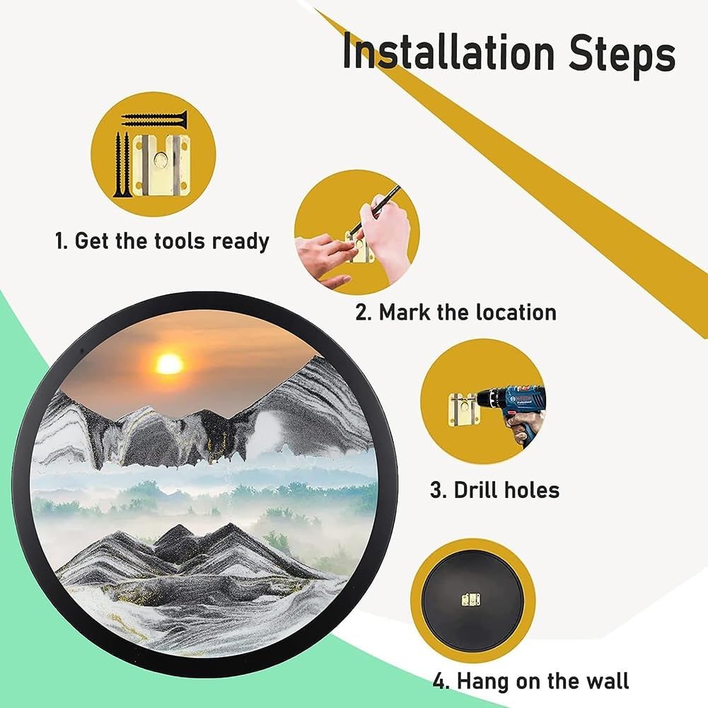 Alta qualità: realizzato in sabbia naturale di alta qualità, consistenza fine, colore spesso di lunga durata, strato trasparente. Il vetro ad alta trasparenza senza piombo come il cristallo trasparente come la goccia d'acqua ti consente di goderti appieno la bellezza delle sabbie mobili. Struttura in legno massello, sicura e migliore sensazione al tatto, stabile e pesante, diametro: 29 cm, 36 cm, 44 cm Sensoriale rilassante: rotazione parallela a 360°, le immagini in movimento creano una nuova immagine di sabbia ad ogni giro. La sabbia non crea mai lo stesso design due volte. I dettagli del prodotto sono fini, sabbia accuratamente selezionata, colorata, livelli chiaramente delimitati, il flusso fuori dal motivo dell'effetto 3D è eccellente. Allevia lo stress: particolarmente adatto per chi lavora in ufficio, studenti e lavoratori informatici, può alleviare lo stress e l'affaticamento degli occhi. Speciale decorazione artistica da scrivania, adatta per soggiorno, studio, ufficio, lavoro o studio. Può anche essere dato alle persone più vicine, familiari, amici, colleghi e così via. Installazione da appendere: ogni confezione viene fornita con accessori di installazione, può essere appesa dietro. Dopo aver tolto il dipinto con la sabbia, ricominciare a farla scorrere e rimanere fermo per 10-20 minuti, capovolgere manualmente la pittura a sabbia a 180 °C, l'aria scorre attraverso il fondo delle sabbie mobili e più uniforme è la distribuzione, migliore è l'effetto, si può godere dell'affascinante immagine formata dalla caduta delle sabbie mobili Persone applicabili: l'immagine artistica in movimento con sabbia porterà un senso calmante, naturale e meraviglioso al tuo ufficio e alla tua casa. Può essere ampiamente utilizzato nella decorazione di hotel, ristoranti, bar, sale da ballo, uffici e salotti. È anche un buon prodotto per festival, compleanni, compleanni, celebrazioni, matrimoni, inaugurazione della casa, commemorazioni di viaggio e regali.