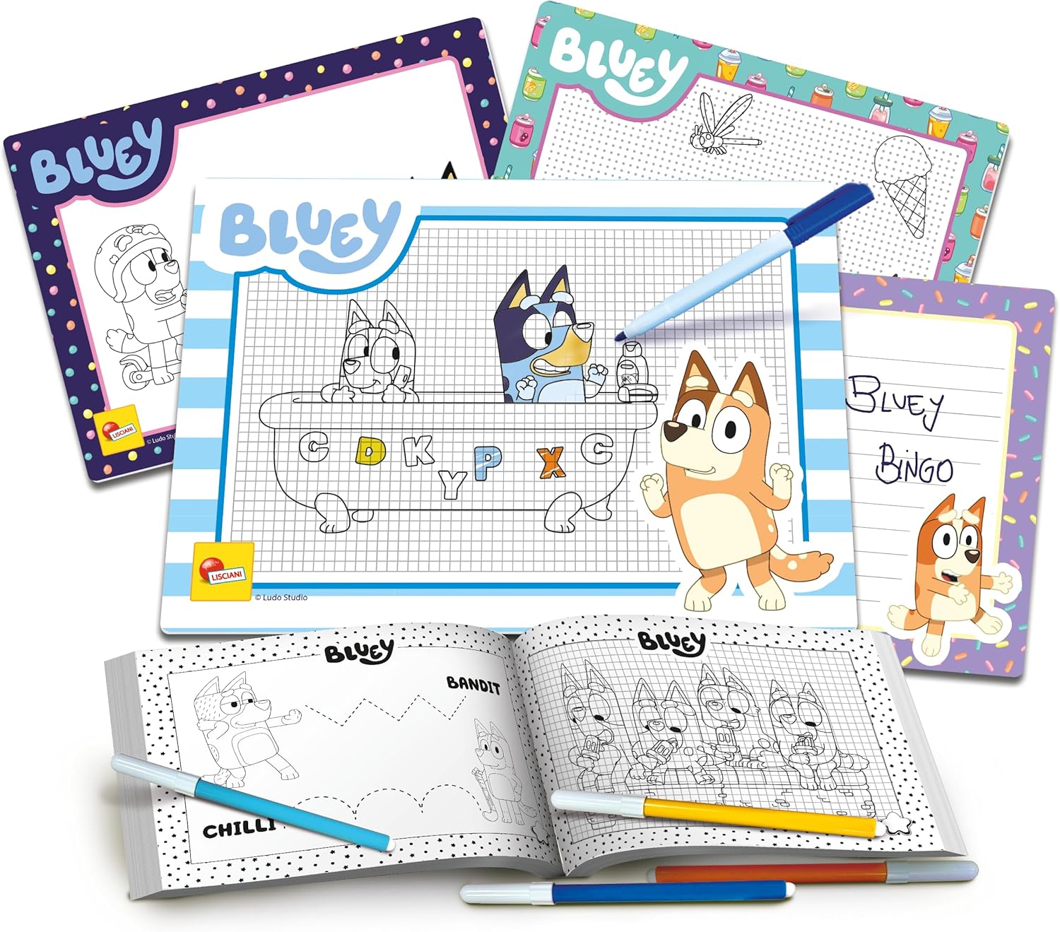 Divertiti e impara a disegnare con Bluey 4 Lavagnette scrivi e cancella personalizzate, 4 pennarelli colorati, Un manuale per imparare passo dopo passo l'arte del disegno CONTENUTO: 4 lavagnette scrivi e cancella, Quaderno operativo, Pennarello cancellabile, 4 pennarelli colorati Curiosità e capacità di osservazione, Sviluppo della creatività, Attenzione e concentrazione, Forme e colori, Manualità fine e coordinazione occhio, mano, Sviluppo del pensiero logico e di associazione, Stimola la fantasia