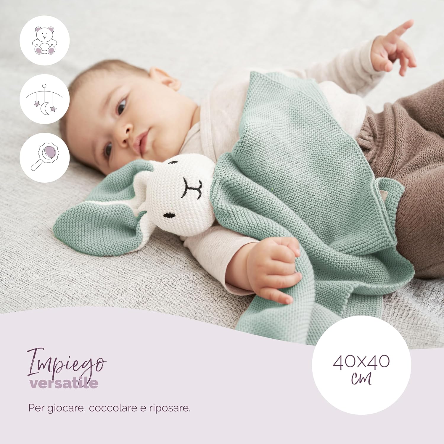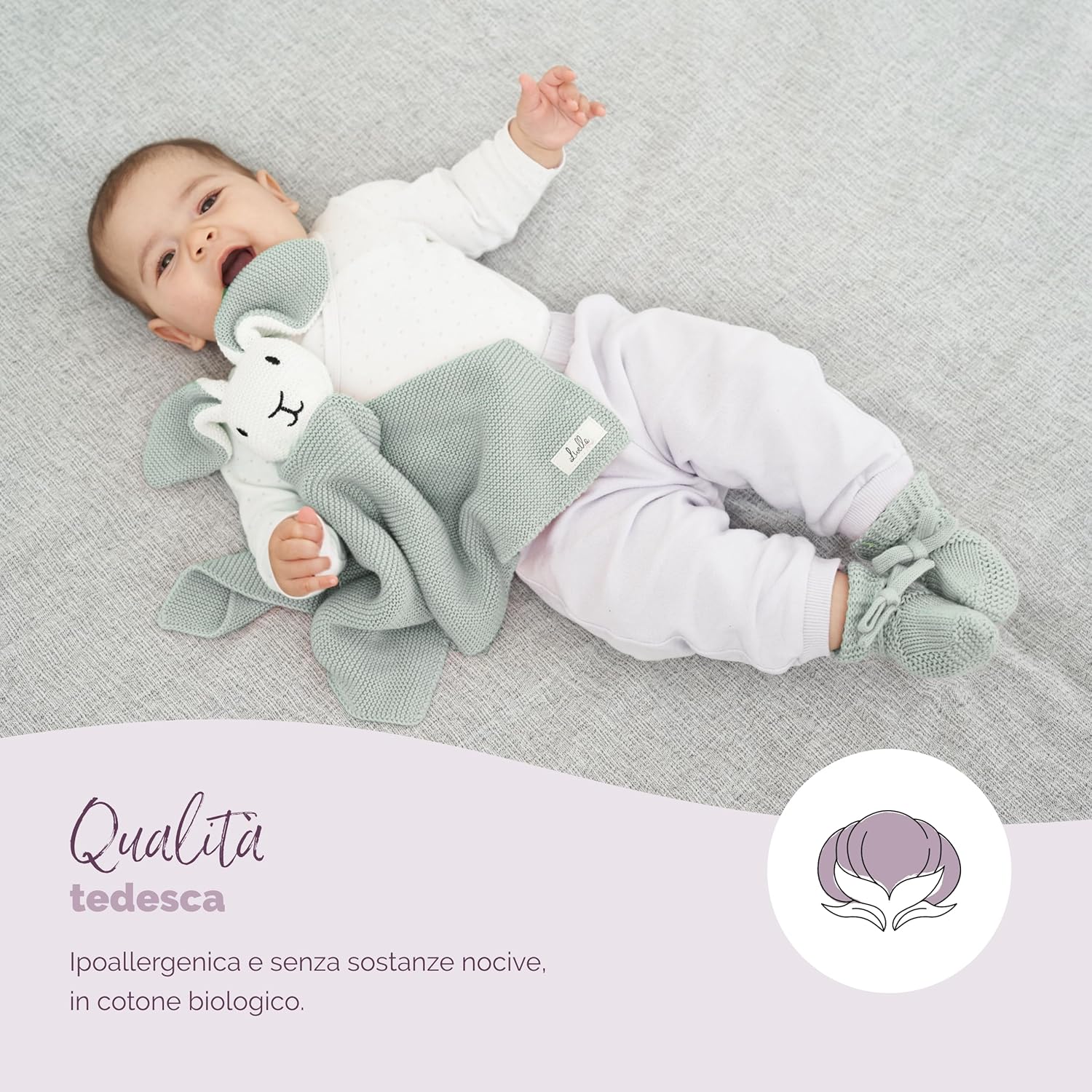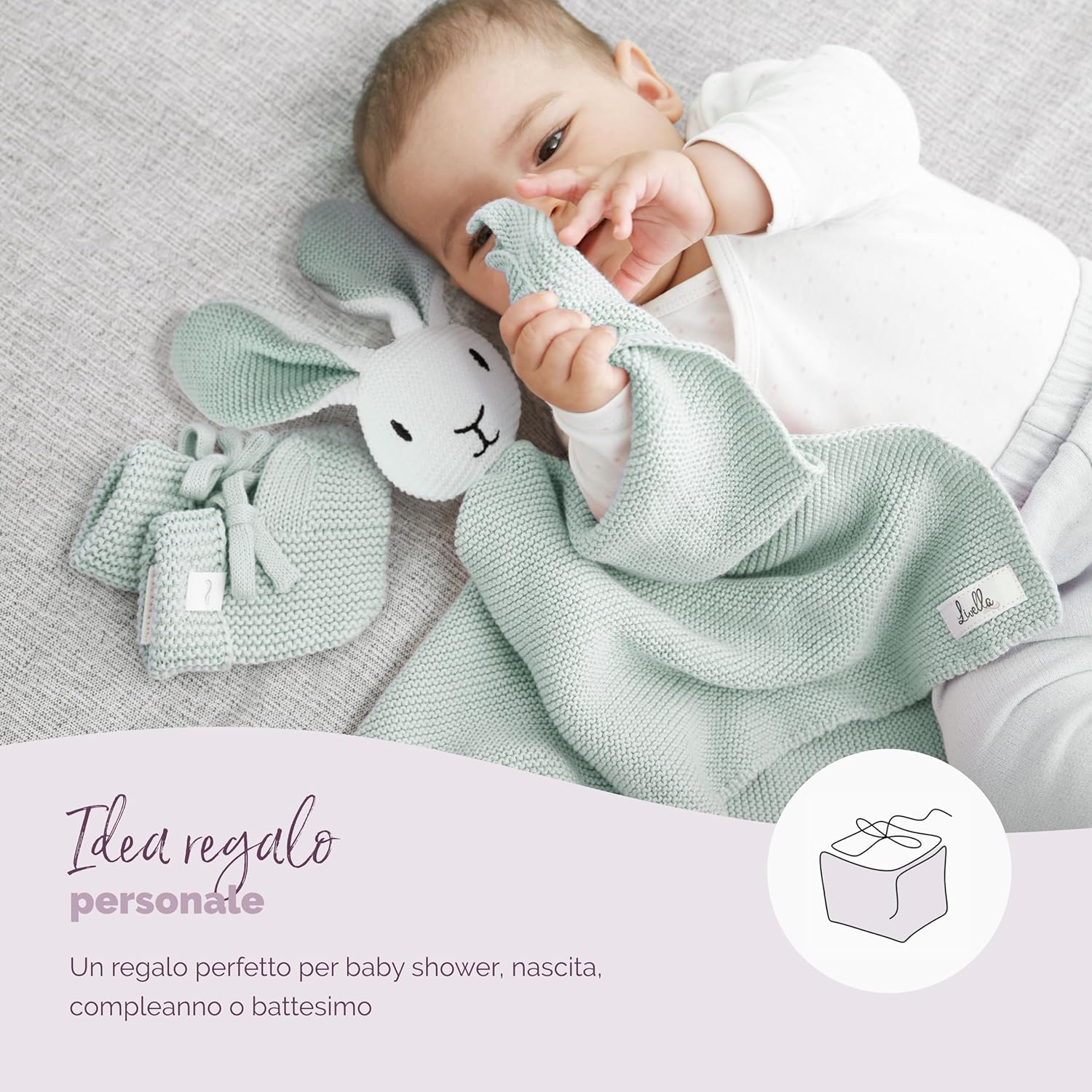 ✅TENERO DESIGN: Il doudou con il coniglietto ha una dimensione di 40 × 40 cm. I calzini e la copertina coccole sono realizzati in cotone biologico morbido e vellutato, con un motivo a maglia senza tempo. Entrambi i prodotti possono essere lavati a 30° C. ✅OVUNQUE: Il doudou può essere utilizzato come copertina in auto, nel passeggino o nella culla. Non dovrebbe mai mancare. Come fedele compagno del vostro bambino dona una sensazione di sicurezza e protezione anche in ambienti sconosciuti. ✅BIO DI ALTA QUALITÀ: Sia la copertina che le calze soddisfano i requisiti degli standard tessili OEKOTEX STANDARD 100 e GOTS. Sono privi di additivi chimici e sono ipoallergenici, il che li rende perfetti per la pelle sensibile del bambino. ✅IDEA REGALO ORIGINALE: Il grazioso motivo a maglia e la moderna tonalità pastello rendono il doudou Livella e i calzini coordinati ideali come regalo di nascita, battesimo, compleanno o per un baby shower. ✅SOSTIENE L'AGRICOLTURA ECOLOGICA: sia la copertina doudou Livella che i calzini coordinati sono realizzati in cotone biologico di alta qualità. Ogni acquisto sostiene l'agricoltura biologica e sostenibile.