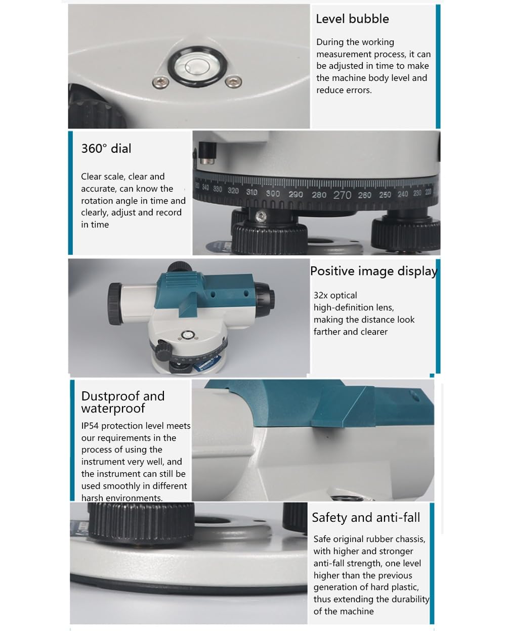 【Ingrandimento 32X e ampia apertura di 36 mm】Il livello ottico automatico offre immagini nitide con ingrandimento del telescopio 32X e un obiettivo da 36 mm, garantendo misurazioni accurate di altezza/distanza/angolo anche in condizioni di scarsa illuminazione. Raggiunge una deviazione standard di 1,0 mm for 1 km (doppia corsa) e una distanza di lavoro di 120 m for una precisione di livello professionale. 【Compensatore di smorzamento magnetico a X e blocco di trasporto】: Dotata di un avanzato compensatore di smorzamento magnetico con sospensione a filo a X, questa livella riduce al minimo le interferenze da vibrazioni e garantisce misurazioni stabili. Il blocco di trasporto protegge i componenti interni durante il trasporto, migliorandone la durata. 【Installazione rapida e design impermeabile IP54】 È dotato di una fiala a bolla circolare, di una filettatura for treppiede da 5/8" e di un robusto alloggiamento con grado di protezione IP54 for un'eccellente resistenza a polvere e acqua. La distanza di messa a fuoco minima di 0,3 m consente un allineamento rapido, ideale for ambienti esterni difficili. 【Ampie applicazioni e kit resistente】Perfetto for ingegneria edile, rilievi minerari e monitoraggio dei cedimenti. Include un filo a piombo, un perno di regolazione e una custodia rigida for un facile trasporto. Il cerchio graduato a 360° supporta misurazioni angolari flessibili. 【Compensatore autolivellante con blocco】Il livello ottico è dotato di un compensatore magnetico autolivellante con blocco di trasporto. Il dispositivo di blocco protegge il compensatore durante il trasporto e ne prolunga la durata. Inoltre, gli utenti possono verificare se la molla di sospensione del compensatore è danneggiata dalle vibrazioni dopo il trasporto e verificarne lo stato di funzionamento.