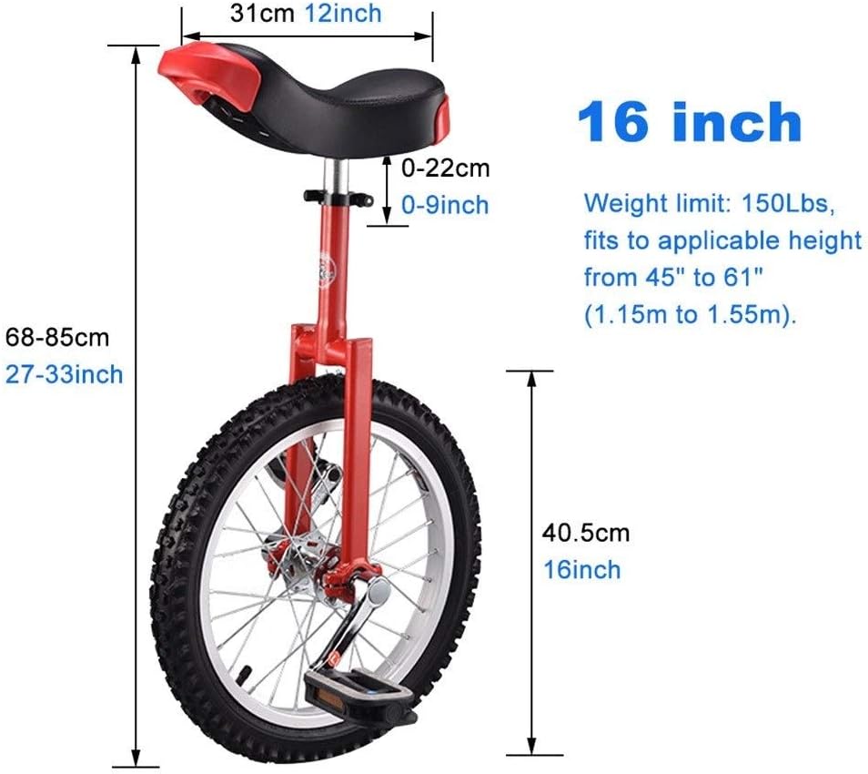 LoJax Monociclo per bambini/adulti, Monociclo per principianti da 16 pollici per bambini, Altezza regolabile, Pneumatici da montagna in butile antiscivolo, Balance Cycling, Cyclette, Carico fino a 150 kg (Rosso)