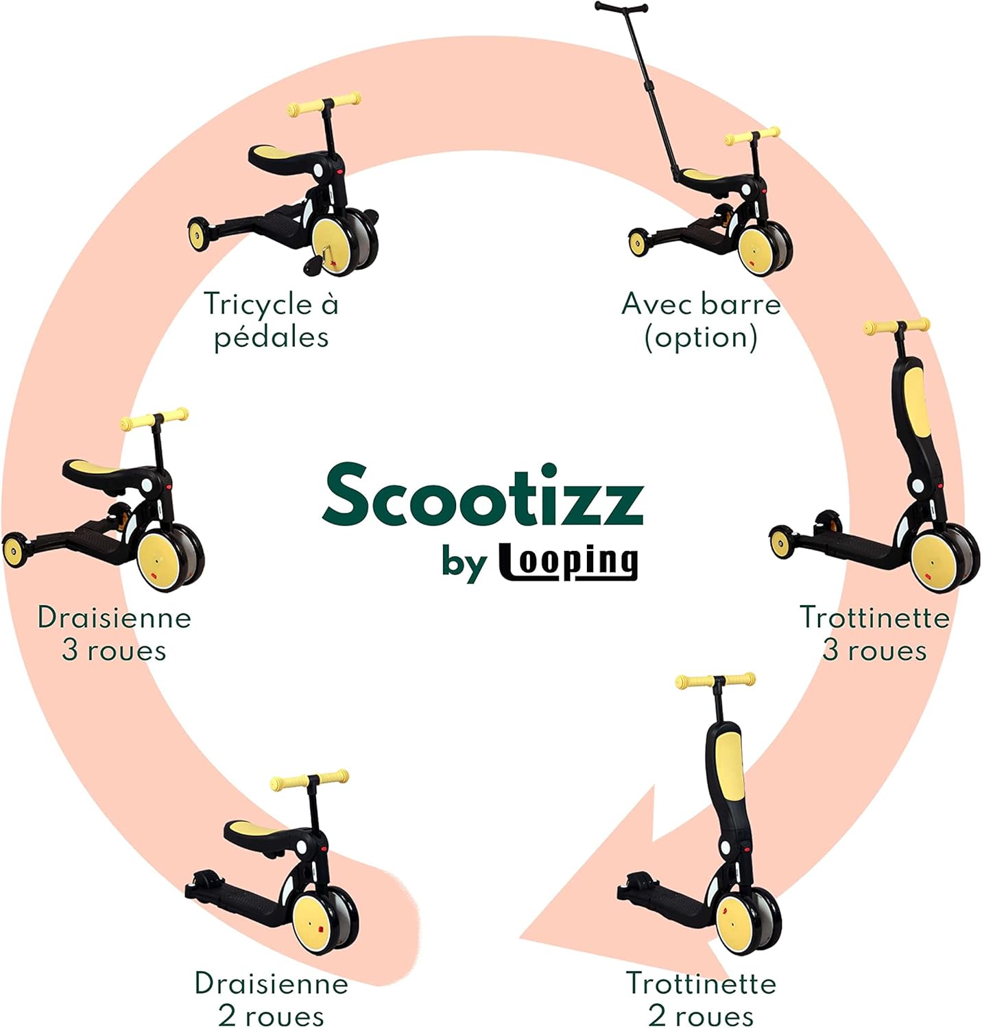 AVANZATA 5 IN 1: la bici senza pedali Scootizz Looping si trasforma in bici senza pedali a 3 o 2 ruote, triciclo, monopattino a 3 o 2 ruote, per accompagnare i bambini da 1 a 6 anni fino a 50 kg. COMFORT E SICUREZZA: barra di spinta direzionale e sistema di bloccasterzo per guidare o lasciare libero il bambino. Ideale come bici senza pedali per bambini di 1 anno o bici senza pedali per bambini di 2 anni. MASSIMA PRATICITÀ: pedali removibili riposti sotto il sedile, manubrio removibile e cambio rapido da senza pedali a monopattino senza attrezzi. Una bici senza pedali scalabile progettata per un facile utilizzo. RESISTENTE E DUREVOLE: ruote in plastica TPU di alta qualità, cuscinetti a sfera e struttura robusta. Questo monopattino per bambini supporta fino a 50 kg per anni di utilizzo. PRODOTTO VALIDATO: lo Scootizz è stato presentato nello spettacolo Les Maternelles e adottato da migliaia di genitori. Uno scooter scalabile 3 in 1 esclusivo, sicuro ed ergonomico.
