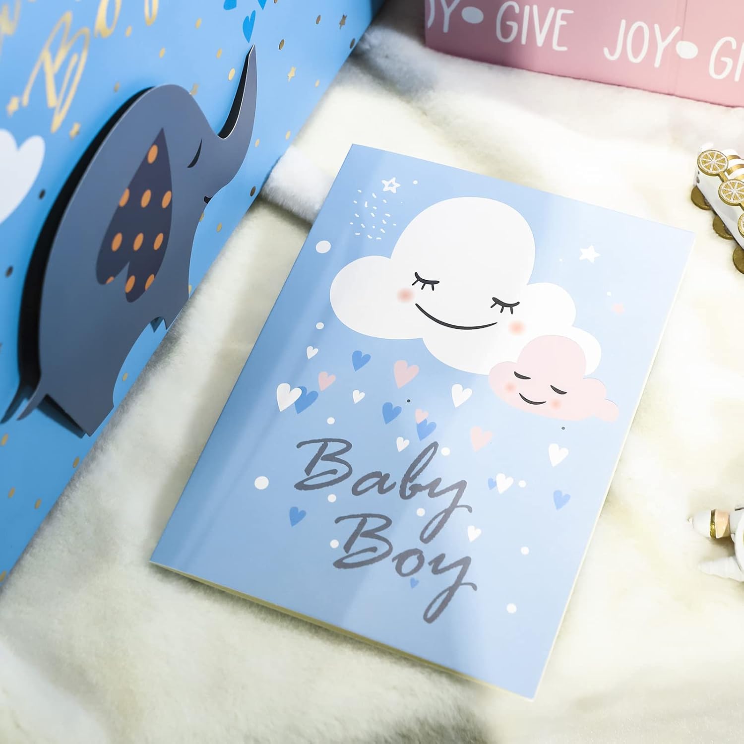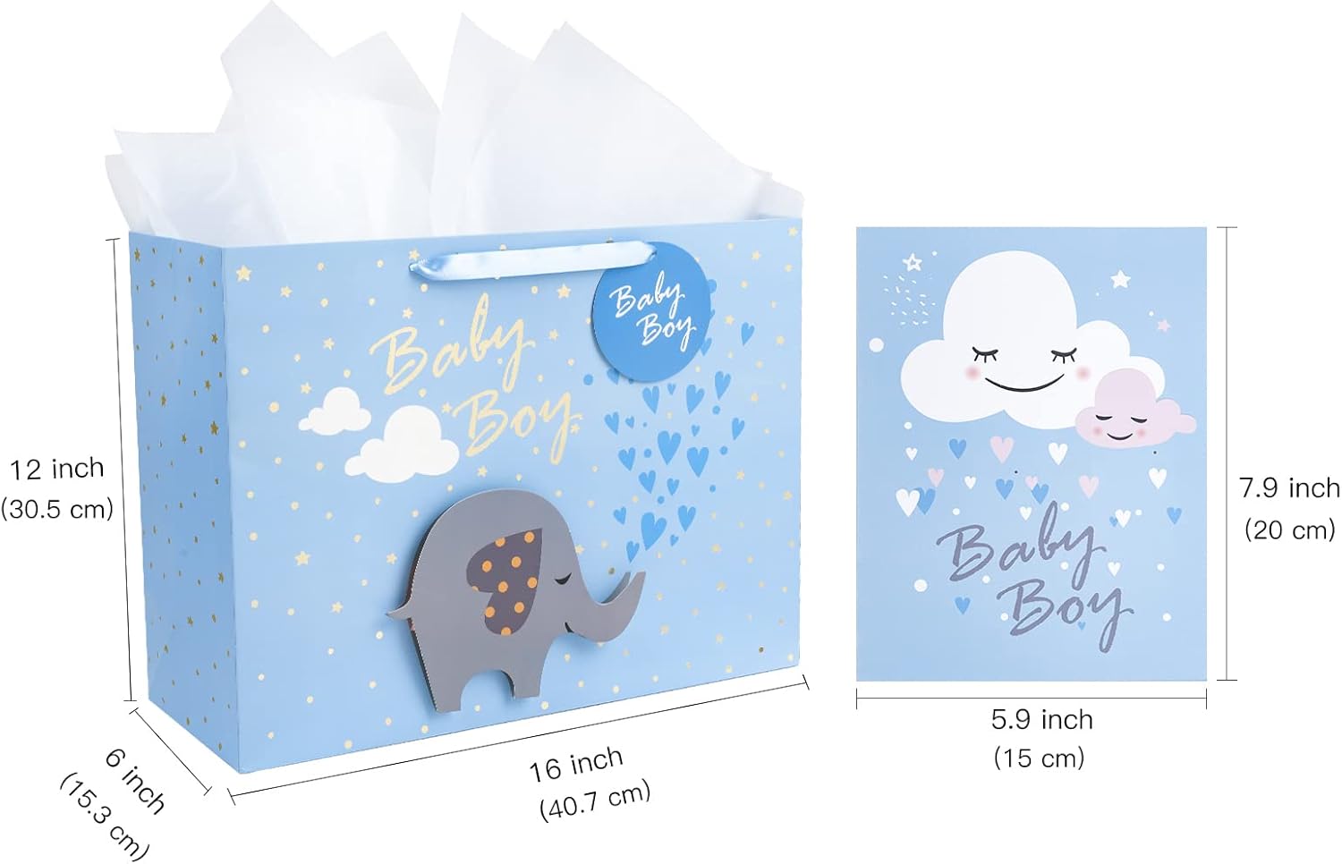 PACCHETTO CONVENIENTE: Include 1 sacchetto regalo grande, due fogli di carta velina bianca e 1 biglietto con busta, perfetto per il baby shower. DESIGN DA BAMBINO: questa grande borsa regalo celebrativa celeste presenta un elefante con produzione 3D. Carta velina bianca, manico in nastro blu, biglietto di auguri di compleanno con design per neonato e etichette regalo di design completano il pacchetto. Dimensioni: il sacchetto regalo grande misura 16" x 12" x 6", il biglietto d'auguri misura 6" x 8" SUPER CONVENIENTE: un'alternativa semplice e veloce alla confezione regalo tradizionale. Ottimo per compleanni, lauree, addio al nubilato e per neonati e vacanze! Crea i migliori ricordi per i tuoi amici. ACQUISTA ORA SENZA RISCHI: per qualsiasi motivo, se non ti piacciono necessariamente i nostri sacchetti regalo, rispediscili semplicemente e ti rimborseremo ogni centesimo (o li sostituiremo se c'è un problema).