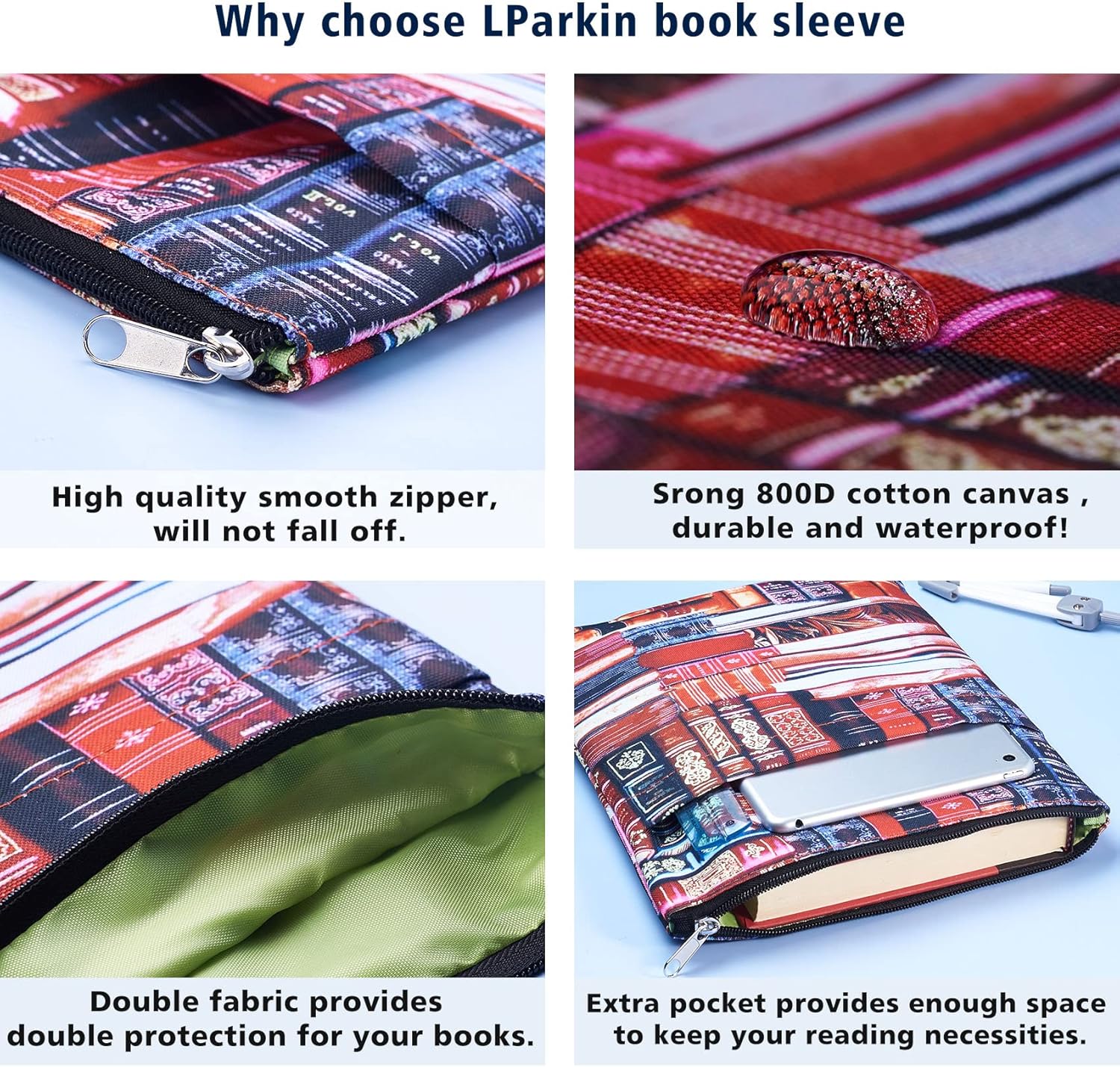 【PROTEZIONE DEL LIBRO】 Se ti piace mettere il tuo libro più recente o preferito nella borsa mentre esci, potresti essere deluso nel trovare il tuo libro un po' piegato o rotto lungo la strada. Questa custodia per libri può proteggere i tuoi libri preferiti in movimento, senza più danni nella borsa. 【DIMENSIONI DEL PRODOTTO】 Questa custodia del libro è misurata approssimativamente ESTERNO: 11 x 8,5 pollici (28 x 21,5 cm); INTERNO: 10 x7. 5inch (25.5x19cm) e si adatta alla maggior parte dei libri auto pubblicati, paperbacks standard, paperbacks di massa e hardcover regolari. Assicurarsi di misurare il vostro articolo prima di acquistare per assicurarsi che funzionerà per voi. 【CHIUSURA CON CERNIERA】 La custodia del libro si chiude con una cerniera che tiene saldamente il libro all'interno, non preoccuparti che i libri cadano. 【TASCA ESTERNA】 La tasca sulla manica esterna (8,5 "X8") ti consente di avere i tuoi accessori, come un e-reader, una penna o un taccuino o anche alcuni libri più piccoli! È così conveniente. 【MATERIALE】 Realizzato con tela di cotone/materiale poliestere, interfacciato anche all'interno per dare maggiore resistenza. Può essere lavato quando si sporca. Sottile e leggero, non ingombra il tuo libro e può essere facilmente inserito nella borsa.