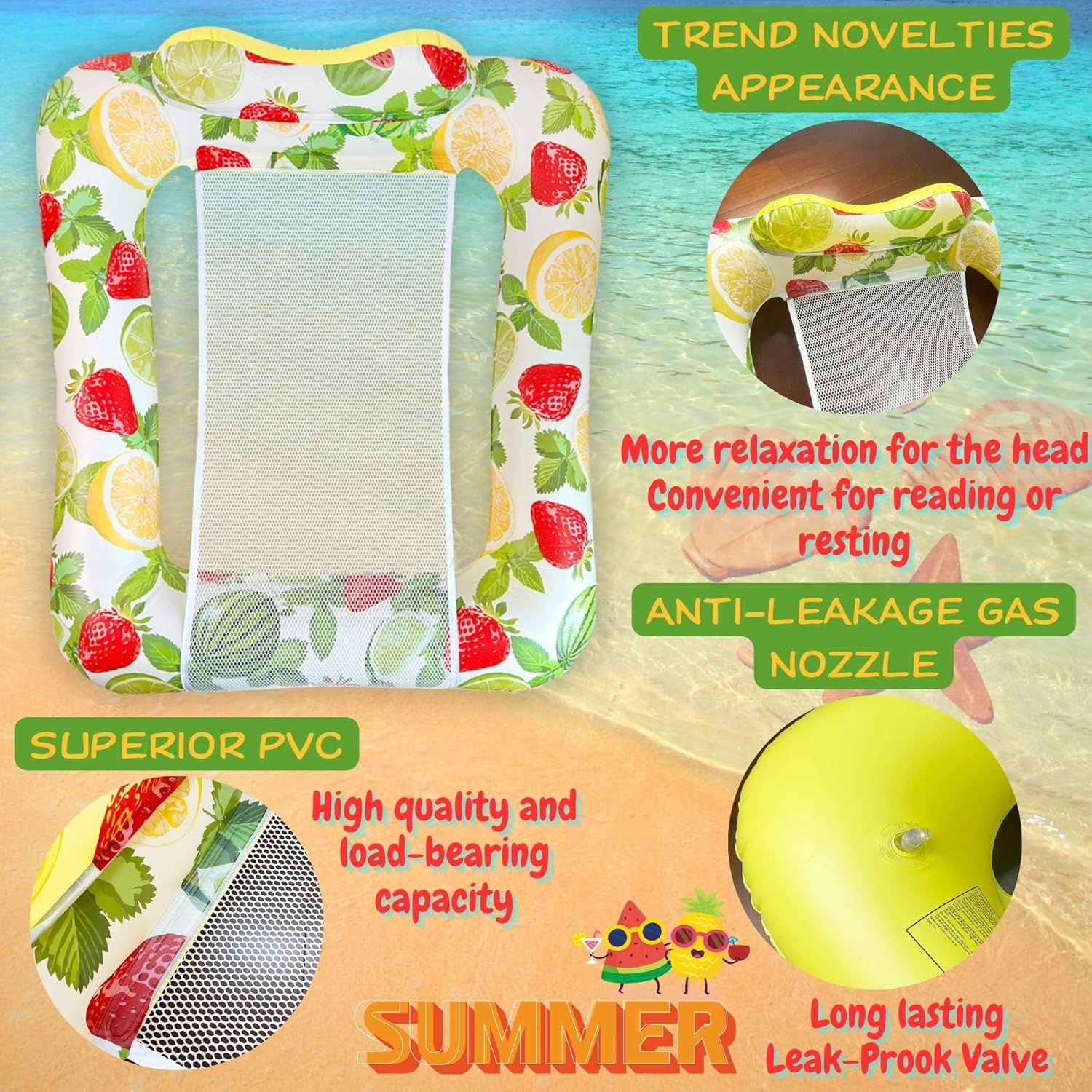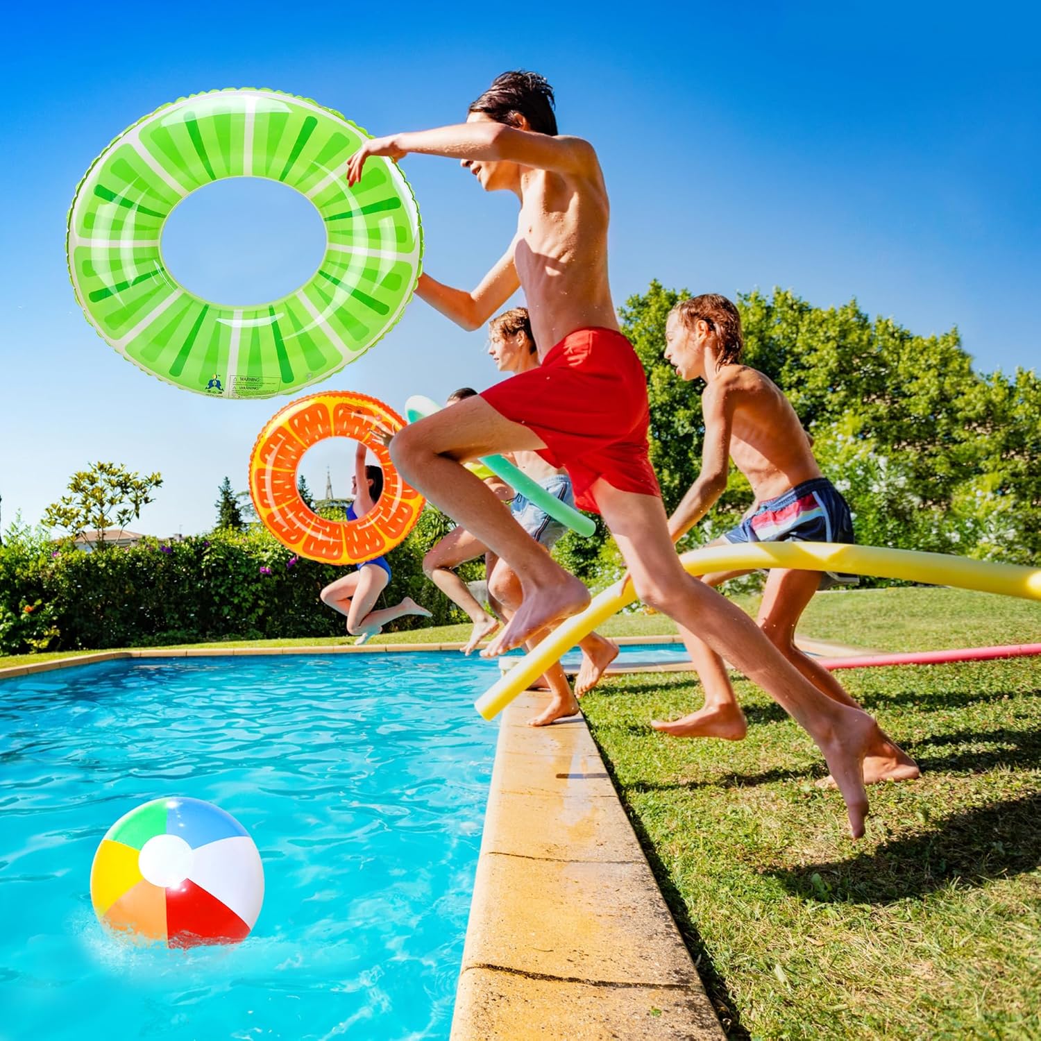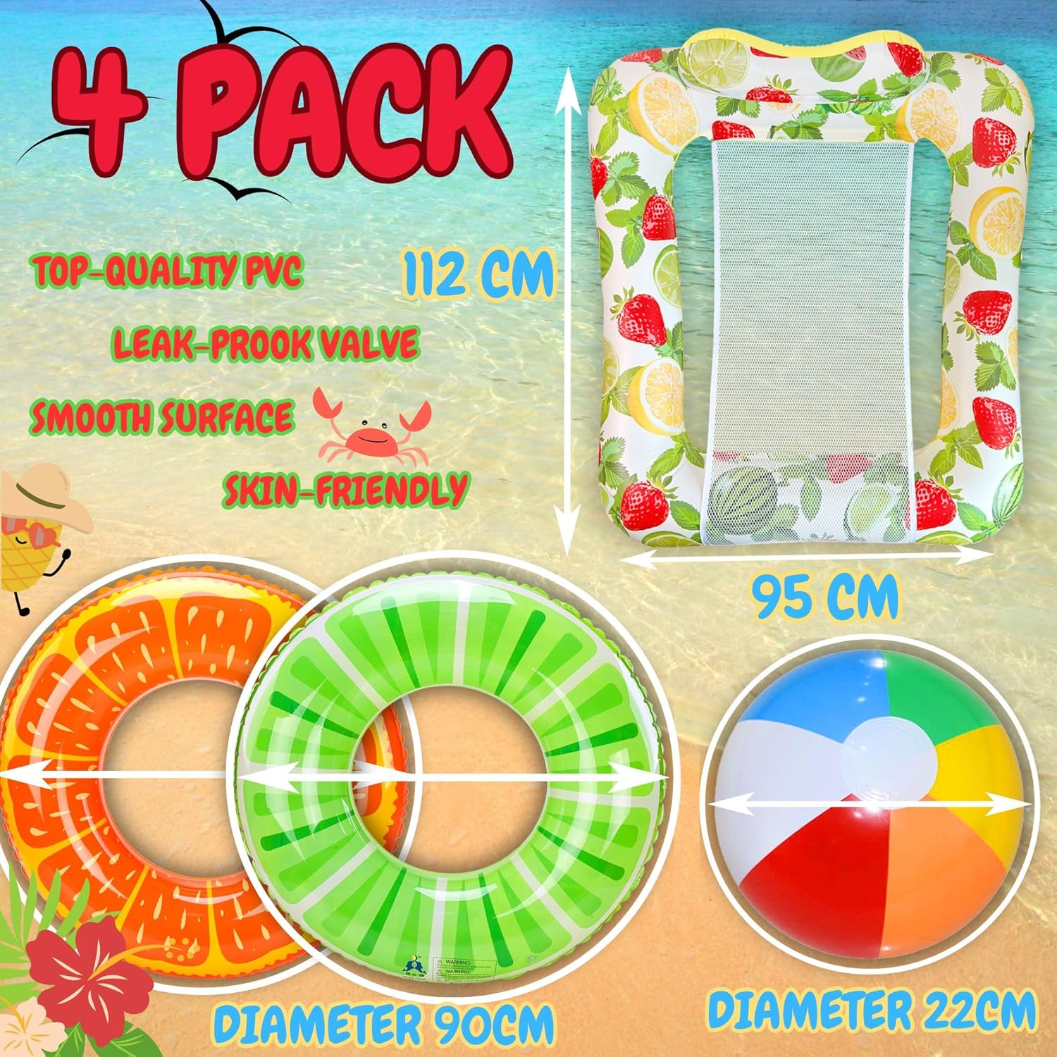 【Set gonfiabile estivo】 Questo set comprende due anelli da nuoto, un pallone da spiaggia, una composizione di amache; diversi stili permettono di godersi di più l'estate. 【Materiale di alta qualità e di prima scelta】 Realizzato in materiale pvc resistente ed ecologico, inodore, spesso, durevole, resistente ai graffi, con un'eccellente resistenza alla pressione e agli strappi. Superficie liscia ed elastica, inodore e delicata per la pelle dei bambini, in grado di resistere facilmente al galleggiamento in acqua e di praticare attività acquatiche. Le cuciture interne sono accuratamente progettate per evitare perdite d'acqua e d'aria. 【Design unico】 Amaca estiva, facile e piacevole per godersi l'estate, per farli divertire di più nuotando in piscina. Nel frattempo, l'anello di nuoto è colorato e molto visibile in acqua, il che rende facile osservare il nuoto del bambino in qualsiasi momento, rendendo il nuoto più sicuro e aggiungendo più divertimento alle vostre attività acquatiche. 【Giochi d'acqua felici】 Gli anelli da nuoto gonfiabili sono ideali per piscine, spiagge, laghi, feste, raduni e divertimenti acquatici. Galleggianti perfetti per la piscina, decorazioni per feste, puoi rilassarti e goderti le attività acquatiche con la tua famiglia e i tuoi amici nella calda estate, goditi l'estate! 【Regalo estivo perfetto】 Perfetto per i bambini per imparare a nuotare e giocare in acqua in estate. Si può usare in piscina o in spiaggia. Il pratico anello da nuoto per bambini stimolerà l'apprendimento e lo sviluppo precoce e farà amare il nuoto al bambino, un grande regalo estivo per bambini e amici. ATTENZIONE: durante il gonfiaggio, tenere lontano da fonti di calore, fuoco e oggetti appuntiti.