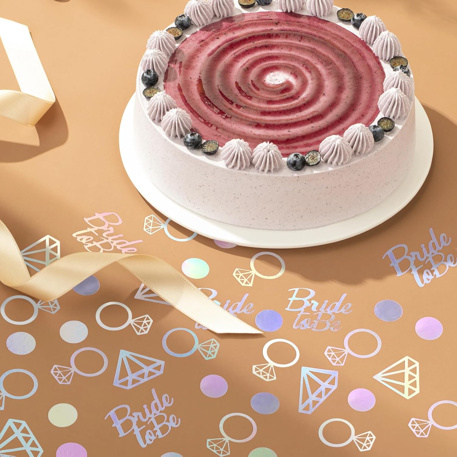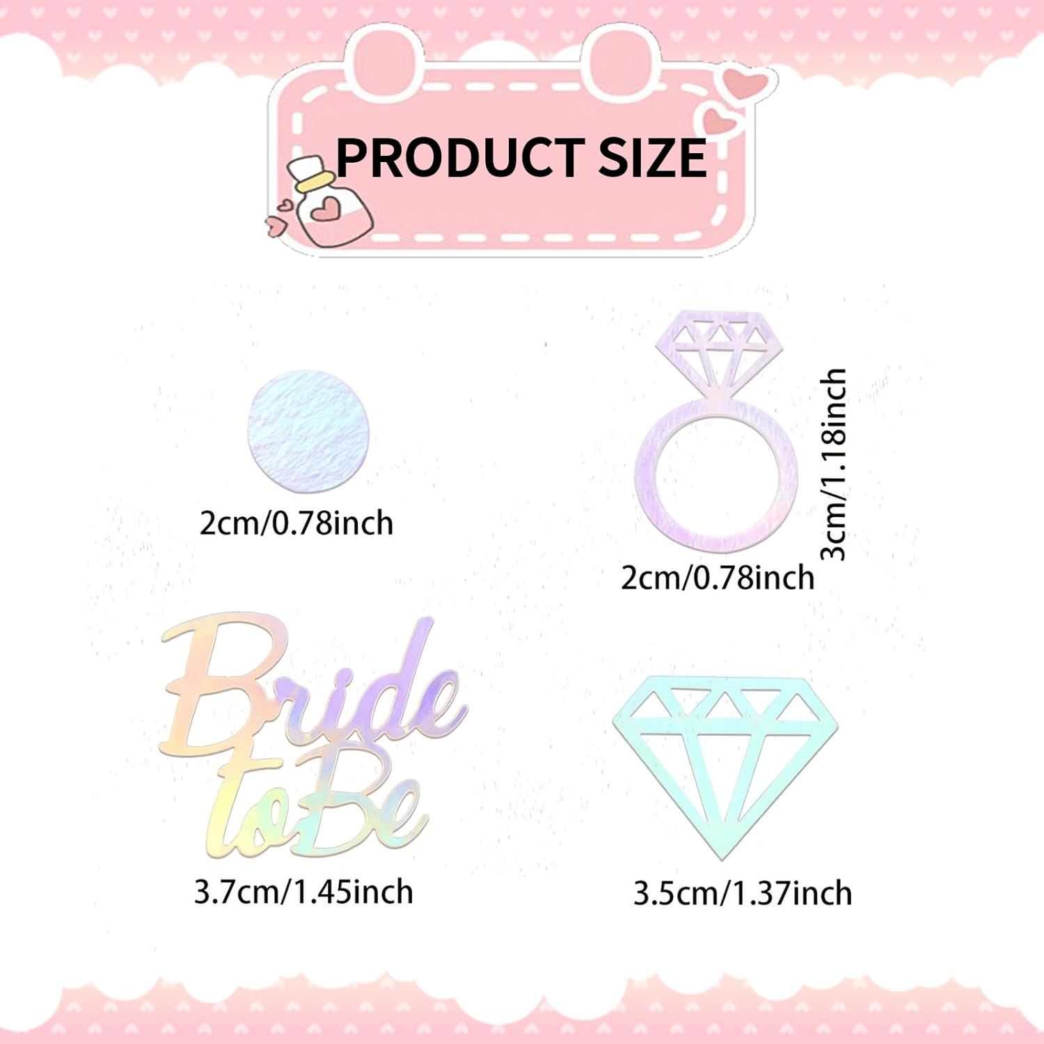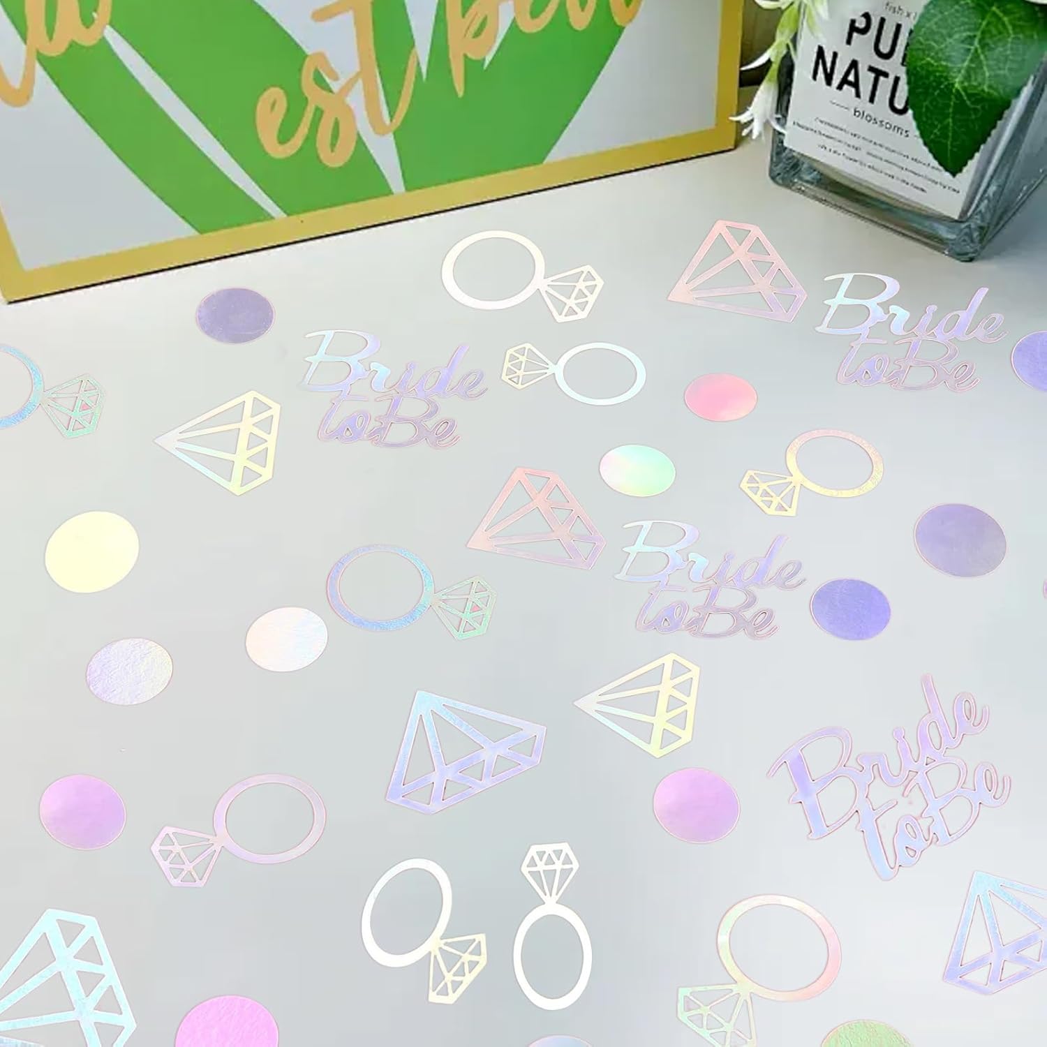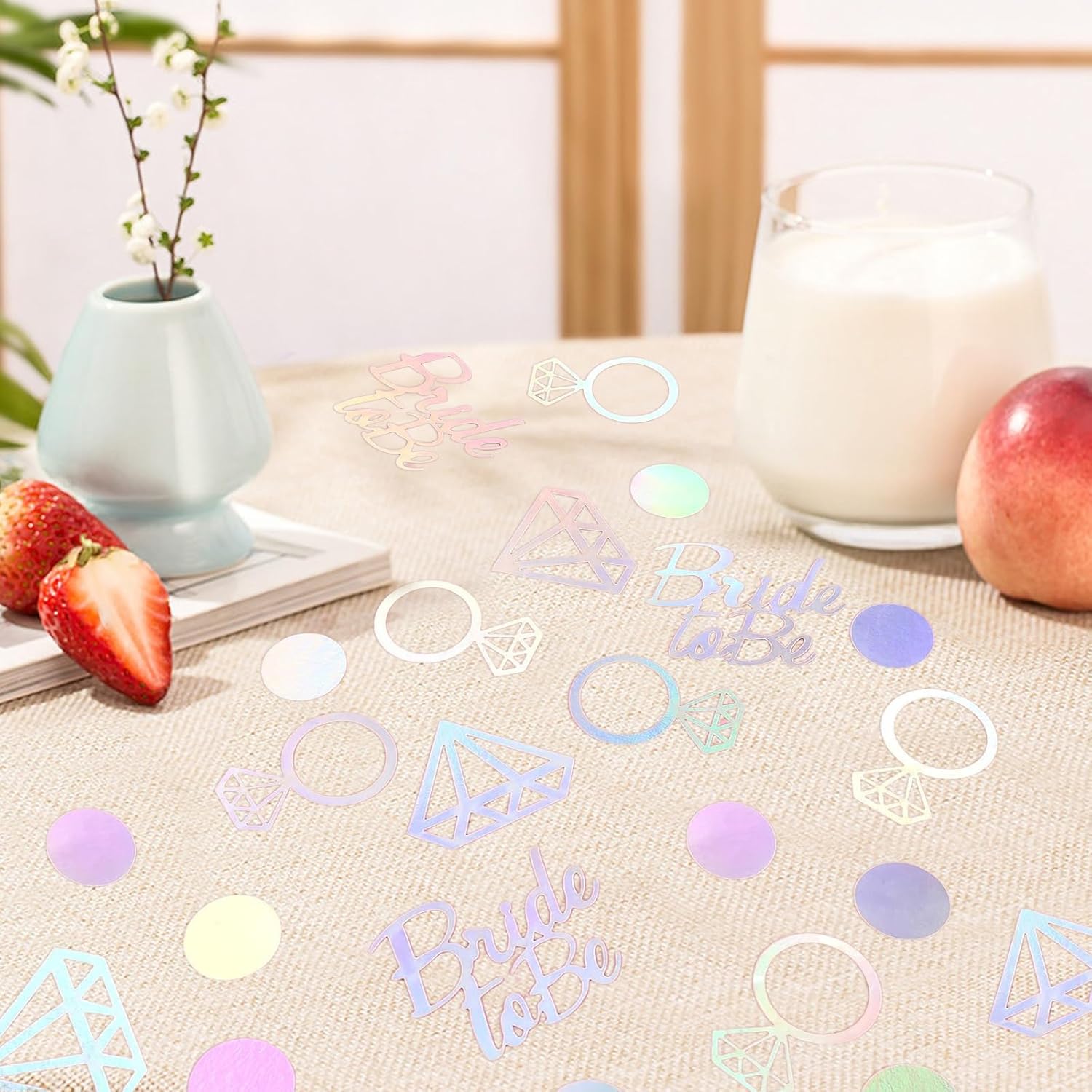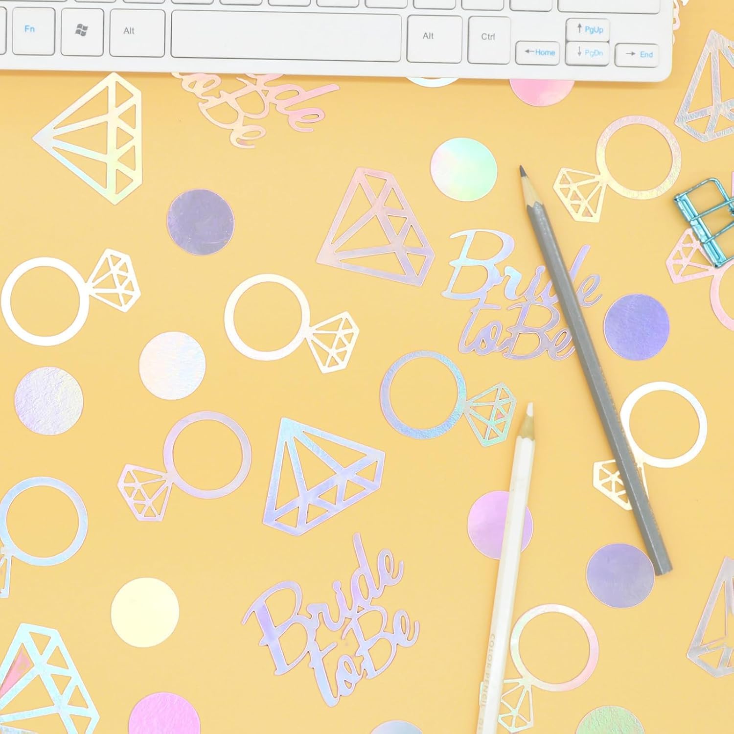 Lucente confetti con motivi nuziali: La carta iridescente mostra incantevoli motivi come 'Bride to be', diamante, anello e punti, perfetti per feste di addio al nubilato, fidanzamento e feste pre-matrimonio Versatile per vari eventi: Che sia una festa di fidanzamento, addio al nubilato o festa pre-matrimonio, il colorato confetti dona un look elegante e festoso a ogni evento Facile decorazione per tavoli: Le forme stilose dei confetti si distribuiscono facilmente sui tavoli per creare un'impressionante estetica che incanta gli ospiti – perfetto per matrimoni e feste Materiale di alta qualità in carta lucente: Realizzato con carta iridescente robusta, il confetti è leggero, durevole e ideale per una decorazione attraente e di lunga durata Set da 150 pezzi per una copertura generosa: Il set comprende 150 pezzi di confetti, ideale per decorazioni di tavoli, sacchetti regalo o progetti fai-da-te – un must per ogni festa pre-matrimonio