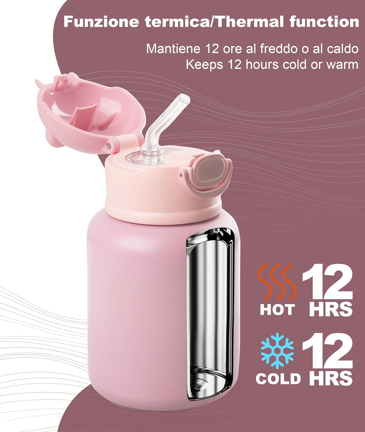 【CAPACITÀ 500ML PER BAMBINI】Borraccia termica con cannuccia da 500 ml (17 once),comprende due tipi di coperchio (cannuccia e tazza). Le Misure Si Adattano Alla Maggior Parte Dei Portabicchieri E Alle Portabottiglie Della Bici e tasche zaini Grande capacità ideale per borraccia asilo bambina, scuola elementare e sport. 【SICUREZZA IN ACCIAIO INOX 316】Realizzata in acciaio inox 316 di grado alimentare, eco-compatibile e resistente a urti/ruggine. 100% senza BPA, ftalati e tossine - preserva il sapore originale senza retrogusto metallico. 【ISOLAMENTO 24H FREDDO/12H CALDO】Borraccia termica bambini mantiene bevande fredde 24 ore e calde 12 ore (test certificati). Perfetta per acqua ghiacciata, cioccolata calda, succhi e tè durante scuola, sport o gite. 【DESIGN COMPATTO MULTIUSO】Borraccia piccola (500ml) ergonomica per mani bambini. Ideale per tutte le stagioni: bevande fredde d'estate e calde d'inverno. Usabile in asilo, escursioni, palestra e viaggi. 【TENUTA STAGNA + ACCESSORI REGALO】Design a prova di perdite con chiusura ermetica (testata capovolta). Include: cinturino regolabile, copritazza, adesivi animali + 4accessori in silicone (regalo sorpresa!). Borraccia per bambini con cannuccia perfetta per scuola.