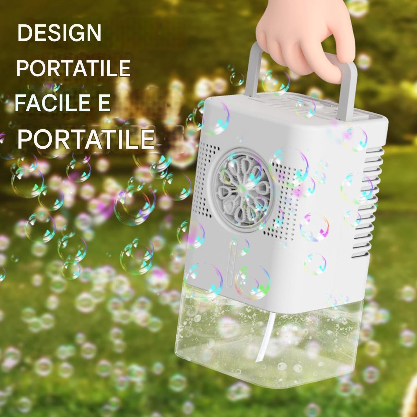 Fascino Bolle da Viaggio: La costruzione robusta supporta le esigenze di intrattenimento outdoor, il design portatile offre massima comodità, ideale per vari ambienti con mobilità garantita in ogni momento Designo Impermeabile: Tecnologia di tenuta ottimizzata previene fuoriuscite, con serbatoio capiente da 400ml per performance ininterrotta e divertimento duraturo Funzionamento Affidabile: Tecnologia avanzata flusso d'aria e presa d'aria grande diametro assicurano produzione ininterrotta e formazione bolle coerente per divertimento di durata prolungata Bolle Abbondanti: Generazione densa di bolle per divertimento immediato e atmosfera vivace, configurazione rapida con comando a singolo pulsante per attivazione istantanea senza preparazione complessa Funzione colori automatica: Progettato con modulo LED interno, assicura un'illuminazione dinamica attraverso variazioni cromatiche automatiche, amplifica l'impatto visivo e consente operazione semplice con pressione del pulsante