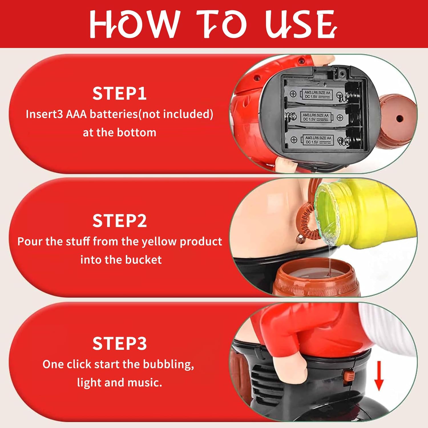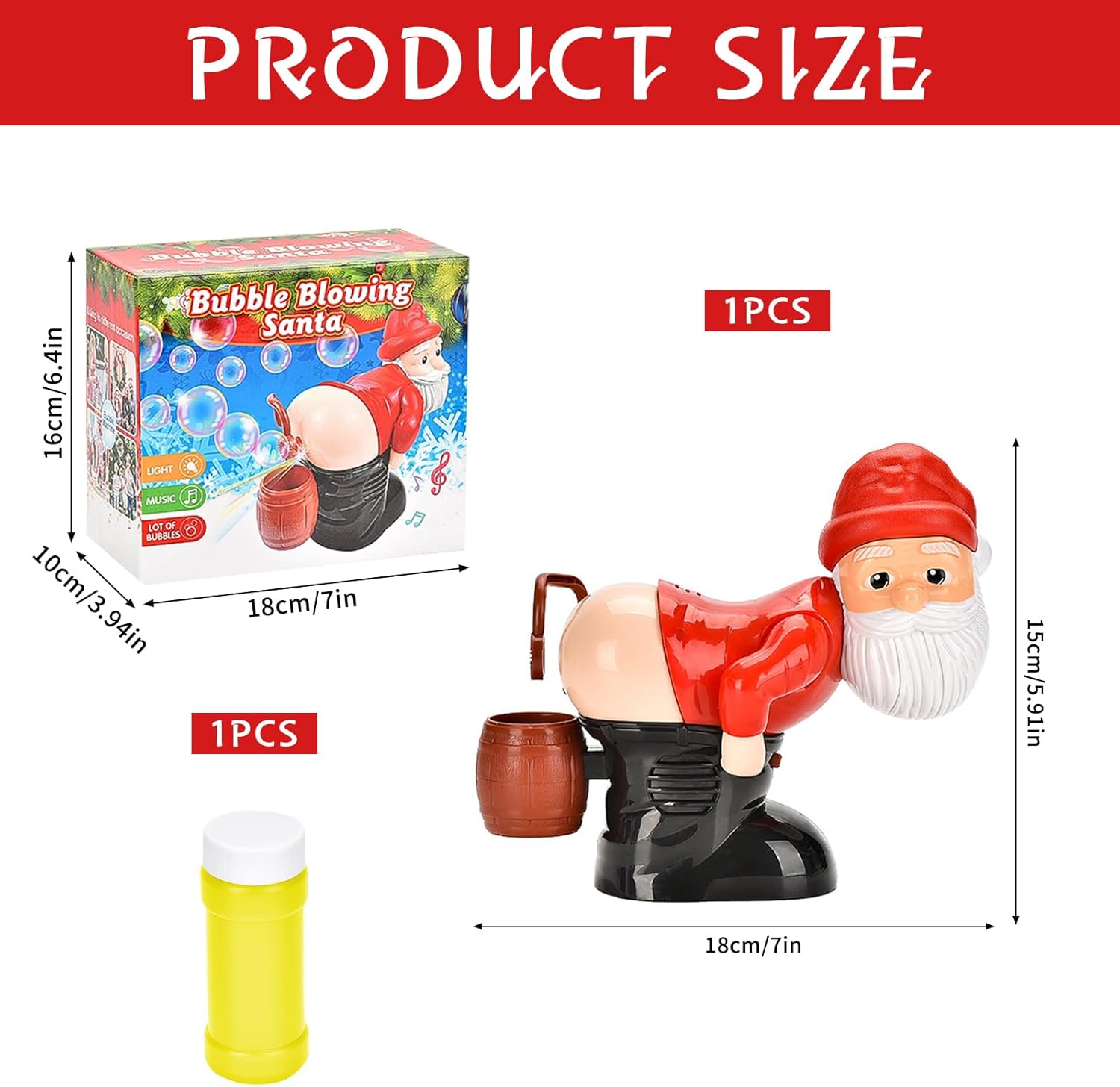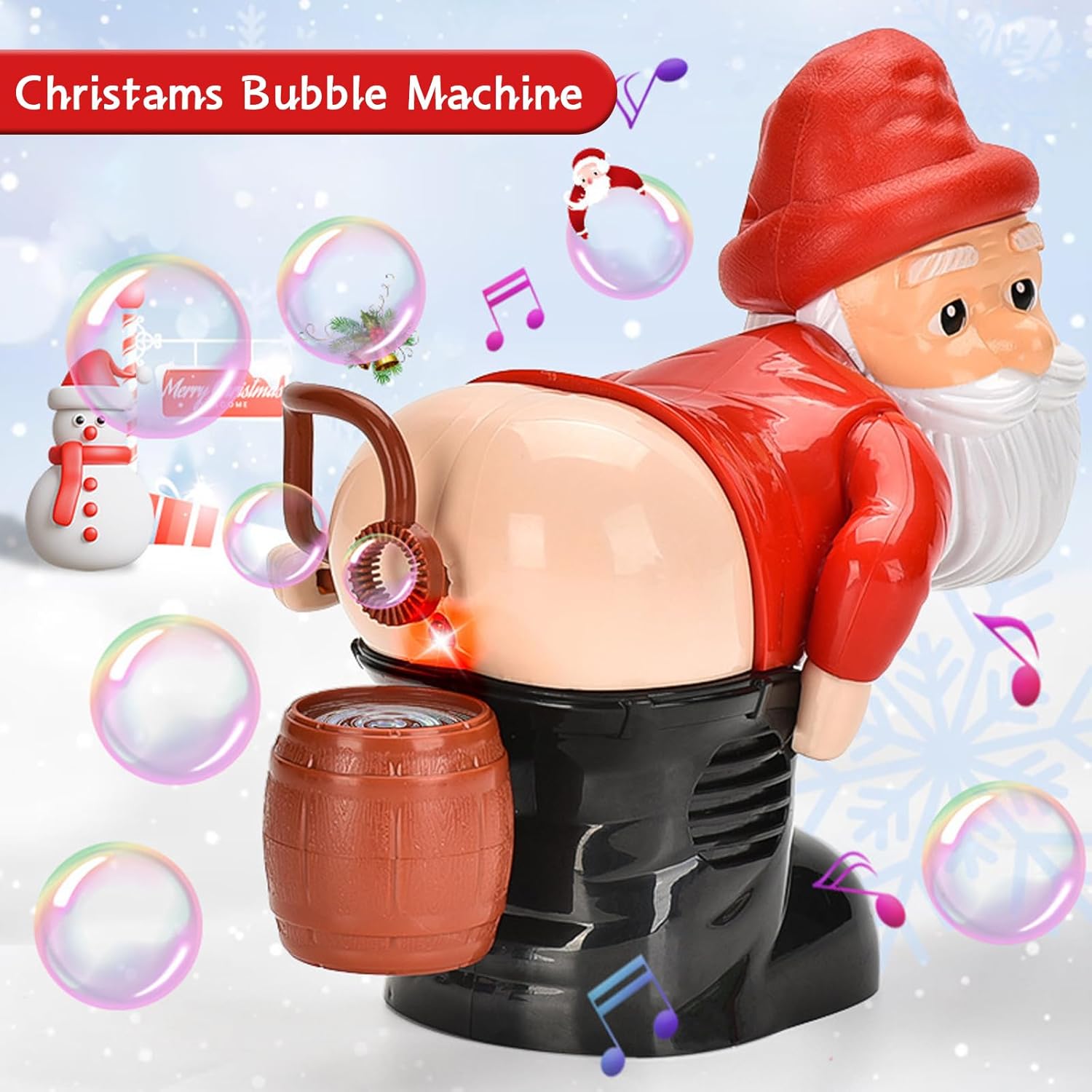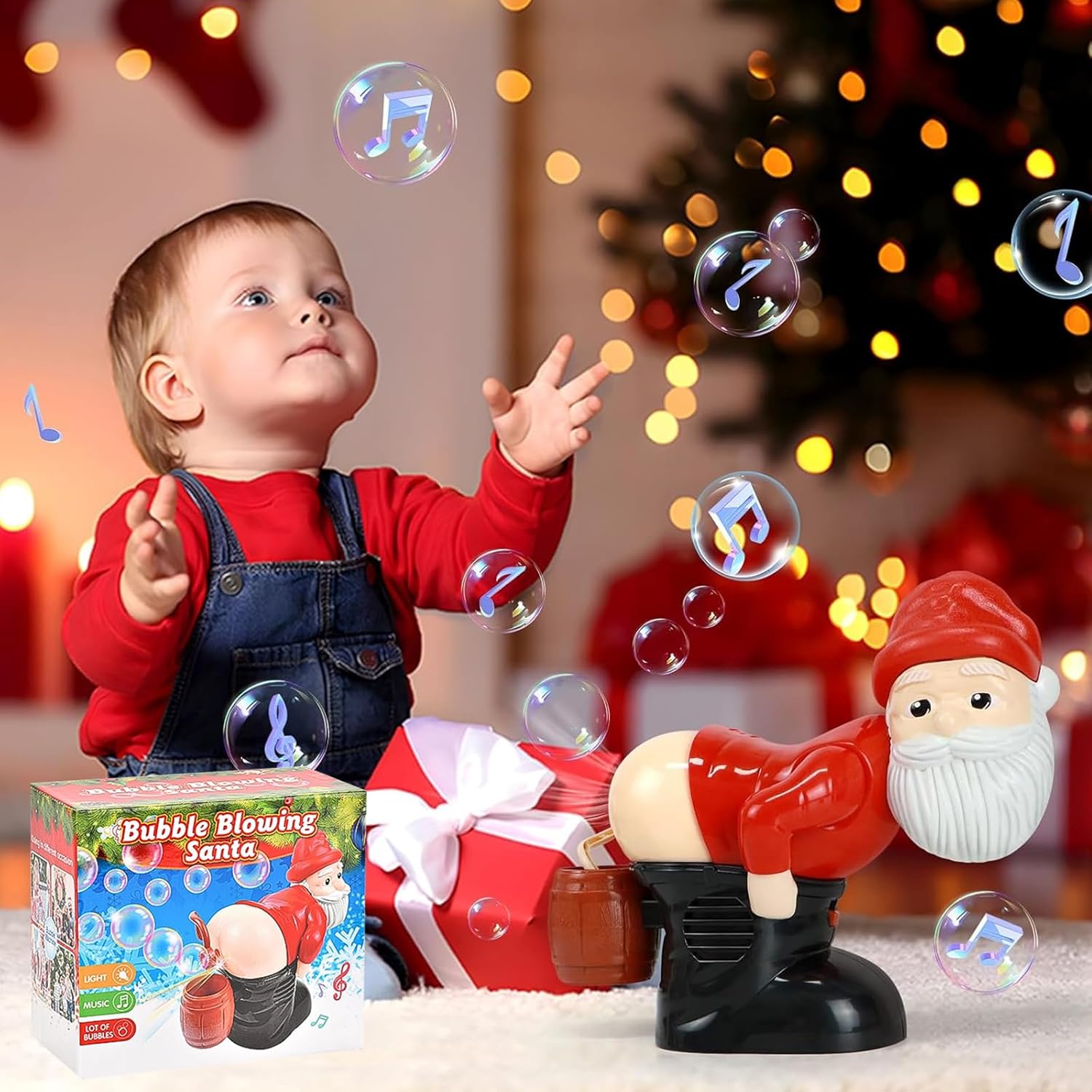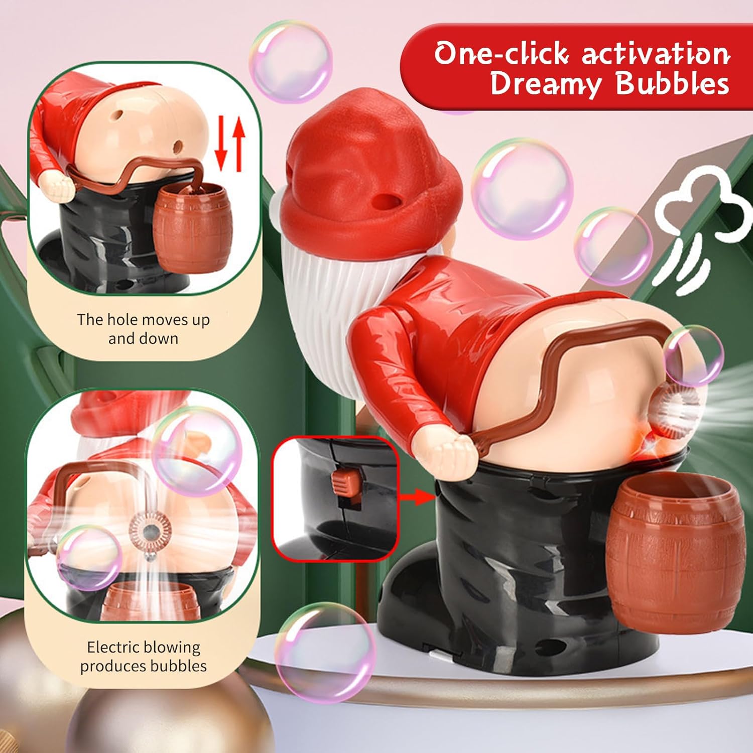 Soffiatore di Bolle di Sapone a forma di Babbo Natale: esalta lo spirito natalizio con il nostro soffiatore di bolle di sapone a forma di Babbo Natale. Quando si schiaccia la bolla, emette suoni di scoreggia e riproduce anche un'allegra musica natalizia mentre soffia bolle per creare un'atmosfera gioiosa. La macchina per le bolle presenta un design unico per divertimento e risate senza fine Materiali Della Macchina per le Bolle: il nostro soffiatore di bolle di sapone a forma di Babbo Natale è realizzato in plastica ABS resistente e di alta qualità. L'esterno liscio e arrotondato della macchina per le bolle è privo di spigoli vivi o superfici ruvide che possono graffiare o ferire le mani. Preparati per divertimento e risate senza fine con questo soffiatore di bolle automatico Macchina per le Bolle di Sapone a Forma di Babbo Natale: il divertente design a forma di Babbo Natale che scoreggia, accompagnato da musica, luci e innumerevoli bolle, farà ridere i bambini. È importante notare che questa macchina per le bolle di sapone richiede 3 batterie AA (non incluse) per attivare il movimento del braccio e l'aria che genera le bolle di sapone Macchina Automatica per le Bolle di Sapone a Forma di Babbo Natale: con gli esilaranti effetti sonori della macchina per le bolle di sapone a forma di Babbo Natale, sei sicuro di farti una bella risata. Decorato con l'immagine di un personaggio natalizio, esalta l'atmosfera festosa dei vostri incontri. La macchina per le bolle di sapone di Babbo Natale riproduce un'allegra musica natalizia, aggiunge un tocco di risata stravagante e, naturalmente, emette divertenti suoni di scoregge Regalo per Bambini: progettato per essere versatile, il nostro soffiatore di bolle di sapone di Babbo Natale è il tuo strumento di intrattenimento preferito per riunioni di famiglia, feste e attività festive, creando un'atmosfera frizzante piena di gioia ed entusiasmo. Progettato ingegnosamente per un effetto scherzoso, così tutti possono immergersi nella gioia delle bolle