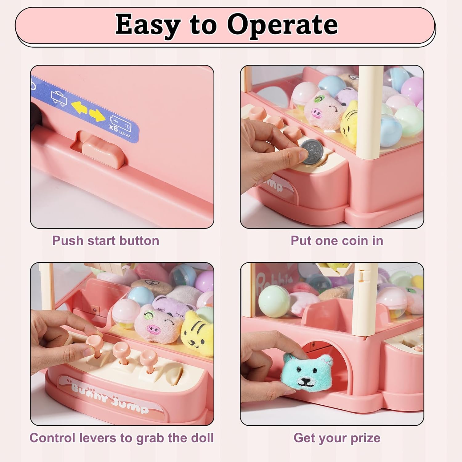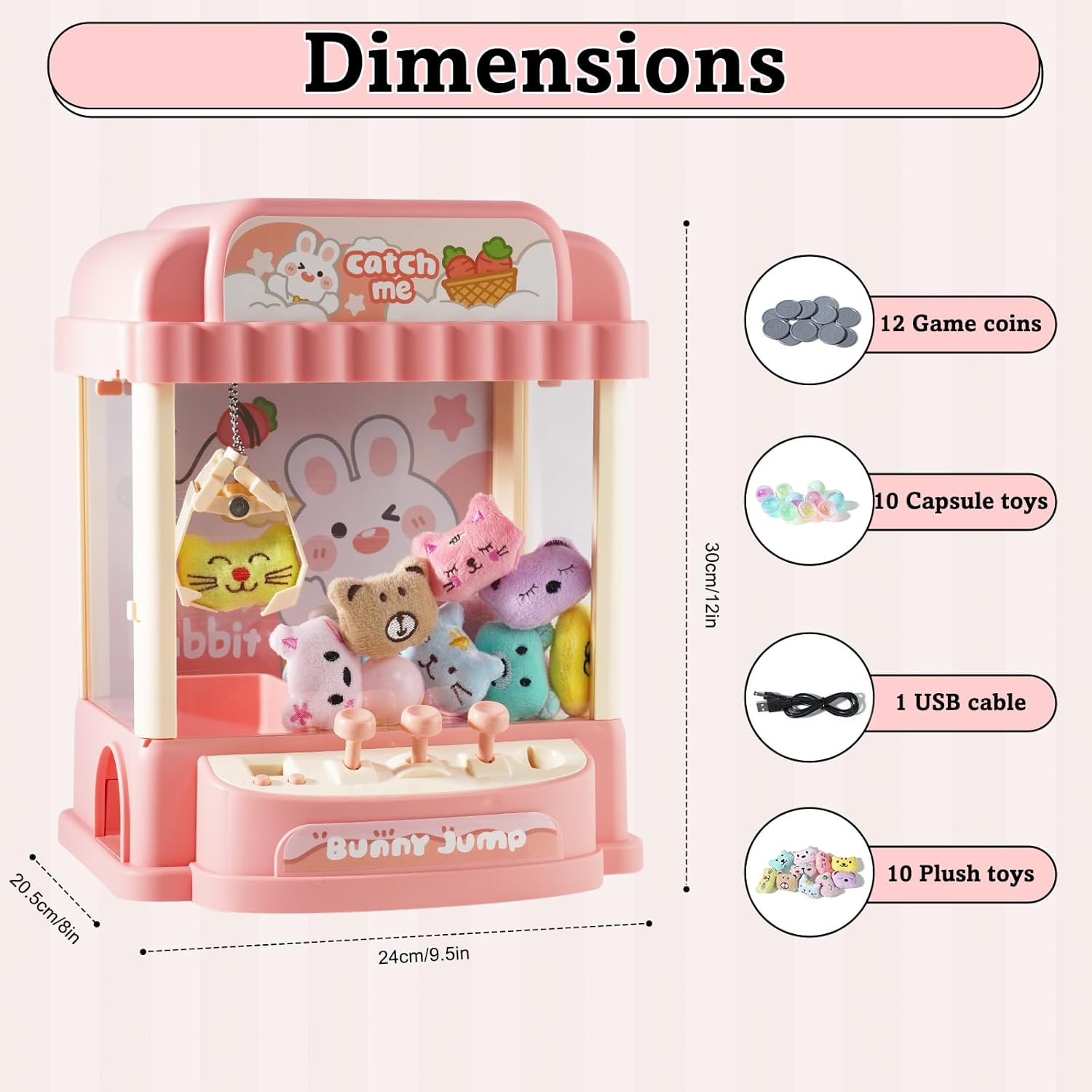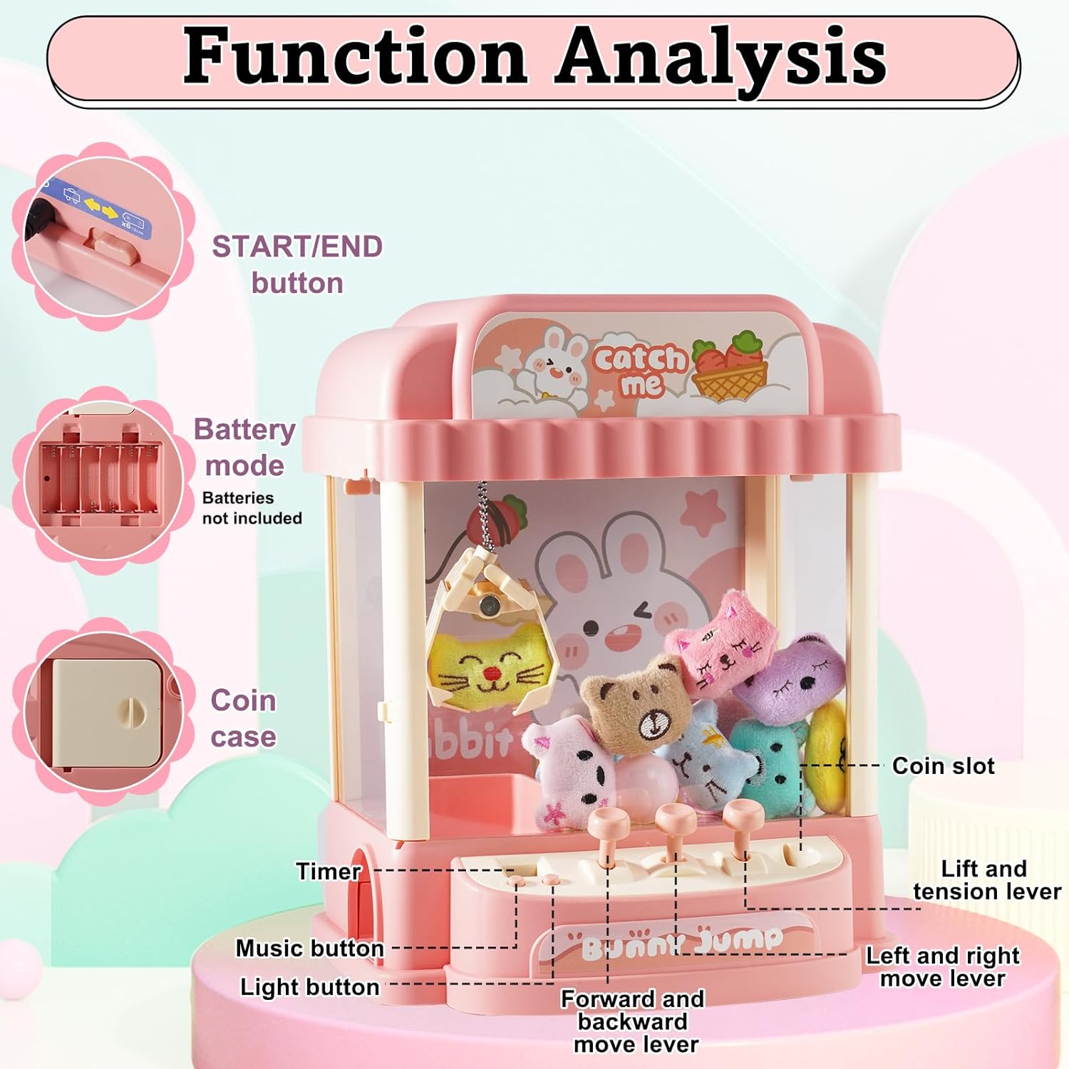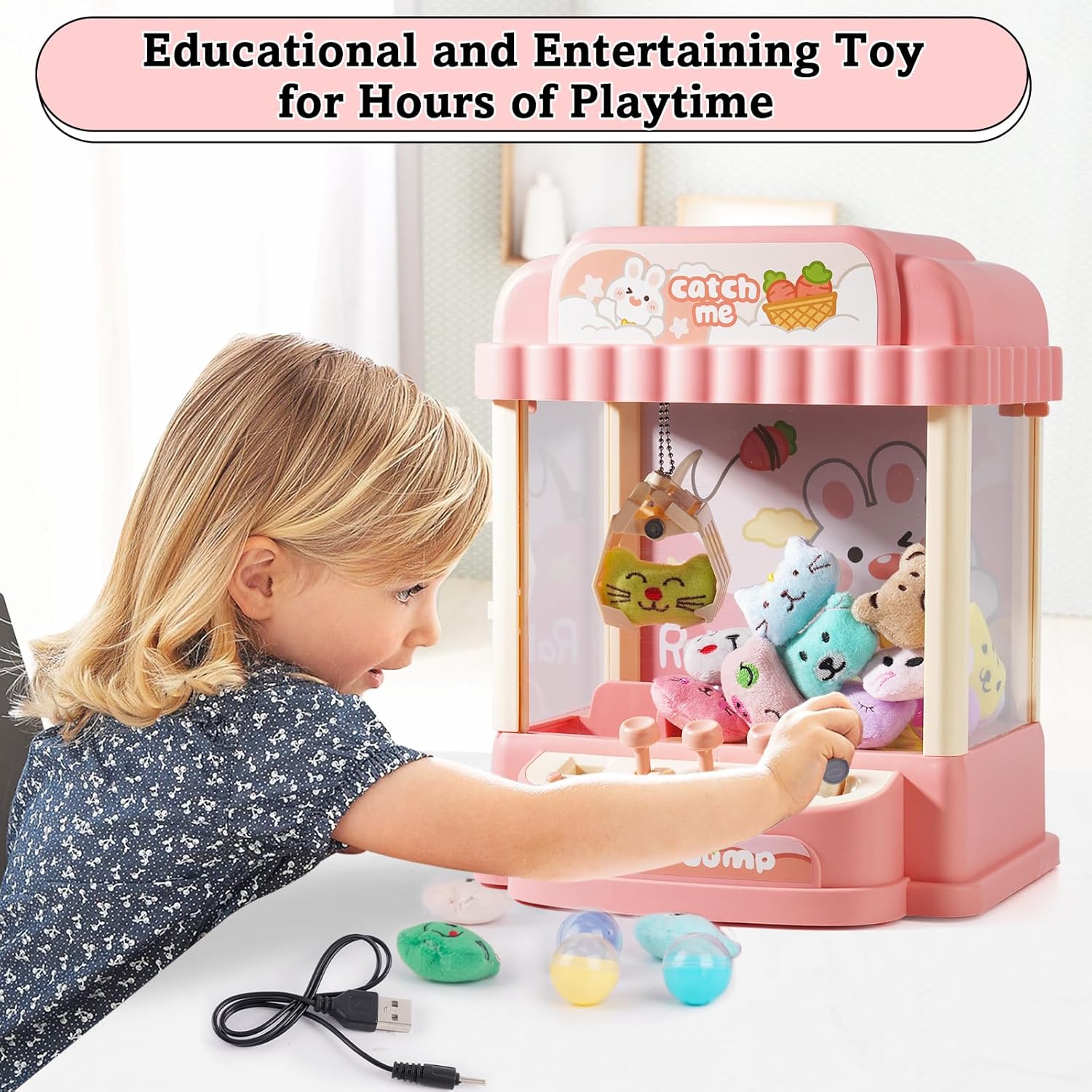 Gameplay emozionante: goditi un divertimento senza fine con questa mini macchina per artigli che include 10 monete, 10 simpatici giocattoli di peluche e 10 capsule a sorpresa, offrendo un'esperienza di gioco emozionante per i bambini. Opzioni di alimentazione versatili: questa macchina offre due modalità di alimentazione, consentendo il funzionamento a batteria (6 batterie AA) in movimento e la ricarica USB per una riproduzione senza problemi a casa. Controllo preciso: con un sistema di controllo a tre punte, i giocatori possono manovrare con precisione il braccio di presa, migliorare le proprie abilità e aumentare le possibilità di vincita. Modalità di tempo flessibili: scegli tra un impegnativo limite di tempo di 60 secondi o una modalità di gioco illimitata per giocare continuamente e goderti la vittoria. Regalo ideale per le ragazze: perfetta da regalare alle ragazze, questa macchina per artigli non solo offre intrattenimento, ma promuove anche la coordinazione occhio-mano, la pazienza e l'interazione sociale, rendendola un regalo prezioso e divertente