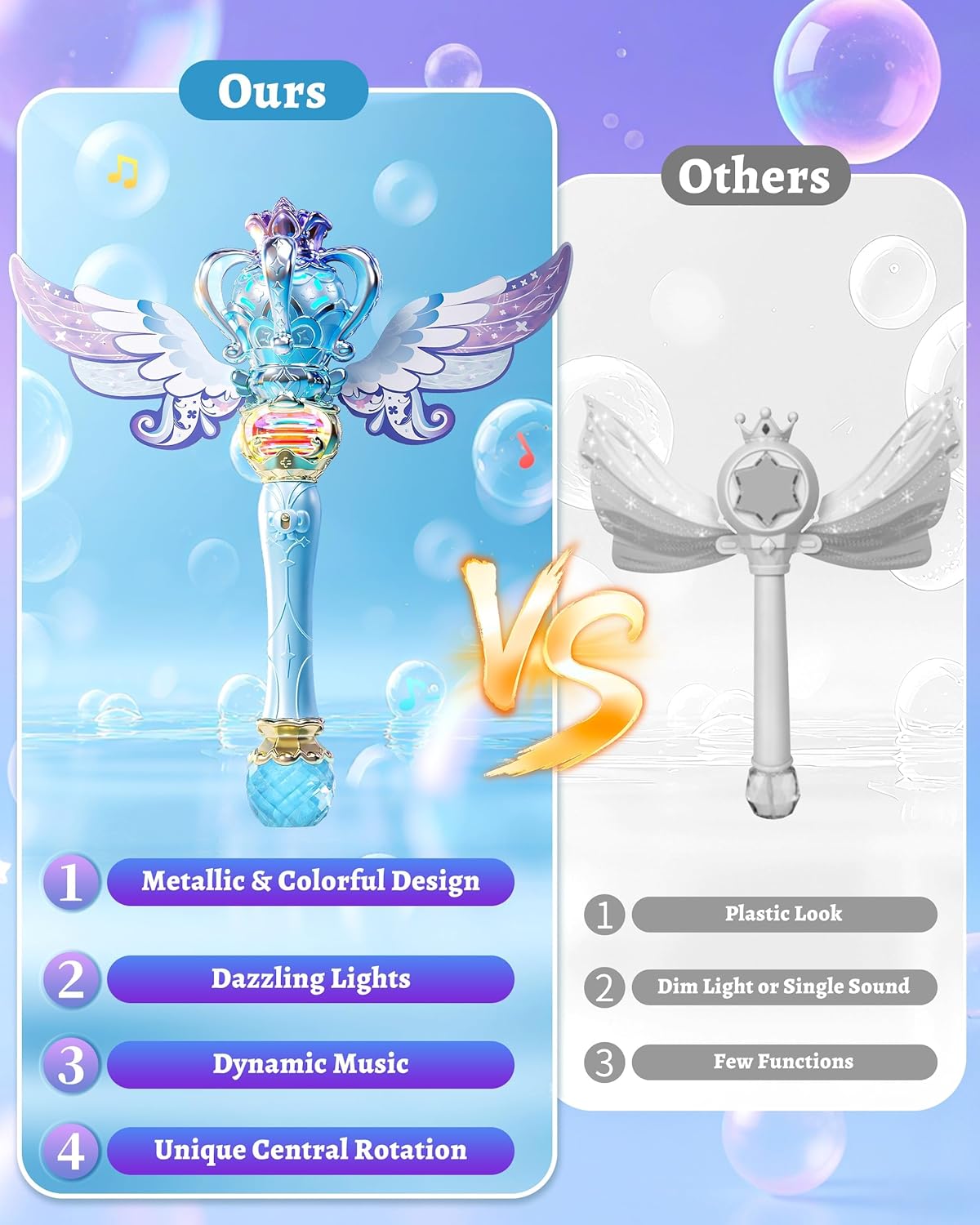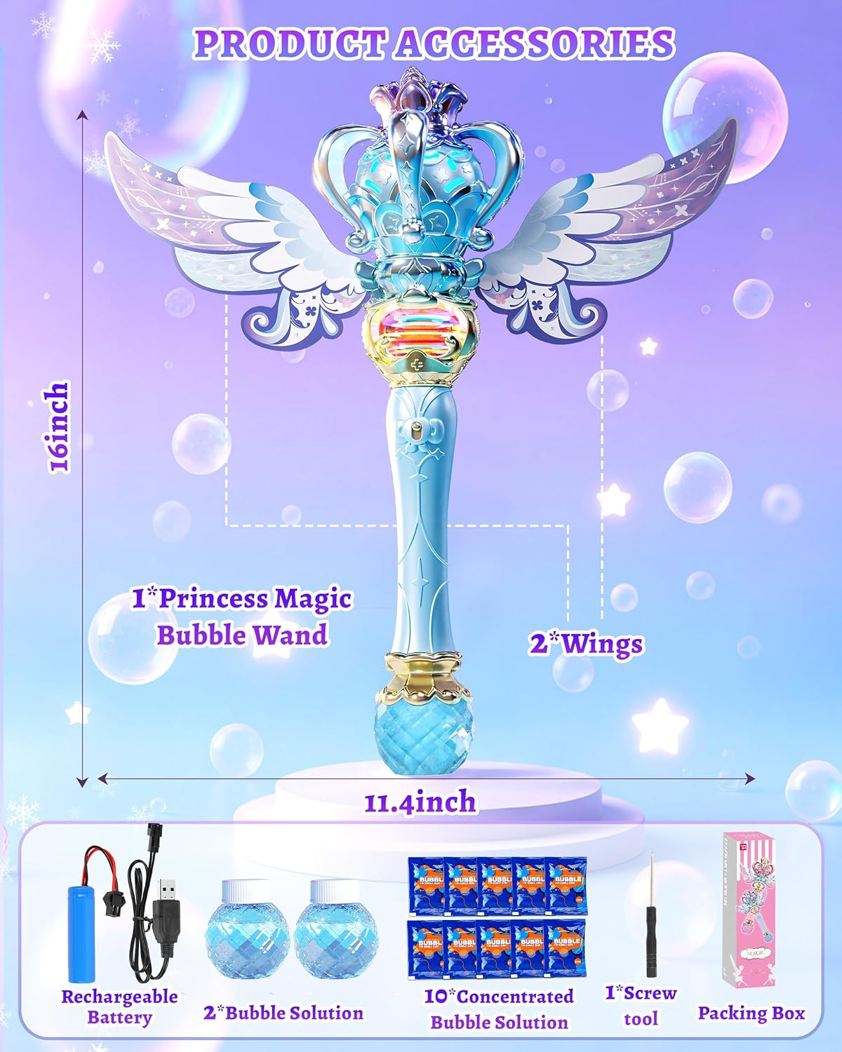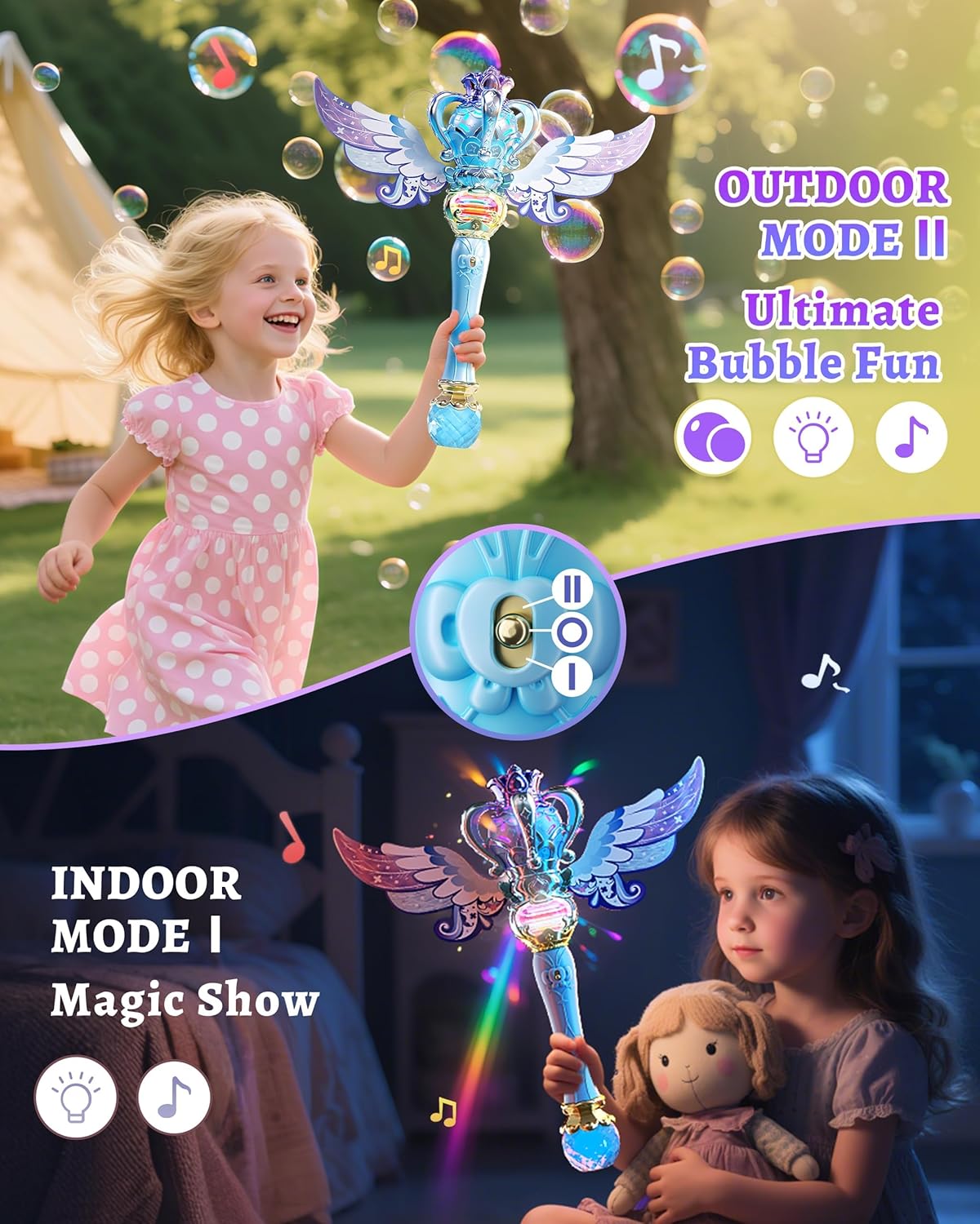 ✨ Aspetto scintillante della principessa: sperimenta lo scintillio! Caratterizzata da un'esclusiva finitura metallica sfumata, una corona delicata e ali da fata rimovibili, la nostra macchina per le bolle non è solo un giocattolo: è un'affascinante bacchetta magica da principessa che accende sogni da favola per ore di gioco fantasioso. "🎵 Raddoppia il divertimento con 2 modalità! Grazie al comodo interruttore: ALTA (magia all'aperto): genera una nuvola di bolle, fa girare il centro della bacchetta, suona melodie allegre e si illumina con luci LED colorate. Ideale per giocare in cortile o in giardino. BASSO (bagliore interno): nessuna bolla, solo rotazione delicata, melodie tranquille e bellissime luci LED. Perfetto per feste, travestimenti o giochi in camera da letto, sicuro e pulito." 🧪 Abbondante fornitura di soluzione per bolle inclusa! Goditi subito un tempo di gioco prolungato! Viene fornito con 2 flaconi di soluzione per bolle + 10 pratiche confezioni di ricarica di soluzione per bolle: molto più divertente delle bacchette standard! 🔒 Sicurezza, sostenibilità ed eco-compatibilità: gioca in tutta tranquillità! Dotato di una batteria ricaricabile integrata (non è necessario acquistare batterie!). La nostra soluzione a bolle è testata per la sicurezza e la bacchetta ha bordi lisci + un design sicuro e a prova di perdite per un gioco sicuro e senza preoccupazioni all'interno e all'esterno. È un giocattolo a bolle ideale per bambini dai 4 agli 8 anni. 🎁 Il regalo incantevole e perfetto: stai cercando un regalo che delizierà? Questo affascinante giocattolo a bolle, con bolle accattivanti, movimento rotatorio, luci e musica, è un regalo ideale per le ragazze dai 3 anni in su per compleanni, vacanze o qualsiasi occasione speciale. Domande? Il nostro amichevole team di supporto è pronto ad aiutarti!