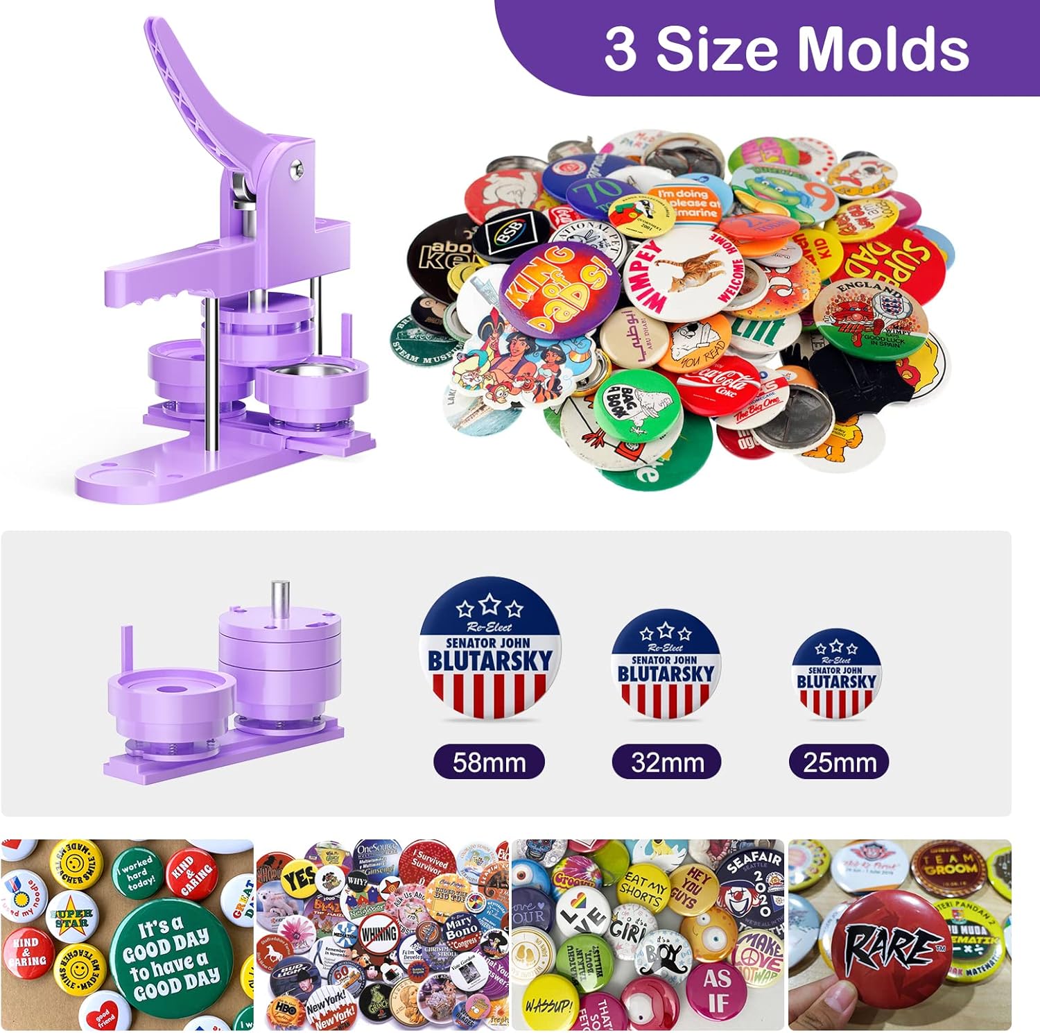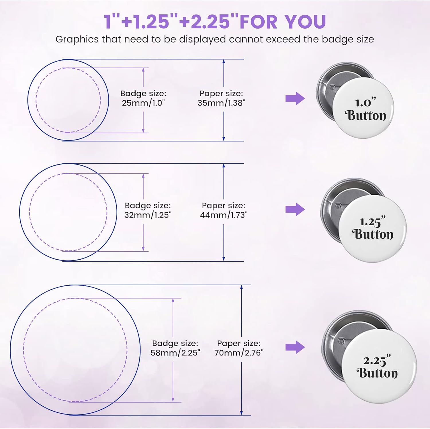 Varie dimensioni: 25 mm, 32 mm, 58 mm. Viene fornito con materiali artigianali completi per 300 bottoni. Nota: per distinguere la forma piccola da quella media, installare la forma sbagliata. Kit da 300 badge per bottoni con spilla: puoi realizzare 300 bottoni in plastica (100 pezzi per ogni dimensione). Il set di imballaggio completo contiene un totale di 300 pulsanti a spillo. Le taglierine circolari incluse ti consentono di creare i tuoi pezzi di carta nella dimensione desiderata. Facile da usare: crea un badge in meno di 15 secondi dopo l'installazione. Si prega di guardare il video o il manuale in dettaglio prima dell'uso. I bottoni inclusi non richiedono una rondella di plastica durante la produzione (solo i bottoni di metallo da 1,25" e 2,25" richiedono una rondella). Ma considerando che gli ospiti acquistano forniture aggiuntive sul mercato, abbiamo incluso rondelle extra da 3,2 cm e 5,7 cm per realizzare badge in metallo. Risparmia tempo ed energia: il produttore di bottoni adotta l'aspetto di plastica tecnica ad alta resistenza, il corpo e lo stampo sono integrati, leggeri e facili da usare. Una matrice rotante dall'alto non solo migliora l'efficienza e la precisione, ma facilita anche un migliore posizionamento. Se installato correttamente, sono necessari meno di 15 secondi per creare un badge. Regalo creativo: spilla personalizzata. Può essere utilizzato per archiviare foto, decorazioni ornamentali, targhette per nomi di nozze, aule ecc. Non vediamo l'ora di ricevere da te vetrine di design più creative!
