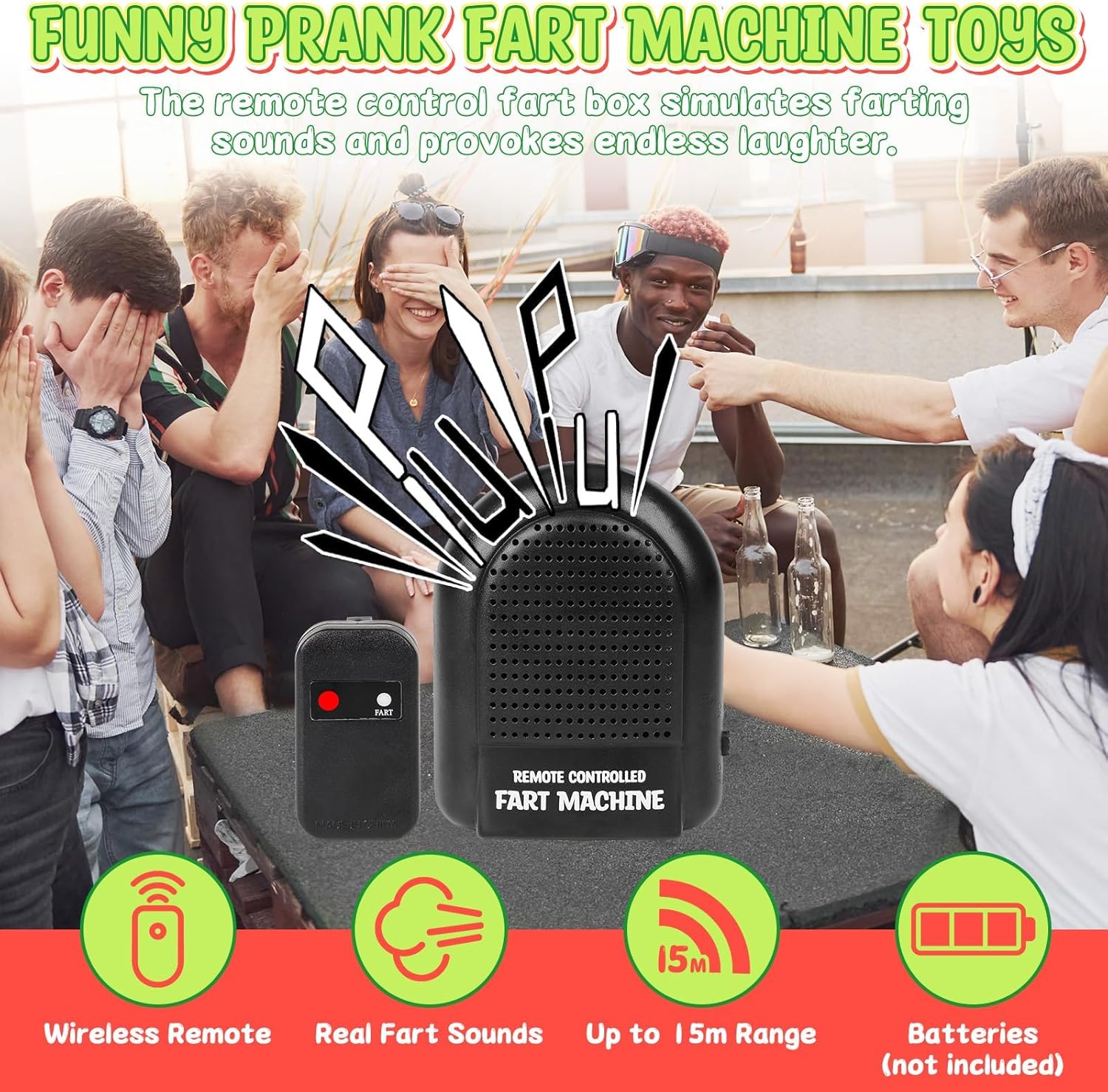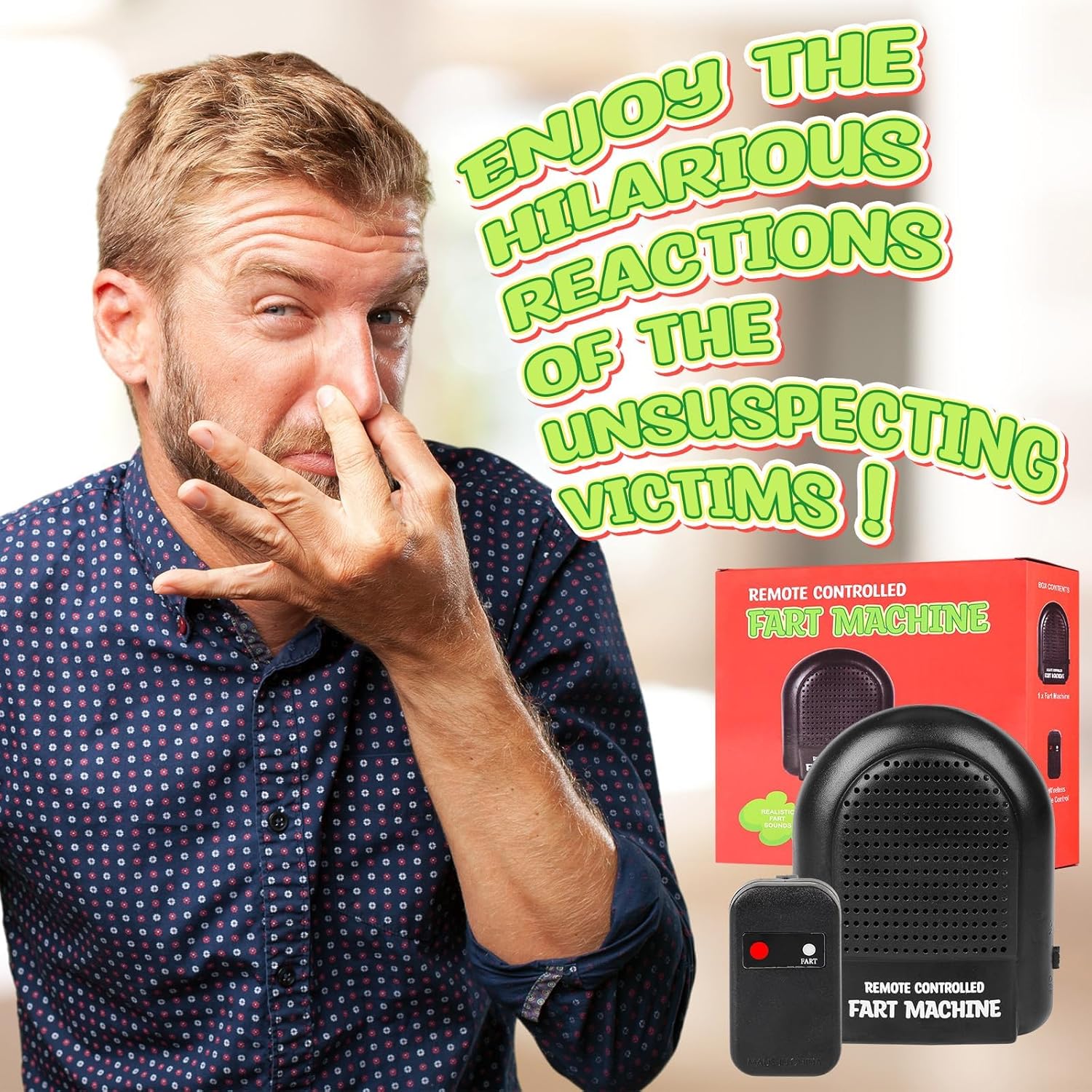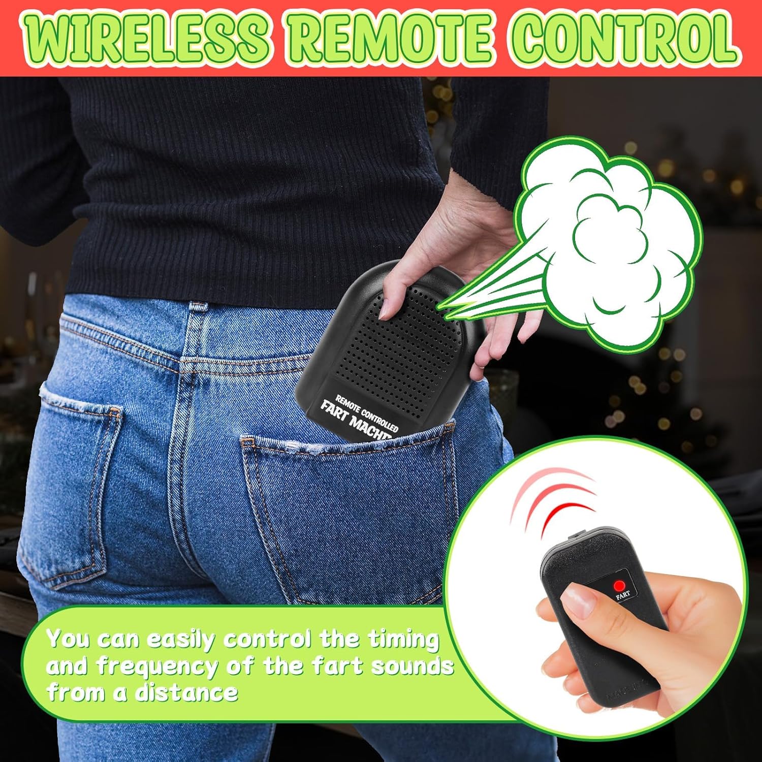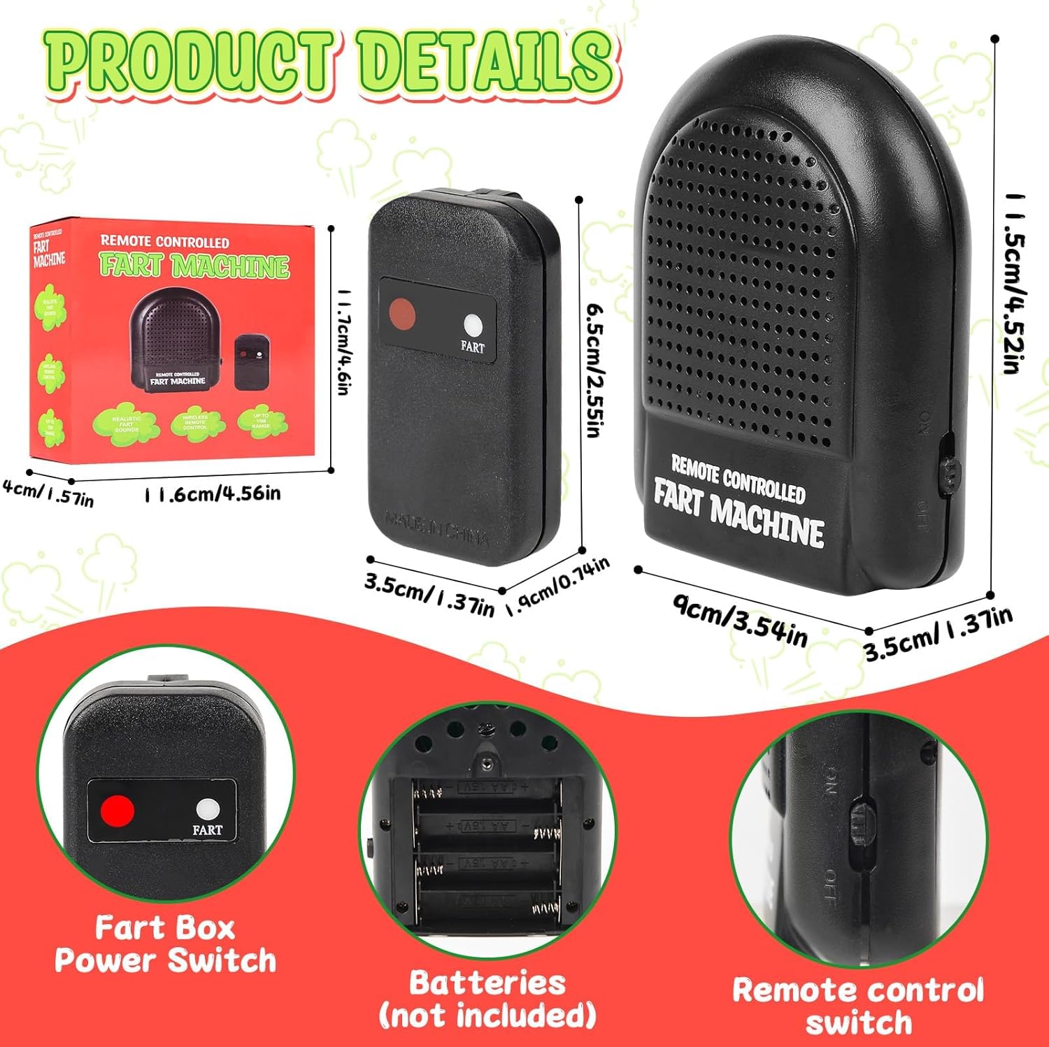 【Gadget che induce alla risata】Scatena risate infinite simulando numerosi suoni di scoreggia con questa macchina per scoregge e il telecomando. Perfetto per sorprendere genitori e amici ai festival o nella vita di tutti i giorni con questa scatola bavaglio divertente e intelligente. 【Tempismo di controllo】 Questa macchina per scoregge è dotata di un telecomando wireless che ti dà il potere di fare scherzi a chiunque con suoni di scoreggia. Puoi controllare il volume e la durata dei suoni delle scorregge da remoto. Posiziona semplicemente la superficie di ventilazione a circa 2-3 cm dalla punta del pollice, quindi premi con decisione. 【Portatile da trasportare】 Portalo ovunque tu vada. La macchina per scoreggiare è così piccola che puoi facilmente infilarla in tasca o in borsa e portarla con te dove vuoi. Con la nostra macchina per scoregge sarai sicuro di metterti in imbarazzo quando si presenta l'umore, può nascondere gli altoparlanti. 【Scelta del regalo】 Crea risate e ricordi indimenticabili con questo strumento Fun Prank: una macchina per scoreggiare con telecomando. Perfetto per portare le risate in casa a Natale, Capodanno, compleanni, feste e nella vita di tutti i giorni. 【Ampia applicazione】 Questa macchina per scoregge con telecomando è adatta a tutti i tipi di occasioni divertenti, che si tratti di riunioni di famiglia, uffici, scuole, cinema o ristoranti. Puoi usarlo per creare un'atmosfera divertente e far ridere la gente.