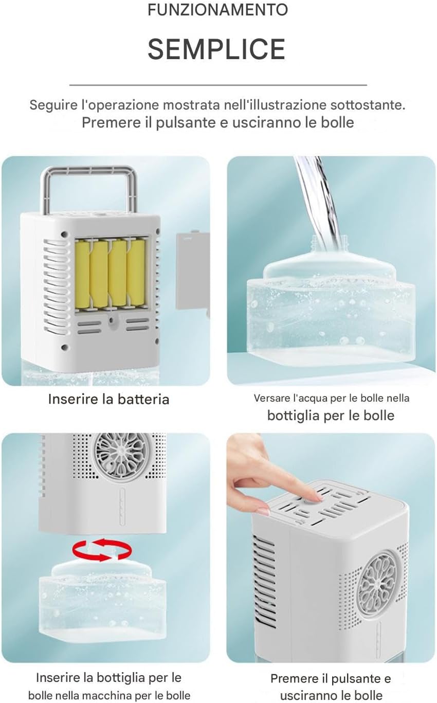 Compagno all'Aperto Pratico: Il design robusto e adatto ai viaggi assicura divertimento senza sforzo all'aperto con compatibilità versatile, corpo compatto per trasporto agevole; godi del fascino delle bolle ovunque con semplicità Designo Impermeabile: Tecnologia di tenuta ottimizzata previene fuoriuscite, con serbatoio capiente da 400ml per performance ininterrotta e divertimento duraturo Produzione Ottimizzata: ad alta efficienza e rilascio continuo bolle uniformi per funzionamento affidabile e divertimento senza interruzioni in interni o esterni con modelli coerenti Bolle Abbondanti: Generazione densa di bolle per divertimento immediato e atmosfera vivace, configurazione rapida con comando a singolo pulsante per attivazione istantanea senza preparazione complessa Attivazione immediata: Illuminazione LED incorporata genera un'ambiente accattivante tramite cambio automatico colori, esalta la vivacità visiva e garantisce utilizzo intuitivo con attivazione a pulsante