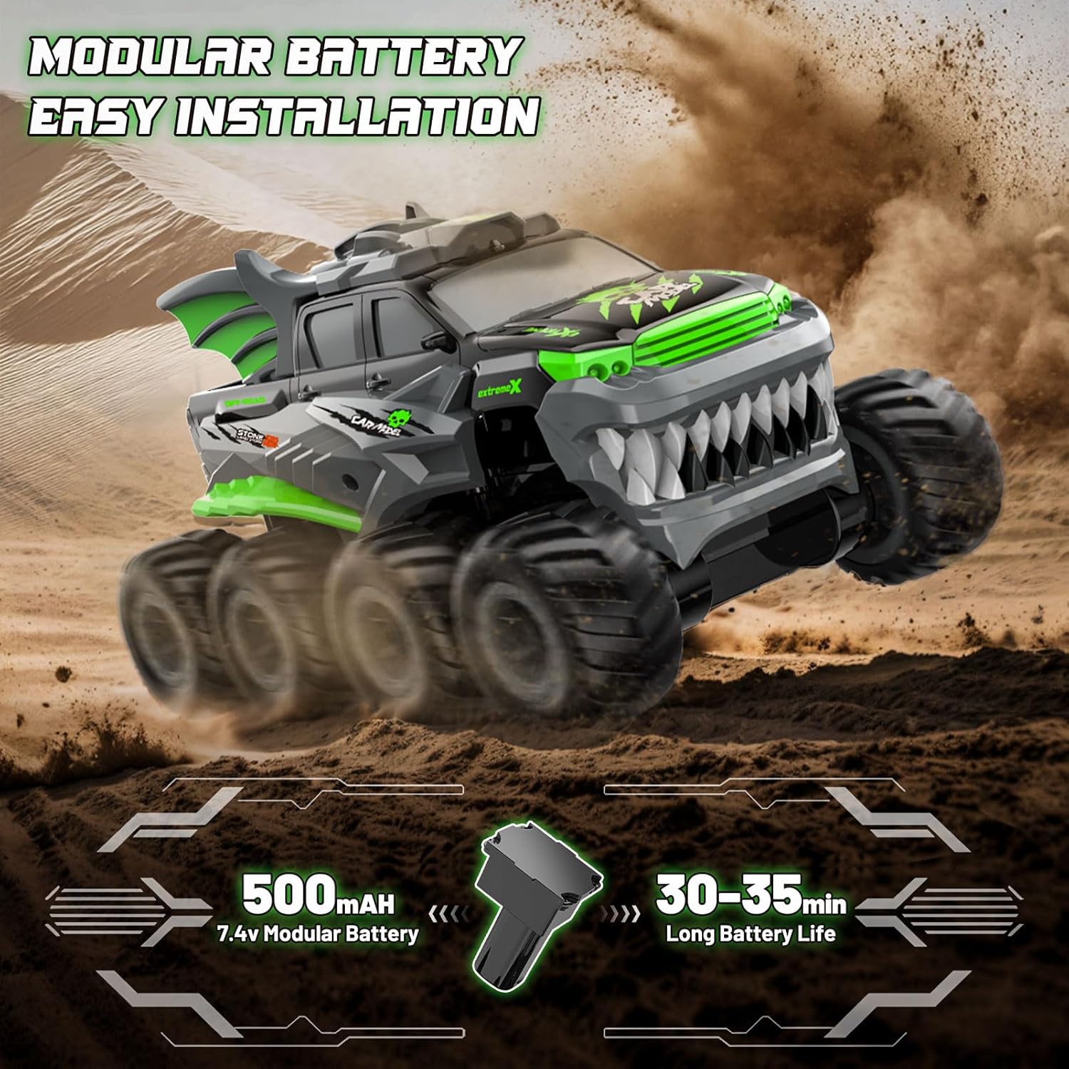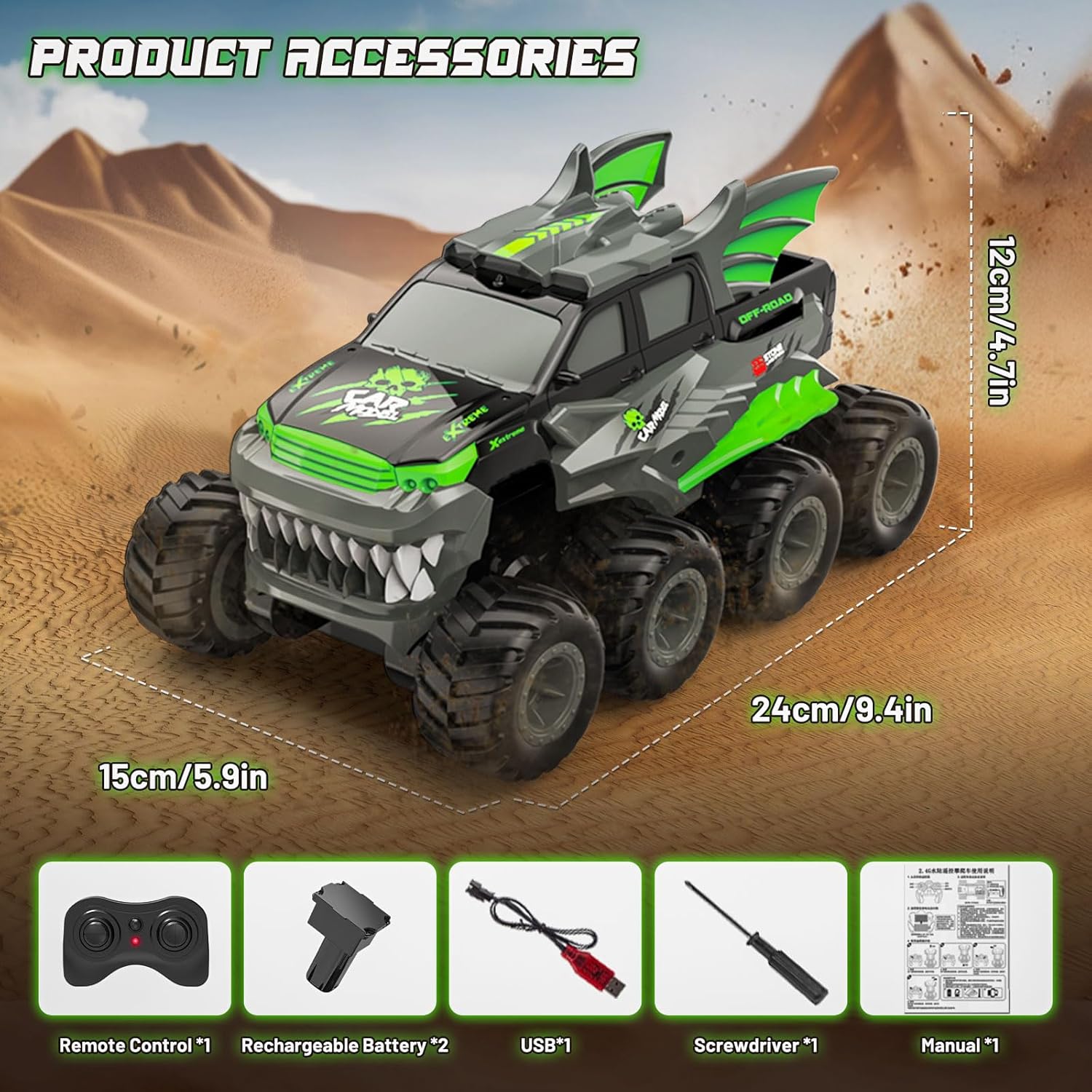 Prestazioni anfibie fuoristrada per terra e acqua:Questo monster truck telecomandato anfibio 8WD presenta una carrozzeria completamente sigillata e impermeabile, in grado di dominare facilmente sia i terreni terrestri che acquatici. Sulla terra affronta senza problemi erba, ghiaia, fango e sabbia; sull’acqua scivola senza sforzo su pozzanghere, stagni, piscine e perfino zone umide. Progettato per una vera esperienza all-terrain, offre una potenza eccezionale e un divertimento anfibio emozionante – perfetto per bambini e adulti che amano l’avventura all’aperto. Set completo con funzioni complete per il massimo divertimento:Include tutto il necessario per un’esperienza di guida entusiasmante: 1 macchina radiocomandata anfibia, 2 batterie modulari, 1 cavo di ricarica USB, 1 telecomando 2.4GHz impermeabile, 1 cacciavite e un manuale multilingue (inglese e cinese). Dotata di funzioni principali come avanzamento, retromarcia, svolta sinistra/destra e spettacolari rotazioni a 360°. Questa macchina anfibia RC è costruita per tutti i terreni, offrendo prestazioni potenti su terra e acqua – perfetta per bambini e appassionati che cercano avventure versatili e piene d’azione. Sistema modulare della batteria e telecomando impermeabile:Dotata di due batterie modulari al litio da 7,4 V 500 mAh, ognuna con un’autonomia fino a 30 minuti – quasi un’ora di guida adrenalinica in totale. Il design modulare consente una sostituzione rapida e sicura della batteria, e il cavo USB incluso permette una ricarica comoda in qualsiasi momento. Il telecomando impermeabile 2.4GHz garantisce un controllo reattivo e stabile anche in ambienti umidi. Il controller utilizza 2 batterie AA da 1,5 V (non incluse) e offre un raggio d’azione fino a 50 m per un divertimento continuo su terra e acqua. Controllo 2.4GHz indipendente per corse multiplayer:Grazie al sistema radio 2.4GHz anti-interferenza, questo camion radiocomandato anfibio offre un segnale stabile e reattivo per una guida fluida. Ogni veicolo è accoppiato in modo indipendente con il proprio controller, consentendo a più auto di gareggiare contemporaneamente senza sovrapposizione di frequenze. Che si tratti di una gara nel giardino o di una battaglia d’acqua in piscina, il sistema indipendente rende possibile un divertimento multiplayer emozionante e un’esperienza interattiva con amici e familiari. Regalo perfetto per bambini da 8 anni in su:Con il suo design accattivante, le realistiche prestazioni anfibie e le emozionanti acrobazie su ogni terreno, questo monster truck telecomandato anfibio è una scelta ideale. Come macchina radiocomandata anfibia, affascina per la sua potenza e offre un divertimento ricco di azione. È un’ottima idea regalo per compleanni, festività o Natale, che ispira i bambini all’esplorazione all’aperto, incoraggia il gioco pratico e crea ricordi indimenticabili.