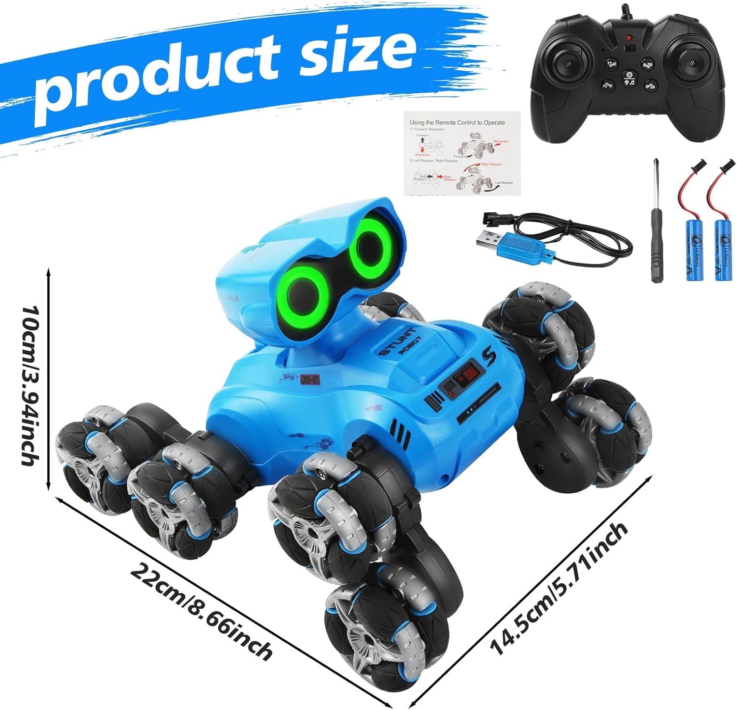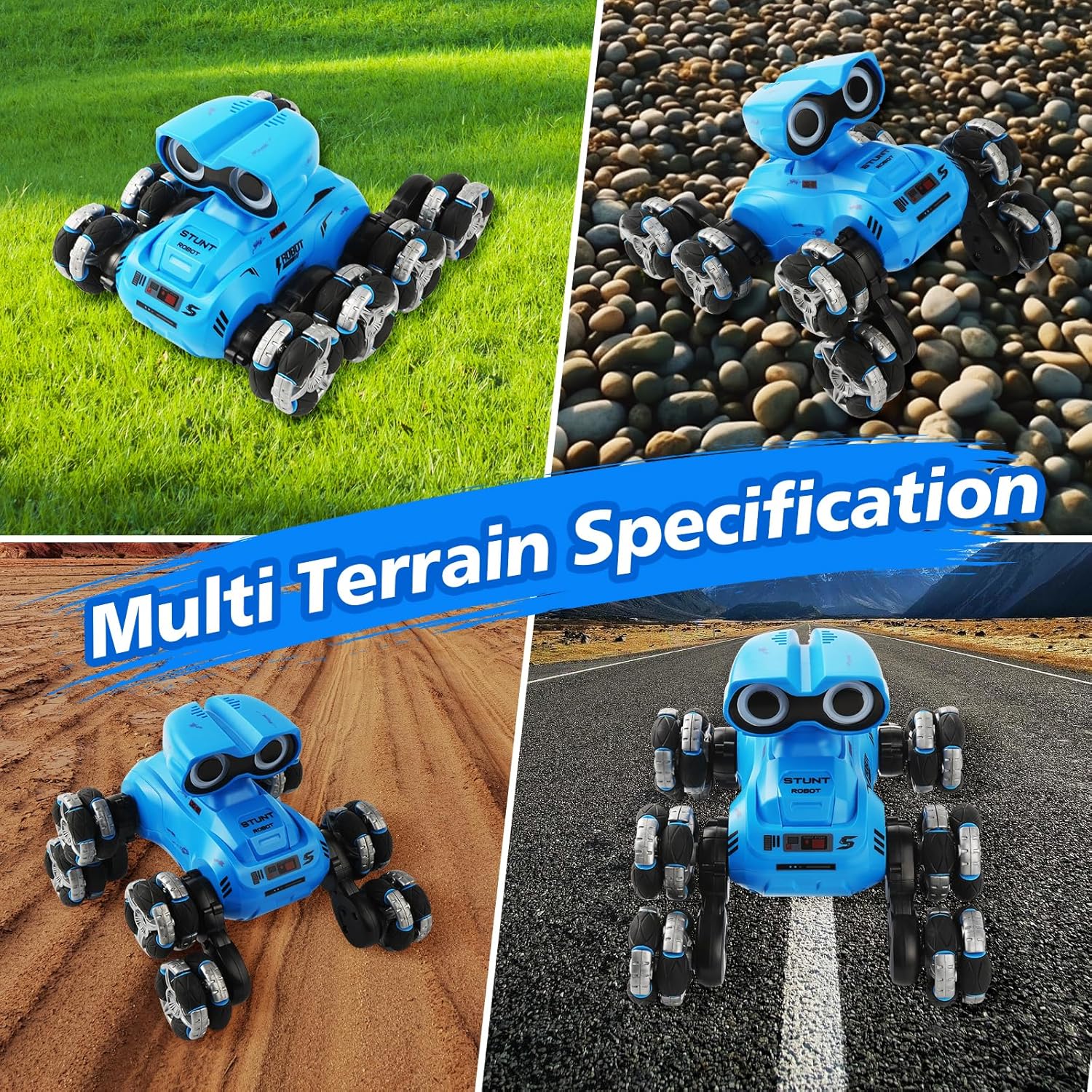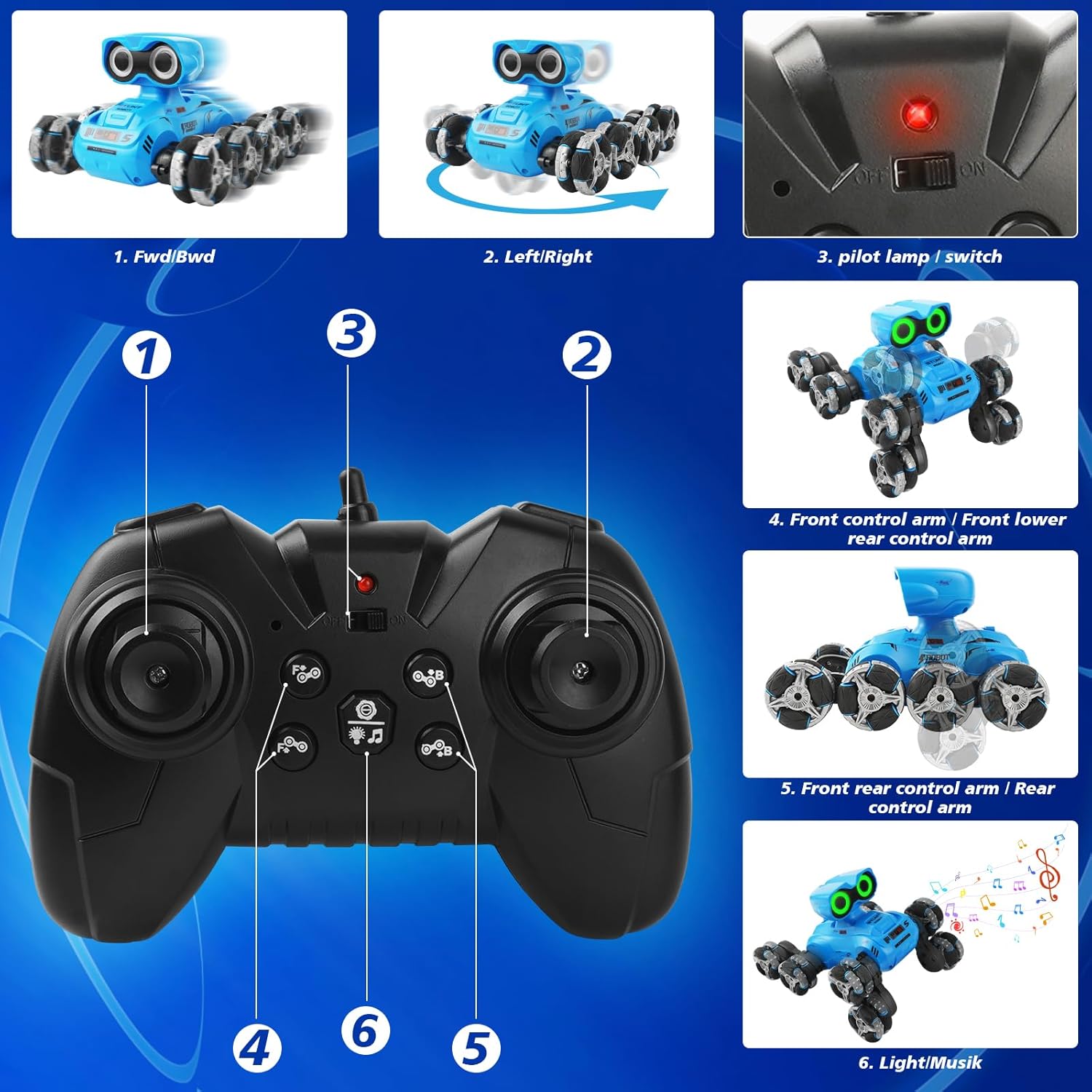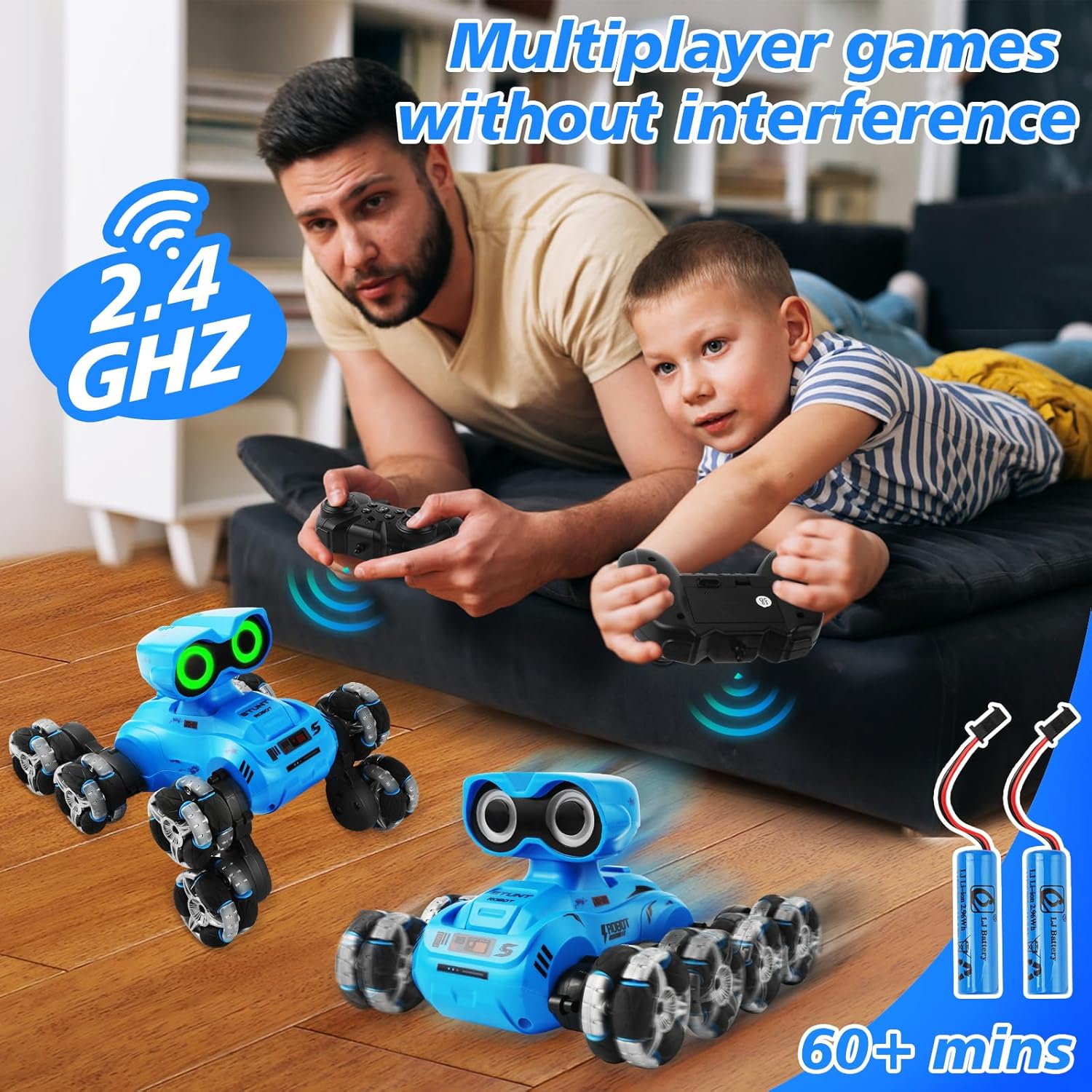 【Veicolo fuoristrada telecomandato 8WD】 Questo veicolo telecomandato ha un design a otto ruote. I bambini possono guidarlo in avanti e indietro e sterzare a destra o a sinistra. Può anche eseguire rotazioni a 360 gradi, impennate, cambi di ruota e arrampicate fuoristrada, consentendo una varietà di scenari di gioco emozionanti. Grazie alla sua struttura robusta, può essere utilizzato su erba, terra, sabbia e superfici pavimentate. Adatto per il divertimento sia all'interno che all'esterno. 【Auto RC 2,4 GHz】 Questa auto telecomandata, adatta a bambini dai 3 ai 12 anni, utilizza la tecnologia professionale a 2,4 GHz con una portata di 60 metri. La resistenza alle interferenze del segnale a 2,4 GHz consente di giocare in multiplayer. I bambini possono gareggiare insieme con le auto telecomandate e divertirsi senza fine, il che la rende ideale per le competizioni con la famiglia o gli amici. 【Auto acrobatica telecomandata a 360°】 Questa interessante auto telecomandata è progettata per consentire rotazioni flessibili a 360° ed è dotata di fantastiche luci LED e musica . La rotazione doppia a 360 gradi rende questa auto acrobatica RC perfetta per i bambini avventurosi che amano fare capriole e derapate. 【Resistente】 Questa auto telecomandata è realizzata con materiali resistenti di alta qualità e può sopportare anche giochi e condizioni difficili. La sua struttura robusta resiste a collisioni, cadute e ribaltamenti. Lo speciale design delle ruote garantisce un'esperienza di guida più fluida, consentendo ai bambini di provare il brivido del drifting. 【Oltre 60 minuti di autonomia e funzione di ricarica rapida】 L'auto telecomandata BatdTech è dotata di due batterie ricaricabili da 3,7 V e 500 mAh e di un caricatore USB. Mentre una batteria è in carica, l'altra può continuare a essere utilizzata, in modo da non interrompere mai il divertimento. 【Il regalo perfetto】 Questa auto telecomandata non solo diverte i bambini, ma stimola anche i loro riflessi e la loro coordinazione fisica. Con il suo comando manuale intuitivo e una modalità esperto, è il regalo ideale per bambini di 3, 4, 5, 6, 7, 8, 9, 10, 11 e 12 anni.