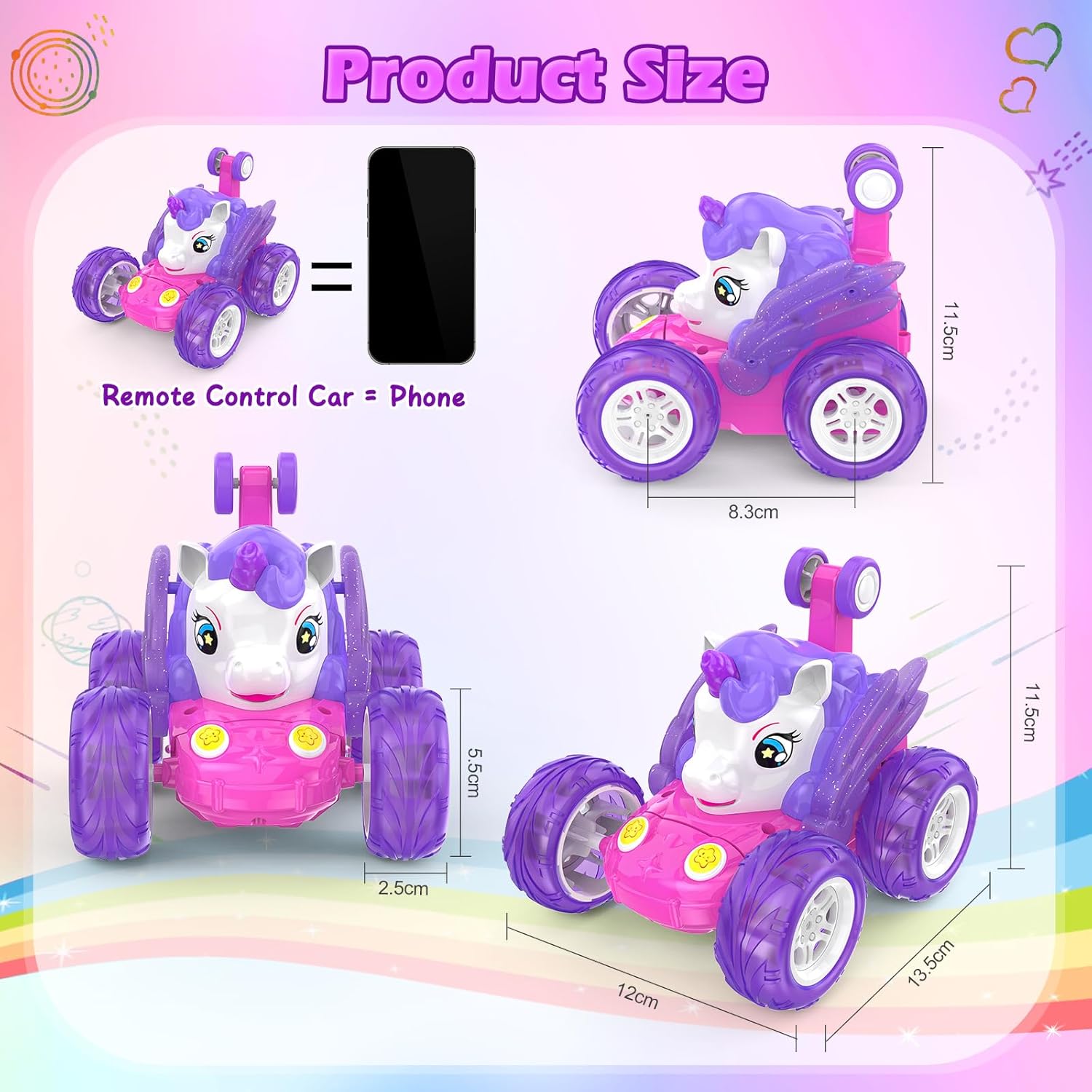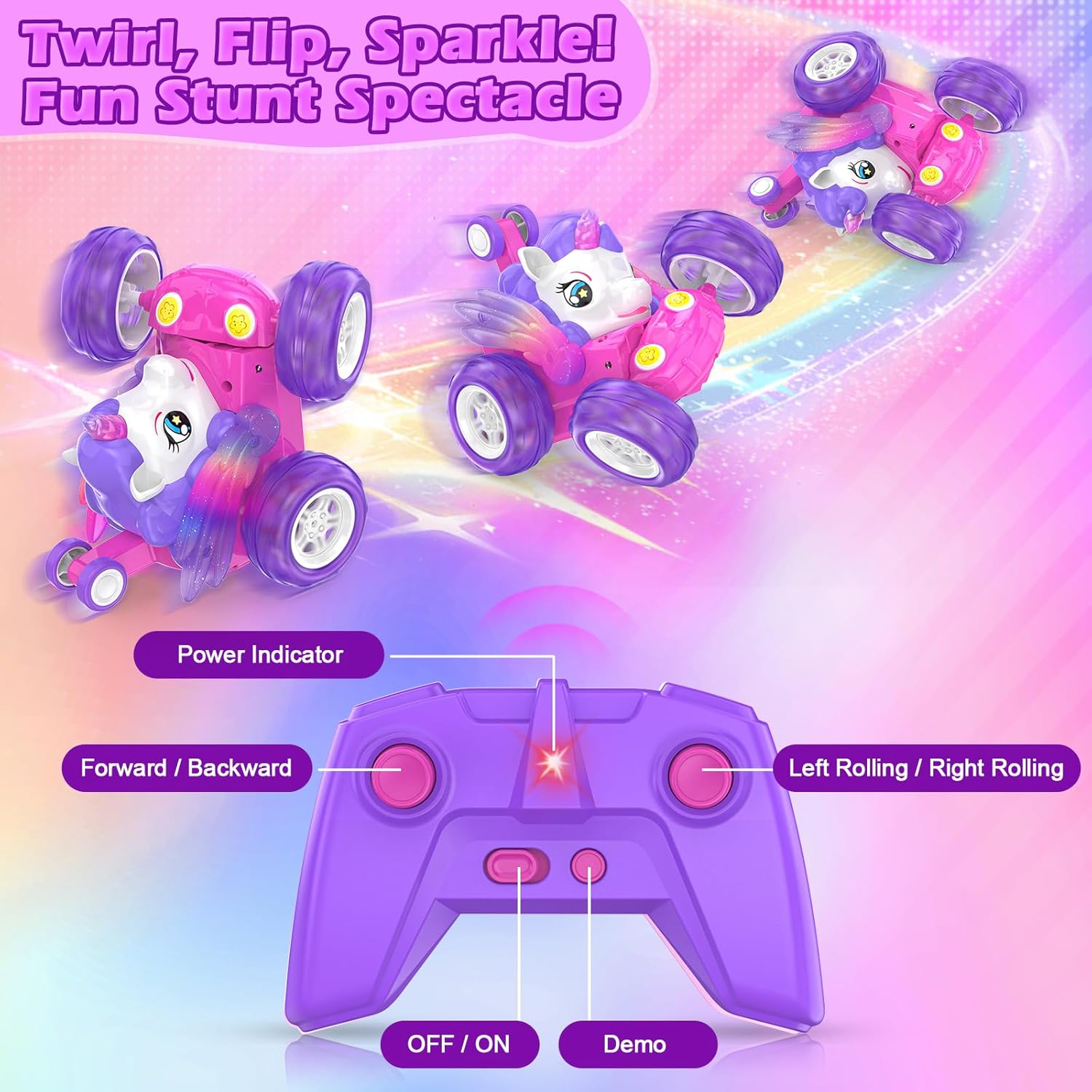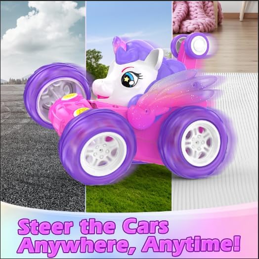 Simpatica macchina telecomandata a forma di unicorno con luci scintillanti: presenta un'adorabile forma di unicorno con colori vivaci e luci LED scintillanti integrate, che la rendono visivamente sbalorditiva e immediatamente accattivante per i bambini. Rotazione a 360° e guida verticale a 90°: Le ruote anteriori flessibili possono ruotare di 360 gradi e guidare in posizione verticale con comandi semplici, offrendo un divertimento senza fine con acrobazie e incoraggiando lo sviluppo delle capacità motorie dei bambini. Il telecomando a 2,4 GHz consente a più auto di gareggiare contemporaneamente senza interferenze di segnale. Rotazione a 360° e guida verticale a 90°: Le ruote anteriori flessibili possono ruotare di 360 gradi e guidare in posizione verticale con comandi semplici, offrendo un divertimento senza fine con acrobazie e incoraggiando lo sviluppo delle capacità motorie dei bambini. Il telecomando a 2,4 GHz consente a più auto di gareggiare contemporaneamente senza interferenze di segnale. Ricarica semplicissima: offre un cavo USB per caricare la batteria ricaricabile integrata tramite computer, power bank, ecc., senza bisogno di rimuovere la batteria, semplice e senza problemi. I bambini possono divertirsi alla guida per circa 30 minuti dopo la ricarica. Ottimo regalo per le bambine: viene fornito con una bellissima confezione colorata, quindi non è più necessario acquistare altre confezioni regalo. Scelta ideale per regali di compleanno, Natale, festività, ecc.