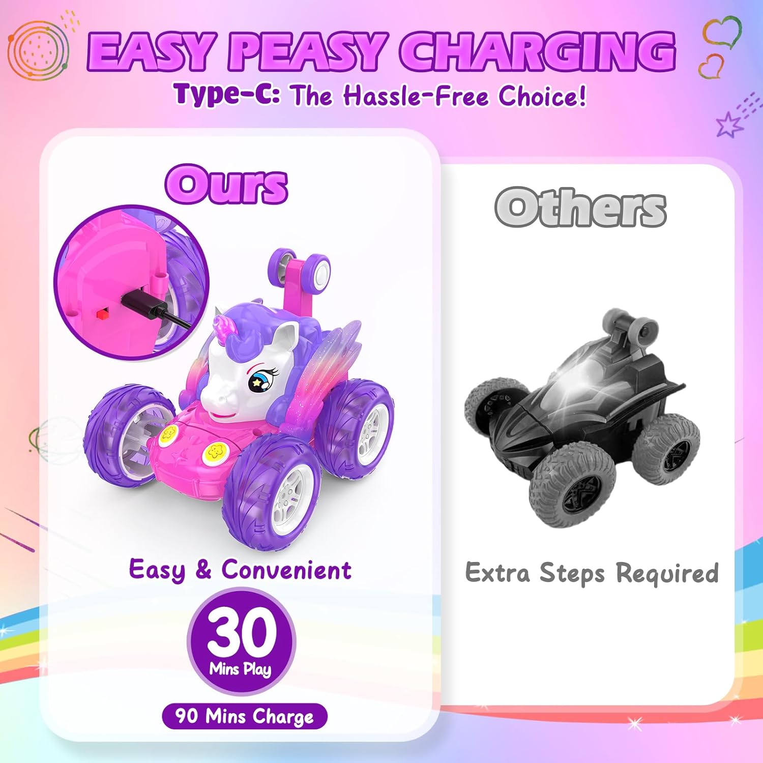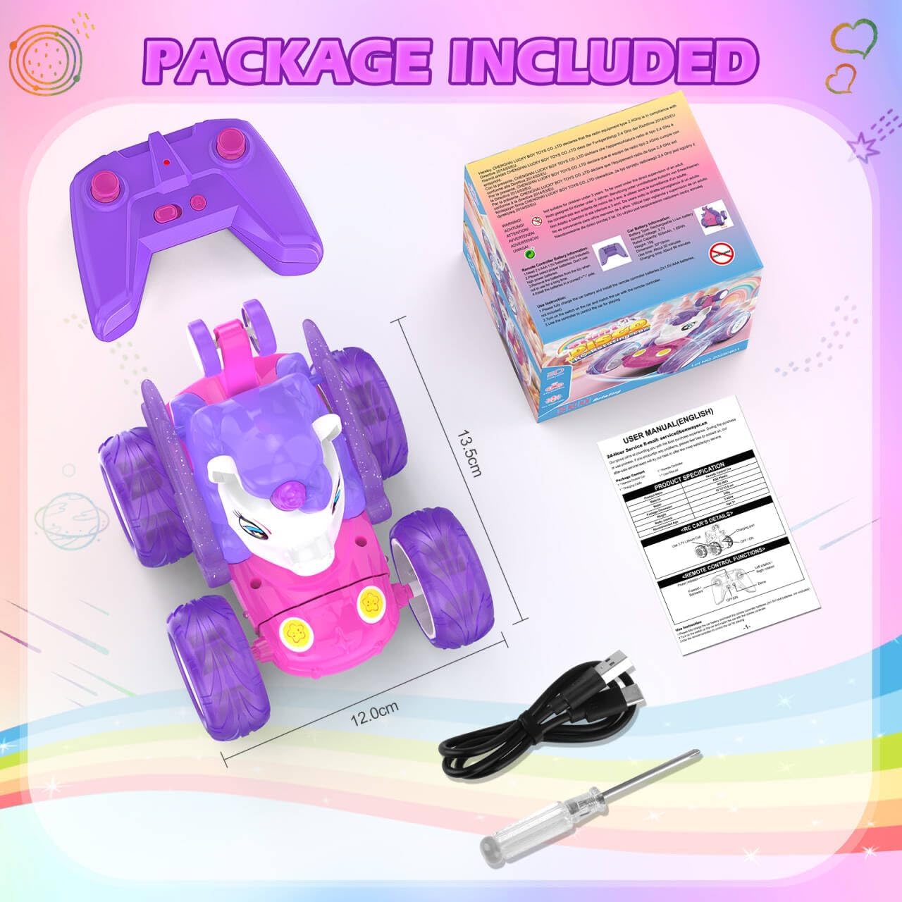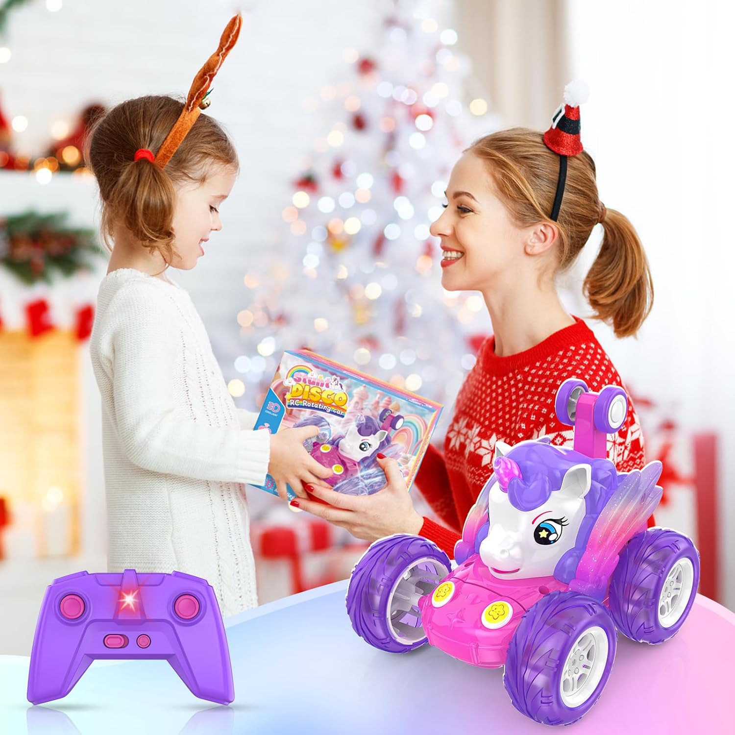 Simpatica macchina telecomandata a forma di unicorno con luci scintillanti: presenta un'adorabile forma di unicorno con colori vivaci e luci LED scintillanti integrate, che la rendono visivamente sbalorditiva e immediatamente accattivante per i bambini. Rotazione a 360° e guida verticale a 90°: Le ruote anteriori flessibili possono ruotare di 360 gradi e guidare in posizione verticale con comandi semplici, offrendo un divertimento senza fine con acrobazie e incoraggiando lo sviluppo delle capacità motorie dei bambini. Il telecomando a 2,4 GHz consente a più auto di gareggiare contemporaneamente senza interferenze di segnale. Rotazione a 360° e guida verticale a 90°: Le ruote anteriori flessibili possono ruotare di 360 gradi e guidare in posizione verticale con comandi semplici, offrendo un divertimento senza fine con acrobazie e incoraggiando lo sviluppo delle capacità motorie dei bambini. Il telecomando a 2,4 GHz consente a più auto di gareggiare contemporaneamente senza interferenze di segnale. Ricarica semplicissima: offre un cavo USB per caricare la batteria ricaricabile integrata tramite computer, power bank, ecc., senza bisogno di rimuovere la batteria, semplice e senza problemi. I bambini possono divertirsi alla guida per circa 30 minuti dopo la ricarica. Ottimo regalo per le bambine: viene fornito con una bellissima confezione colorata, quindi non è più necessario acquistare altre confezioni regalo. Scelta ideale per regali di compleanno, Natale, festività, ecc.