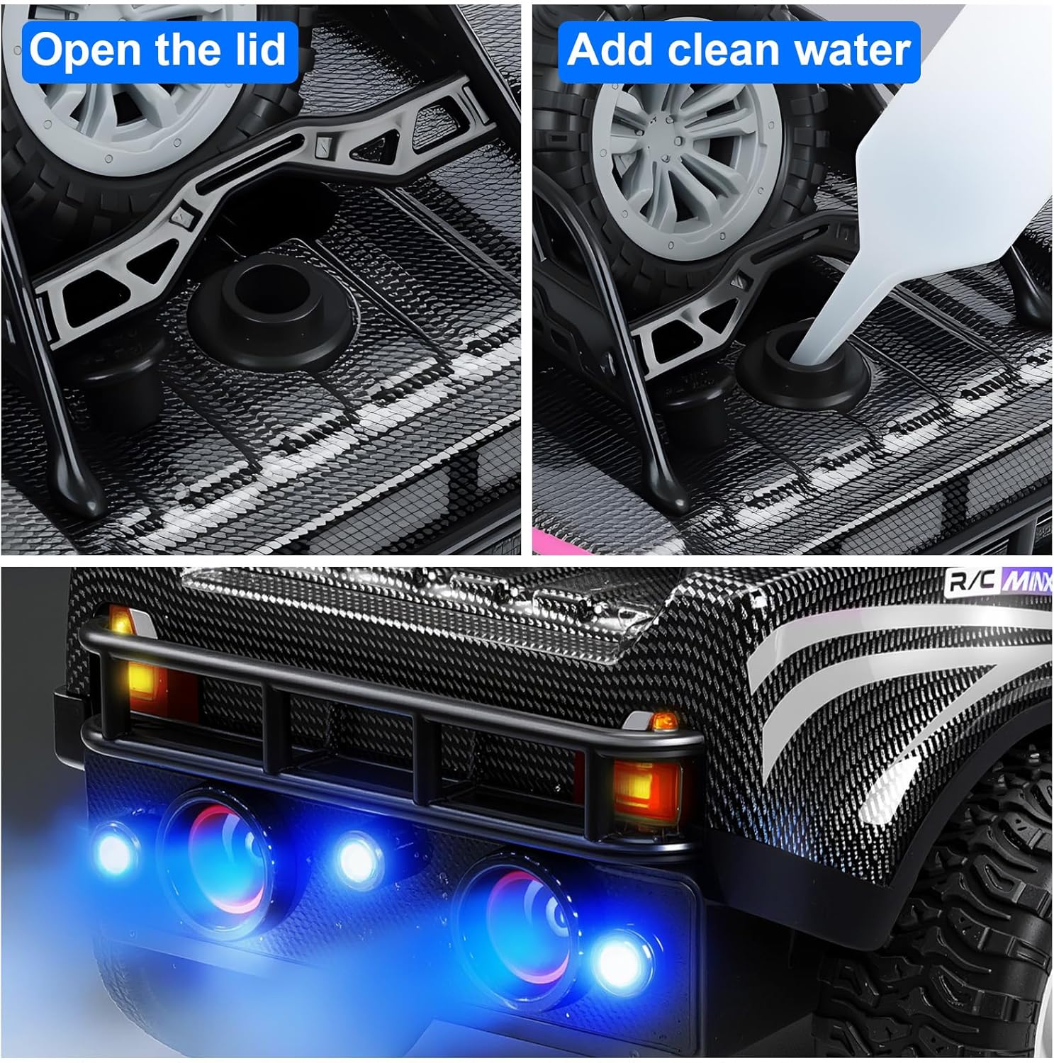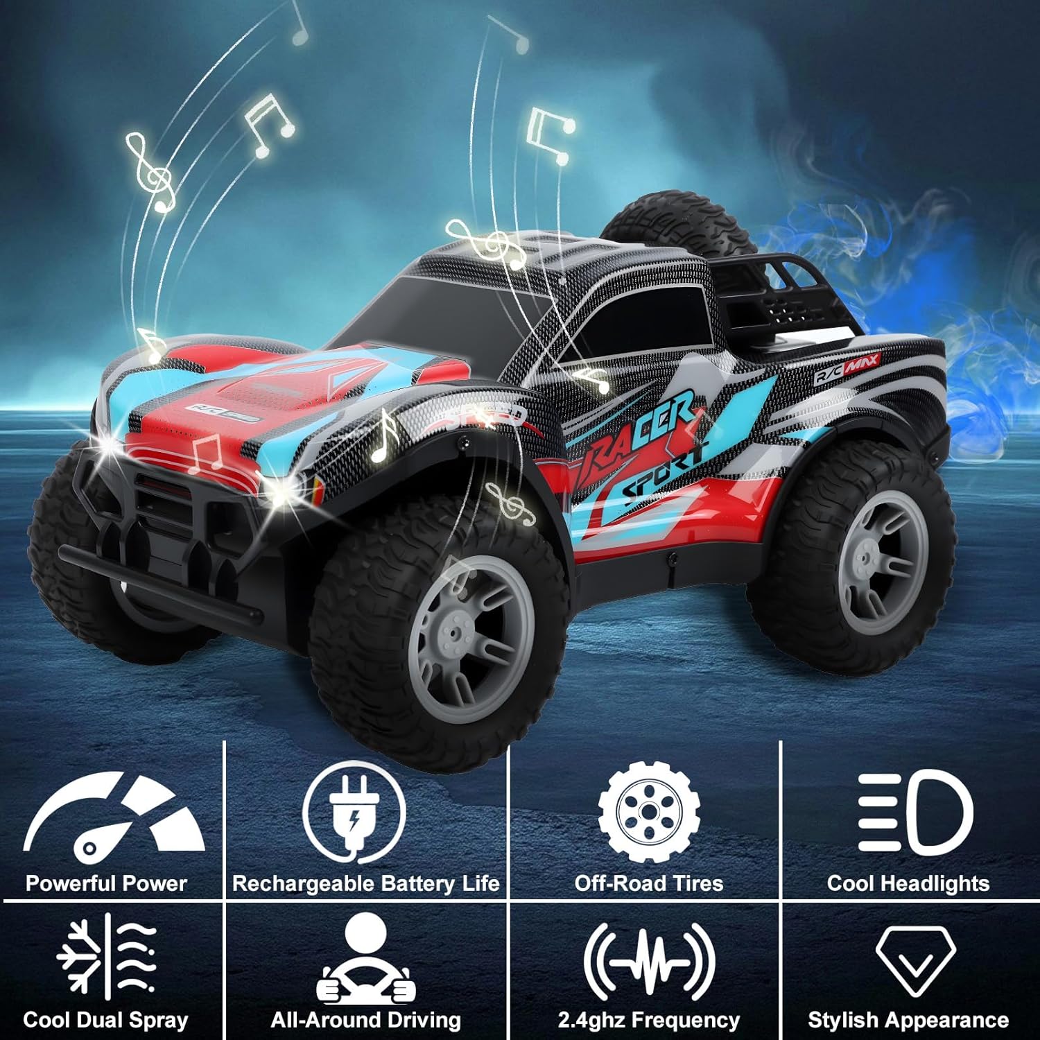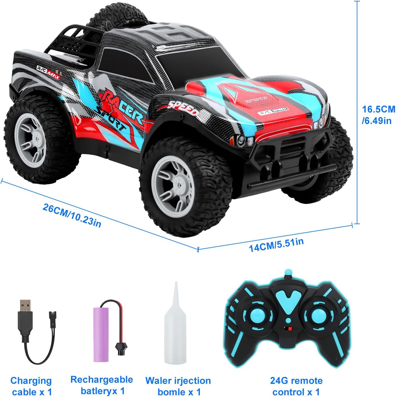 Auto macchina telecomandata cool: L'auto macchina telecomandata per bambini con materiali di alta qualità, resistente agli urti e alle cadute, difficile da danneggiare, con dimensioni della carrozzeria di 26 cm x 16 cm x 13,5 cm, telecomando a distanza 2,4G, velocità massima di 12 km/h, distanza di controllo fino a 80 metri, pneumatici in gomma e sistema antiurto progettato per consentire la guida su qualsiasi tipo di terreno, come terreno pianeggiante, roccioso, sabbioso, piste in gomma, ecc. Luci fantastiche ed effetti sonori dinamici: L'auto macchinina telecomandata bambino dall'aspetto imponente, luci LED abbaglianti ed effetti sonori dinamici (sia gli spruzzi che la musica possono essere disattivati), che la rendono accattivante anche durante la guida notturna, garantendo divertimento senza fine ai vostri bambini! Modalità doppio spruzzo: Il set del macchina radiocomandata un serbatoio per l'acqua. Versate dell'acqua del rubinetto nel serbatoio del telecomando, quindi premete il pulsante di spruzzo e il telecomando emetterà vapore proprio come un'auto vera. Anche le luci posteriori si accenderanno come quelle di un'auto vera. La combinazione di luci LED e spruzzo rende il telecomando davvero fantastico. Divertiti con la famiglia e gli amici: Il auto radiocomandata è dotato di un telecomando 2.4G, che consente a più persone di competere senza interferenze e supporta il controllo simultaneo da parte di più persone. Puoi gareggiare con la famiglia e gli amici e divertirti insieme con l'auto telecomandata. Durata prolungata, divertimento assicurato: Il macchina radiocomandata per bambini di una batteria al litio da 3,7 V/900 mAh ad alta capacità,che garantisce una durata prolungata, permettendo ai bambini di giocare e fare pratica a loro piacimento. Pneumatici fuoristrada in gomma per tutti i terreni: I macchine telecomandate hanno un battistrada largo, sono resistenti all'usura, ammortizzano gli urti e sono resistenti agli impatti, quindi non c'è da temere di danneggiare i mobili giocando in casa. I pneumatici fuoristrada in gomma hanno una forte aderenza, sono sensibili e reattivi e consentono di eseguire facilmente acrobazie in derapata. Regalo a sorpresa: Se state cercando un regalo emozionante e alla moda, questa esclusiva auto telecomandata è sicuramente la scelta perfetta per i vostri bambini, sia che si tratti di un compleanno, Halloween, Natale o altre festività: l'auto telecomandata è un regalo a sorpresa perfetto per i bambini!