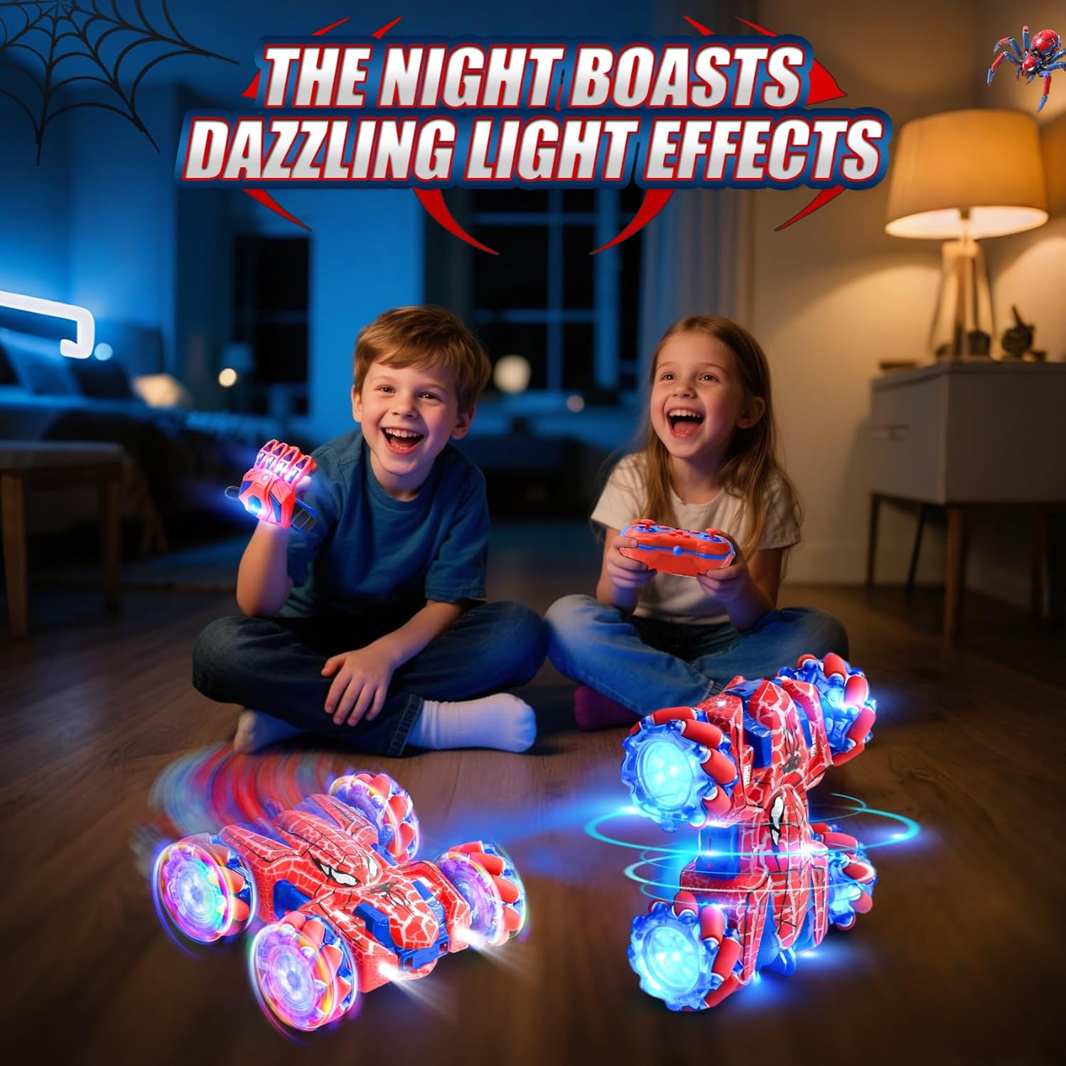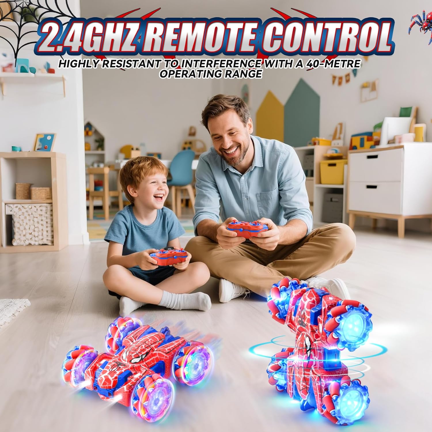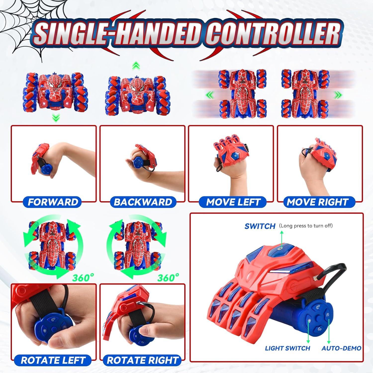 Doppio controllo, doppio divertimento: Macchina Giocattolo Telecomandata è dotato di due innovativi telecomandi per un divertimento doppio! Controllalo con il classico controller a maniglia o diventa un maestro dell'illusione con l'esclusivo dispositivo portatile, come se esercitassi poteri magici su giochi per bambini. Questo macchina spider aiuta a sviluppare la coordinazione occhio-mano ed è il regalo perfetto per bambini e bambine dai 3 anni in su. Nota: entrambi i controller richiedono batterie (il controller wireless richiede 2 batterie AA, il controller portatile richiede 2 batterie AAA). Le batterie non sono incluse nella confezione. Macchina Telecomandata: pronti a esibirvi? Il nostro veicolo Auto Radiocomandata può eseguire incredibili giri a 360°, manovre di drifting spericolate e persino guidare in avanti e indietro! Alimentato da un robusto sistema di trazione integrale e dotato di abbaglianti luci LED su tutto il corpo, è un vero e proprio spettacolo. Cattura l'attenzione di tutti e garantisce un divertimento duraturo di giorno e di notte, sia nella stanza dei giochi che in giardino. Conquista qualsiasi terreno: macchinina telecomandata bambino è fatto per l'avventura! La sua struttura resistente agli urti e i grandi pneumatici fuoristrada antiscivolo sono progettati per ambienti difficili. Che si tratti di moquette, erba, pavimentazione in pietra o sabbia, la trazione integrale affronta senza sforzo tutti i terreni. Goditi intense gare di corsa all'interno o all'esterno. Divertimento senza preoccupazioni: controllo totale senza grovigli di cavi! La tecnologia wireless a 2,4 GHz garantisce un funzionamento stabile con una portata effettiva di 30-40 metri, supportando più auto contemporaneamente senza interferenze, perfetta per gare emozionanti con fratelli o amici. La batteria ricaricabile si ricarica rapidamente e facilmente tramite il cavo USB incluso, senza bisogno di smontaggi complicati, basta collegarla e giocare! Il regalo perfetto: giochi spider 3 4 5 6 7 8 9 anni porta immensa gioia ai bambini! Presentato in una raffinata confezione regalo, LTFIOON Spider Giocattolo è la scelta ideale per compleanni, Pasqua, Natale o semplicemente come regalo a sorpresa. Giochi per bambini aiuta a sviluppare le capacità motorie e l'immaginazione dei bambini. Questo giocattolo unico e ricco di azione diventerà sicuramente uno dei preferiti dai bambini e dalle bambine dai 3 ai 12 anni.