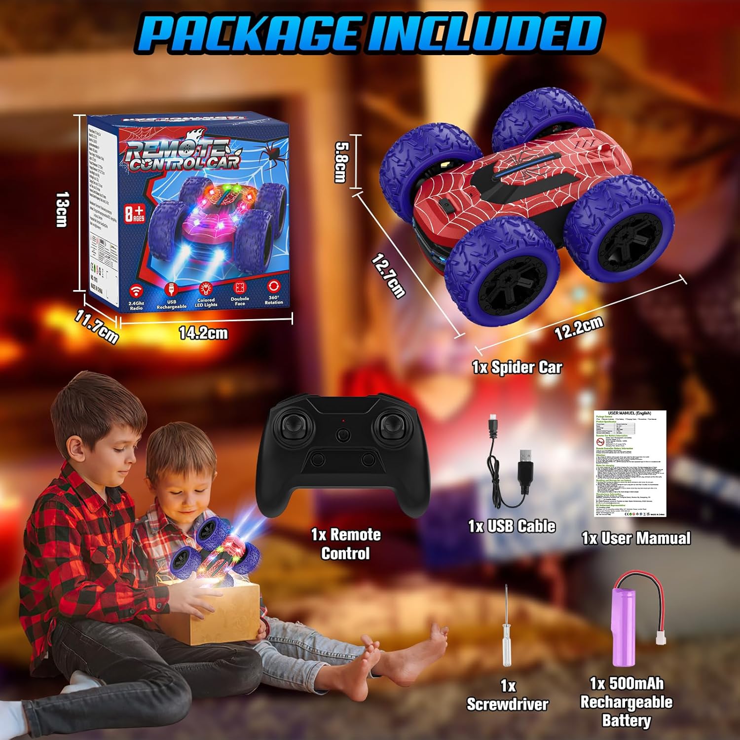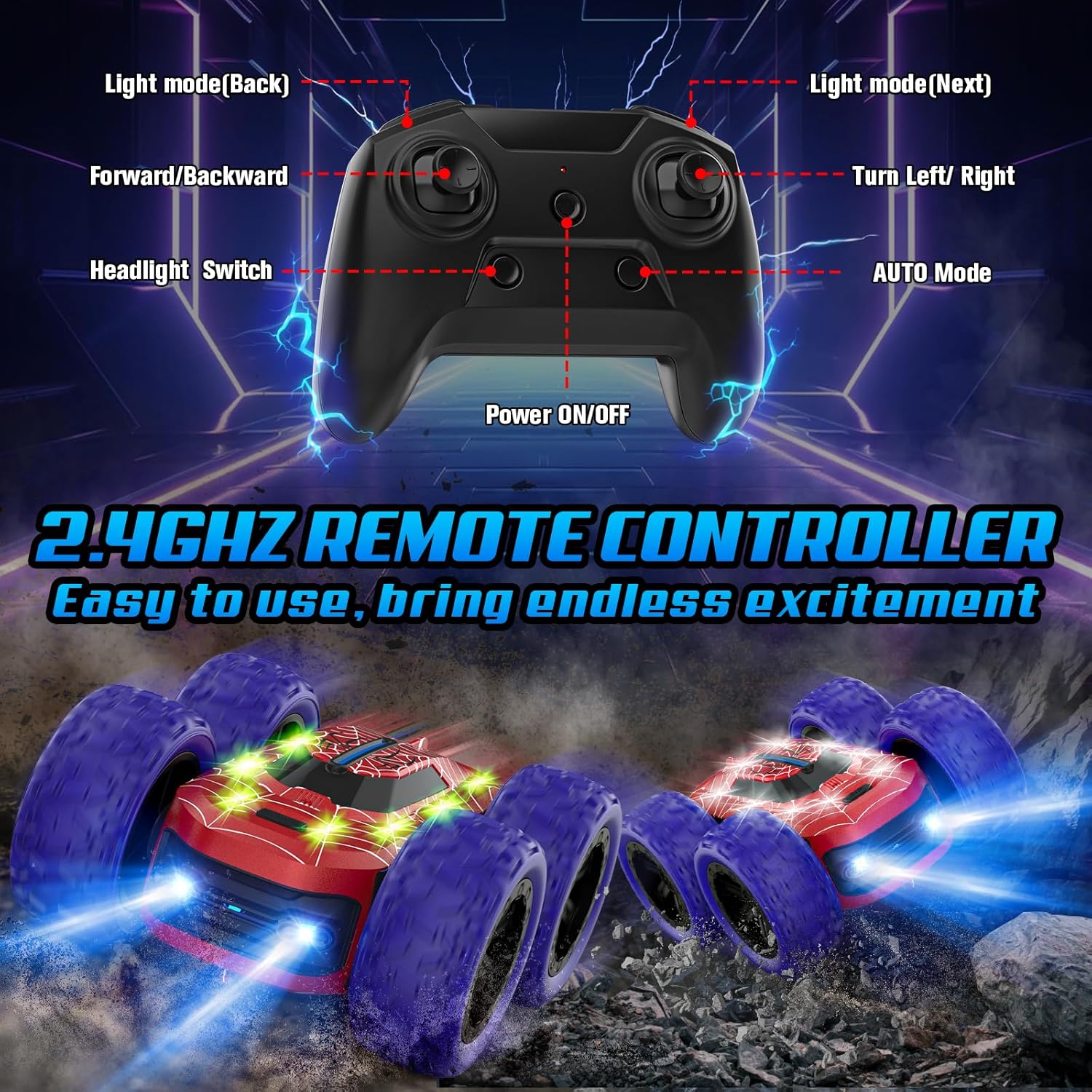【Design Unico del Ragno e Luci Abbaglianti】Le auto RC con design a ragno offrono un'esperienza unica. Le eccezionali luci rosse e blu rendono queste auto incredibilmente cool per i bambini. Dotate di 10 luci LED che emettono 7 colori diversi e offrono 4 diverse modalità di illuminazione. Creano un affascinante spettacolo di luci sia di giorno che di notte, offrendo effetti visivi sorprendenti per i più piccoli. 【Guida su due Lati e Acrobazie】L'auto acrobatica rc drift car per bambini supporta la guida su due lati e una varietà di acrobazie. È possibile utilizzare il telecomando per controllare il movimento in avanti/indietro, la rotazione a destra/sinistra, la rotazione di 360 gradi e i salti mortali di 180 gradi, rendendo questo monster truck telecomandato un divertimento senza fine per i bambini. 【Auto Telecomandata 4x4 Fuoristrada】l'auto da 4WD macchina radiocomandata è dotata di un potente motore e di pneumatici in gomma resistenti e anticollisione, che le permettono di affrontare diversi terreni. È possibile guidarla su una varietà di superfici come spiagge sabbiose, prati, tappeti e ghiaia, rendendola un ottimo giocattolo sia per interni che per esterni per ragazzi e ragazze. 【Macchina Telecomandata a 2,4 GHz e Batteria Ricaricabile】con la frequenza di controllo a 2,4 GHz priva di interferenze, consente di guidare più veicoli contemporaneamente; la distanza di controllo può raggiungere i 40 metri, mentre la batteria ricaricabile da 500 mAh e il cavo di ricarica USB richiedono solo 1,5 ore per una ricarica completa e l'auto radiocomandata può funzionare per più di 30 minuti ininterrottamente. 【Il Regalo Ideale per Bambini】l'auto telecomandata è adatta per giocare sia dentro che fuori. Se state cercando un regalo per il vostro bambino, la spider auto giocattolo è una scelta unica. È un regalo speciale per Natale, per il compleanno, per Pasqua o per il Ringraziamento per i vostri bambini o per gli amici dei vostri figli.