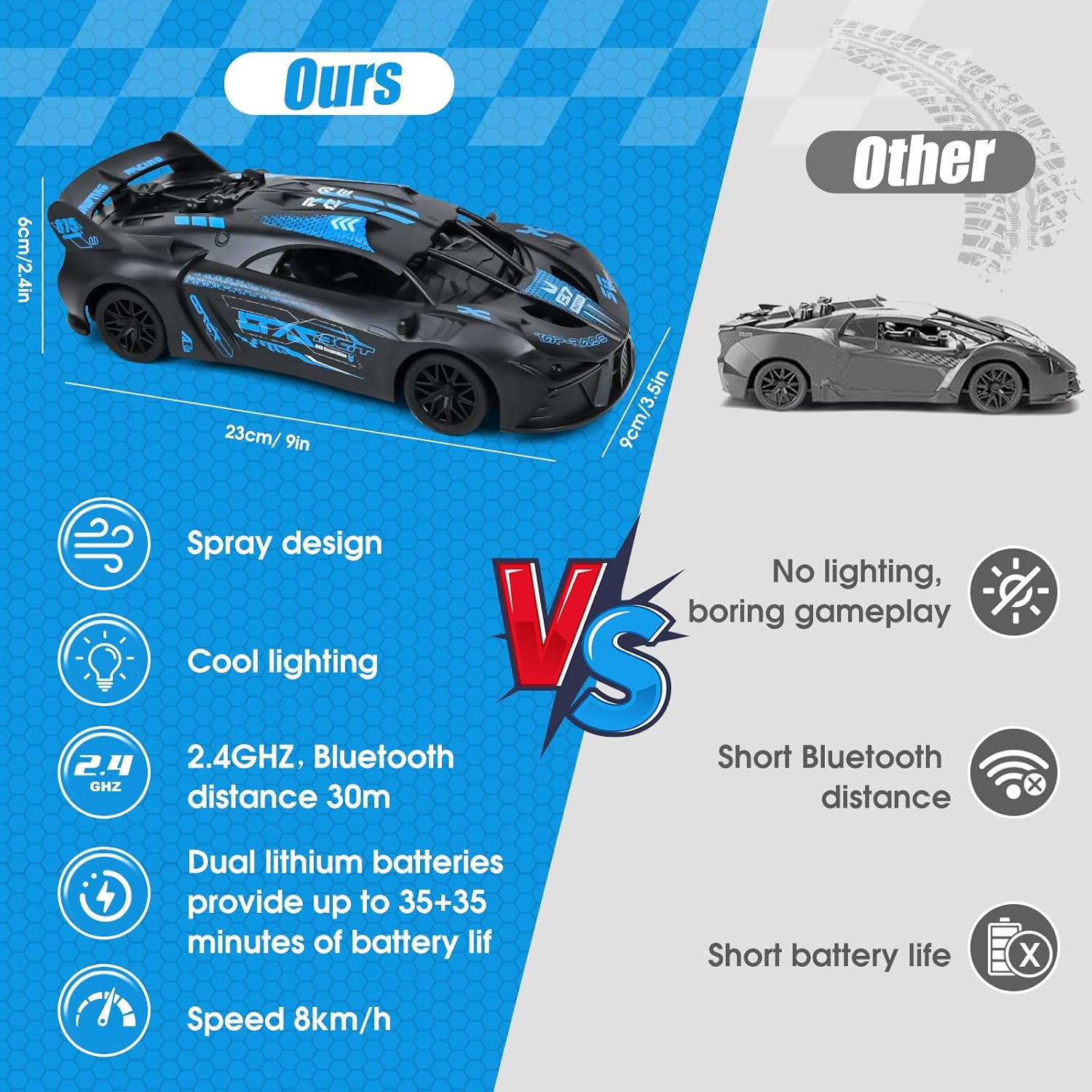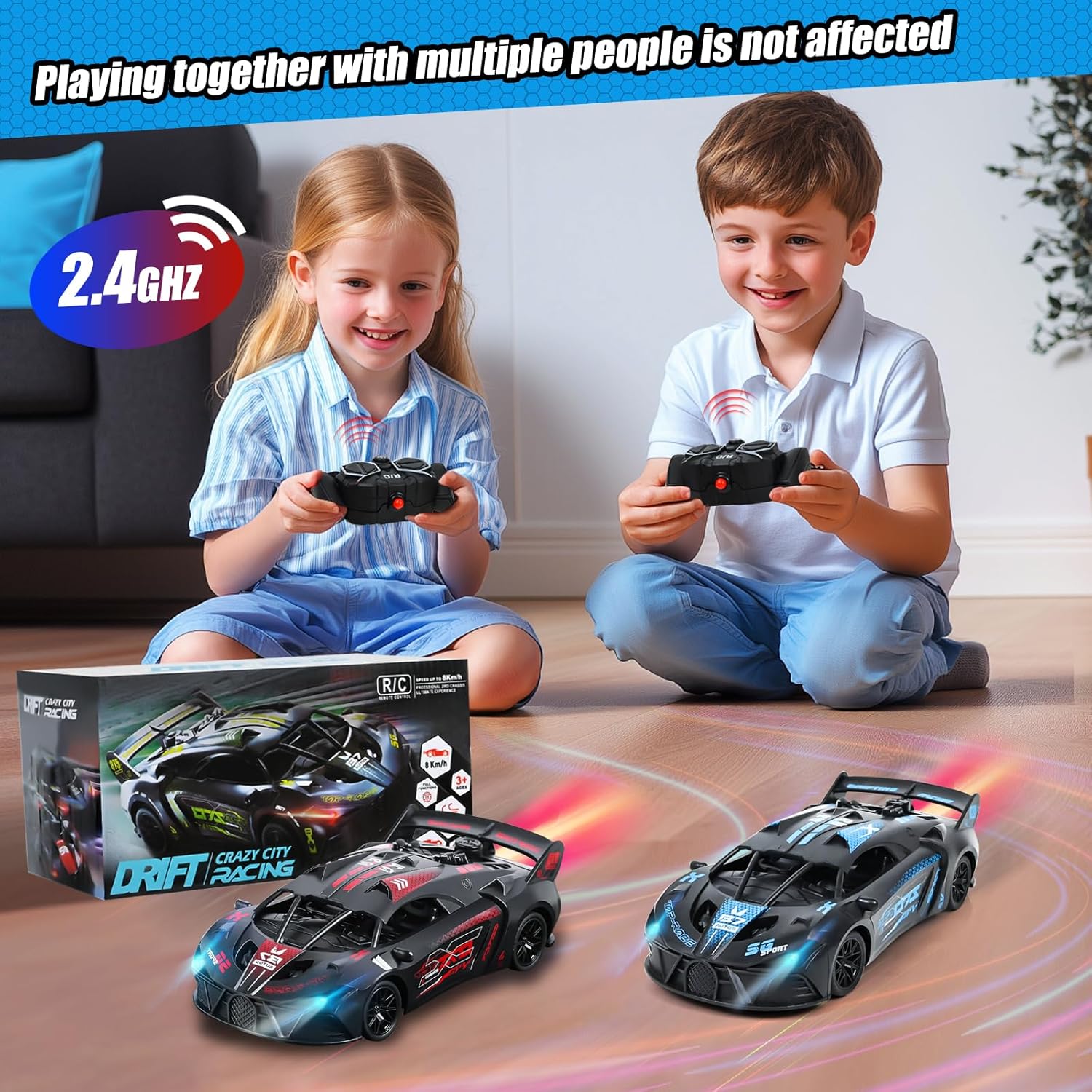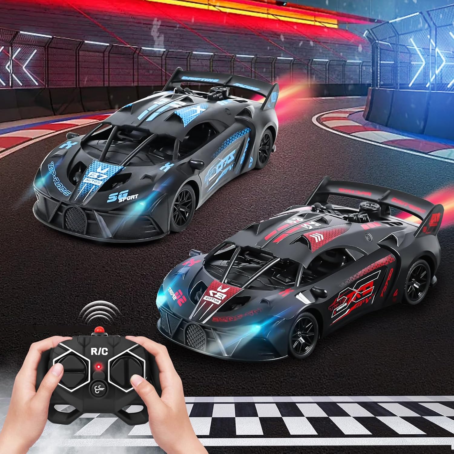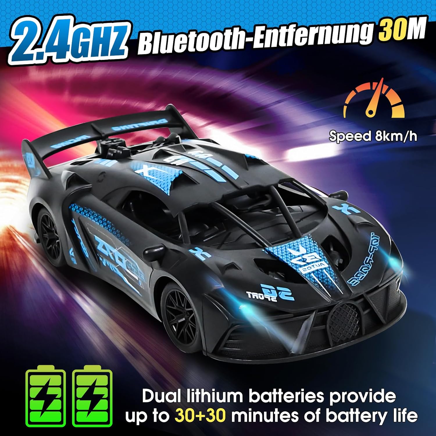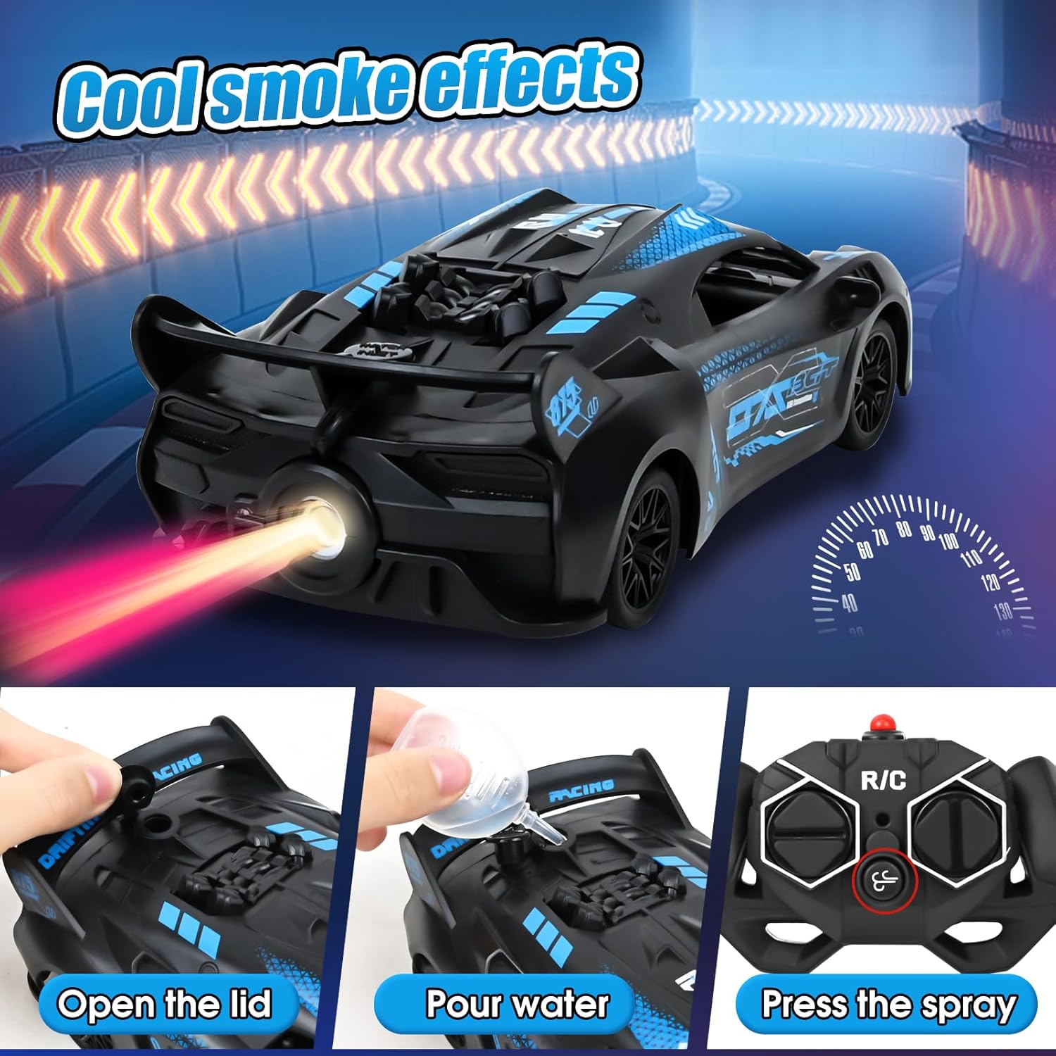 🏎🏎【Potente Supercar】Supercar RC in scala 1:18, perfetta riproduzione del design delle auto sportive di alta gamma, ogni carrozzeria aerodinamica è accuratamente lucidata. Questo modello da collezione non è solo un giocattolo, ma anche il veicolo definitivo con cui ogni ragazzo può realizzare il suo sogno di correre. 🏁🏁【Telecomando 2,4 GHz】La tecnologia wireless ad alta frequenza 2,4 GHz consente di raggiungere una distanza di 25 metri con visione ultra nitida e un controllo preciso. Un sistema intelligente di accoppiamento delle frequenze assicura che ogni telecomando controlli la propria auto in modo indipendente. In questo modo, più auto possono gareggiare l'una contro l'altra senza interferire tra loro, garantendo il puro divertimento della corsa. 🏆🏆【Fari a LED ed Effetto Fiamma Posteriore】La nostra auto da corsa RC è dotata di fari a LED luminosi nella parte anteriore e di un realistico effetto fumo nella parte posteriore dell'auto. Utilizzate il bocchettone di riempimento dell'acqua incluso nel set, riempitelo d'acqua e premete il pulsante dell'ugello: l'auto giocattolo produce un effetto fumo realistico quando va avanti o indietro, consentendo ai bambini di provare l'emozione di una vera auto da corsa. ✅✅【Carrozzeria Robusta e di Alta Qualità】L'auto giocattolo telecomandata è realizzata in materiale ABS resistente e altamente resistente agli urti. Le 4 ruote sono in gomma di alta qualità per evitare lo slittamento, resistenti all'usura e alle cadute, migliorando la manovrabilità e la durata. Dotata di 2 batterie ricaricabili e cavo di ricarica USB, impiega circa 1,5 ore per ricaricarsi completamente e può funzionare ininterrottamente per 30 minuti. 🎁🎁【Il regalo Perfetto per il Tuo Bambino】Con il suo colorato spettacolo di luci, gli effetti fumogeni mozzafiato e le precise prestazioni in derapata, questa supercar RC diventerà sicuramente la preferita dei piccoli piloti dai 3 anni in su. Confezionata in una splendida scatola regalo, è l'ideale per i regali di compleanno, Natale e Capodanno, affinché ogni bambino possa vivere i momenti gloriosi di un pilota da corsa!