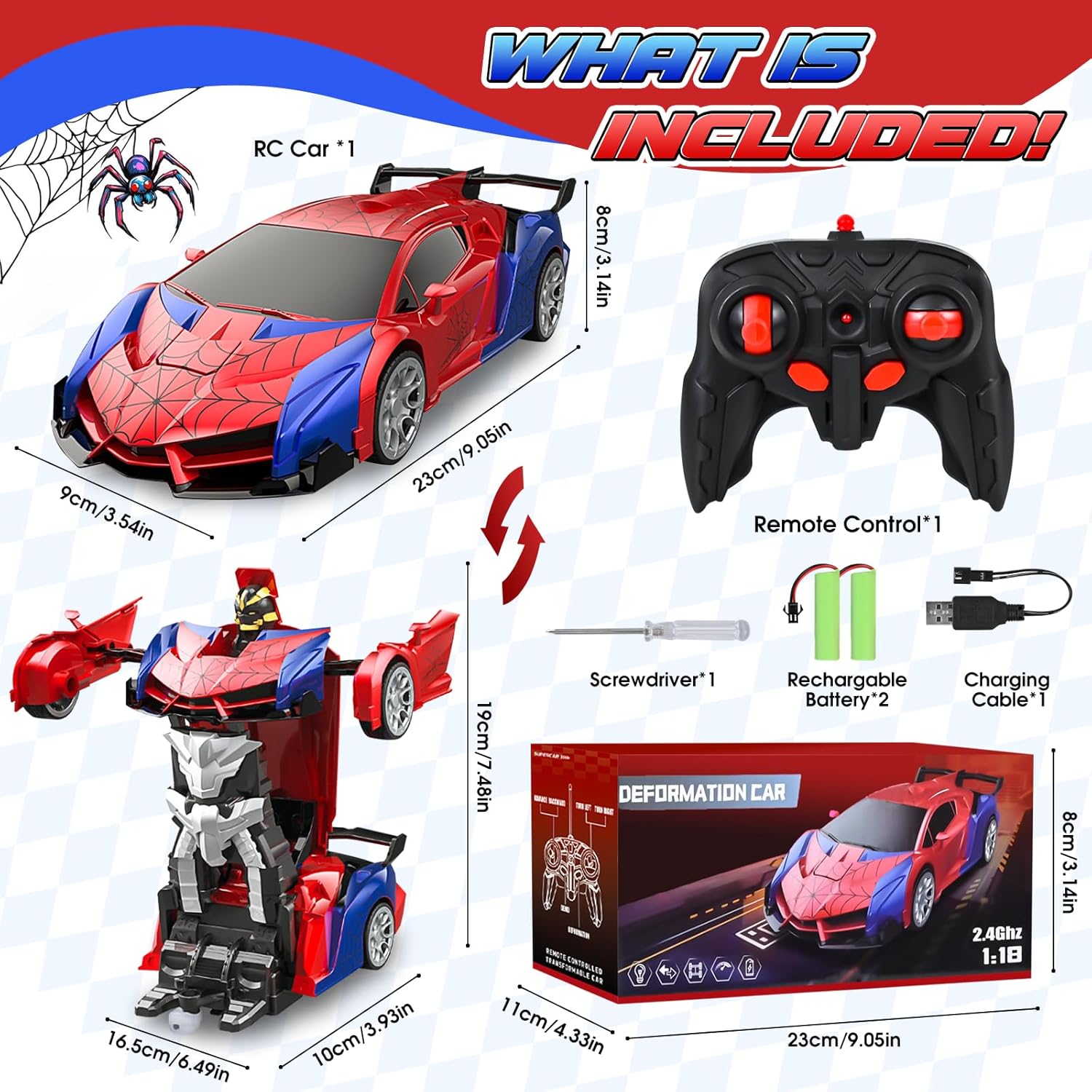 🏎️Set di Auto Giocattolo Telecomandate: Set completo di accessori e servizio di alta qualità. Questo set di auto giocattolo RC include scatola colorata *1, batteria al litio ricaricabile da 3,7v *2, cavo di ricarica *1, cacciavite *1, auto RC ragno *1, maniglia RC *1 (sono necessarie 2 batterie AA per il funzionamento, il set non include batterie AA). La velocità dell'auto giocattolo può raggiungere i 10KM/H. Se avete domande, non esitate a contattarci via e-mail. 🏎️Batteria al Litio Ricaricabile: L'auto RC viene fornita con due batterie al litio ricaricabili da 3,7 volt e 800 mAh, che si ricaricano in soli 150 minuti. Mentre una batteria è in carica, è possibile utilizzare la seconda per continuare il divertimento di guida. Le due batterie funzionano perfettamente insieme per un massimo di 70 minuti ininterrotti di gara e divertimento. 🏎️Tecnologia di Controllo Remoto Wireless a 2,4 GHz: L'auto RC ha un raggio d'azione di 50-80 metri. In questo modo il bambino ha tutto lo spazio per dimostrare le proprie capacità in una gara di corsa con i suoi coetanei. Allo stesso tempo, non dovrà preoccuparsi delle interferenze con i segnali dei telecomandi di più macchinine, poiché la tecnologia del telecomando wireless a 2,4 GHz consente di giocare con più macchinine contemporaneamente. 🏎️Design Convertibile a Forma di Ragno: Questo giocattolo per bambini combina un'auto e un robot in uno, in modo da poter passare avanti e indietro tra l'auto e il robot. L'auto giocattolo in miniatura in scala 1:18 con il design a forma di ragno rosso e blu si adatta all'estetica dei bambini e offre divertimento e intrattenimento extra durante il gioco. 🏎️Scelta Regalo Perfetta: La nostra auto acrobatica RC è realizzata in plastica atossica e riutilizzabile, sicura per i bambini. Inoltre, incoraggia il gioco all'aria aperta e aiuta i bambini a sviluppare le capacità motorie e la coordinazione occhio-mano divertendosi all'infinito. Può essere utilizzato come regalo di compleanno, regalo di Natale per bambini e bambine di età superiore ai 3 anni.