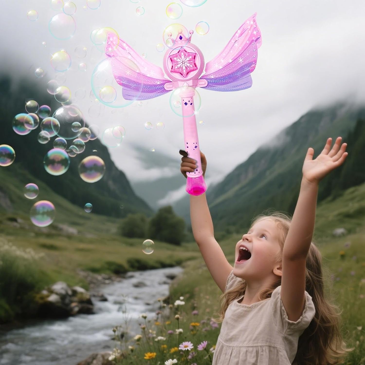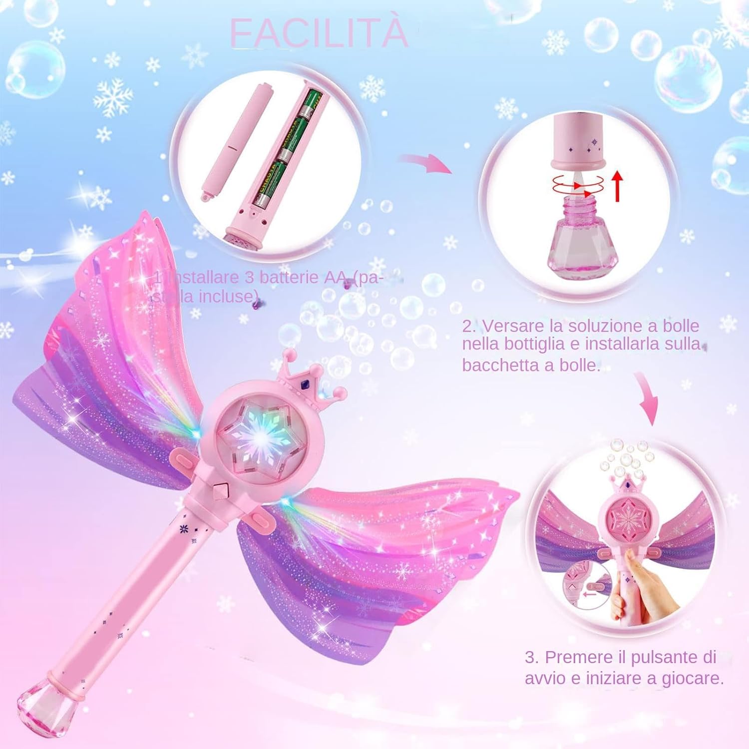 Funzionamento intuitivo: progettato per i bambini con attivazione mediante semplice pressione e uso di monobouton, associato a un rotante automatico per bolle fluide e un gioco continuo senza interruzione. Effetti della luce automatica: crea parti di luci multicolori accattivanti durante la produzione di bolle, offrendo un'atmosfera calda all'interno e all'esterno grazie all'attivazione automatica degli effetti visivi. Interazione giocosa: sperimenta un gioco ricco di sensazioni con bolle rilasciate in ritmo su melodie gioiose per un'immersione interattiva grazie alla nostra macchina a bolle automatica Esperienza efficace: un circuito a basso consumo e un di alimentazione liquida stabile garantiscono un gioco continuo e prolungato senza interruzioni. Stile di bacchetta : dettagli creativi di e stelle su questa bacchetta di bolle, ottimizzando le esperienze di gioco di ruolo grazie a design coinvolgenti e fantasiosi.