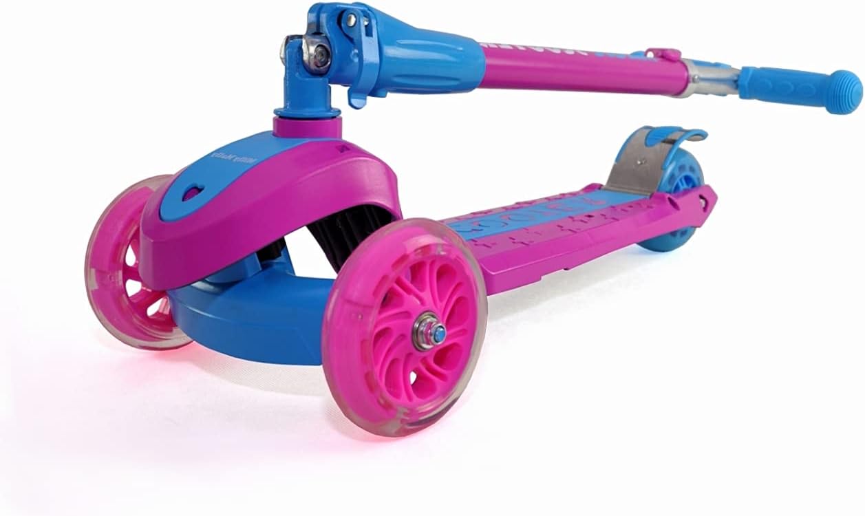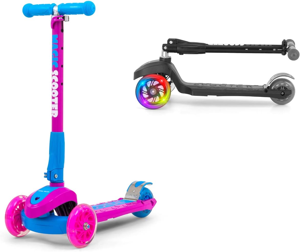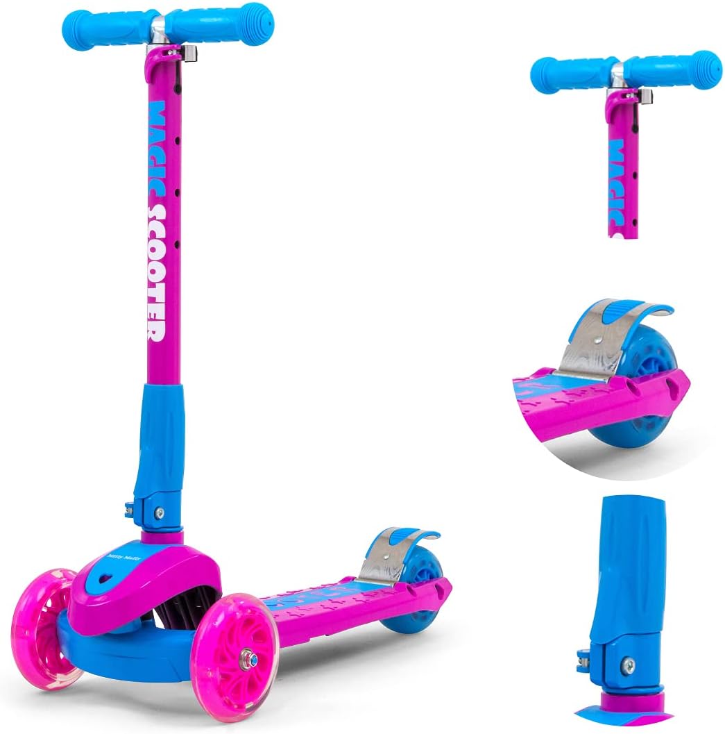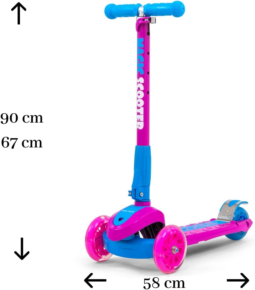 Costruzione leggera e robusta (alluminio, fibra di vetro, PVC). Stabilità e sicurezza garantite con uno scooter a tre ruote. Controllo: la torsione funziona secondo il principio dell'equilibrio del corpo. Comode maniglie con regolazione in altezza. Le ruote in plastica di alta qualità garantiscono un buon fissaggio e le ruote anteriori brillano. Dotato di freno - Pannello posteriore parafango. Fascia d'età 3+. La soluzione perfetta per i gruppi attivi che sono sempre in movimento. Carico massimo: 50 kg.