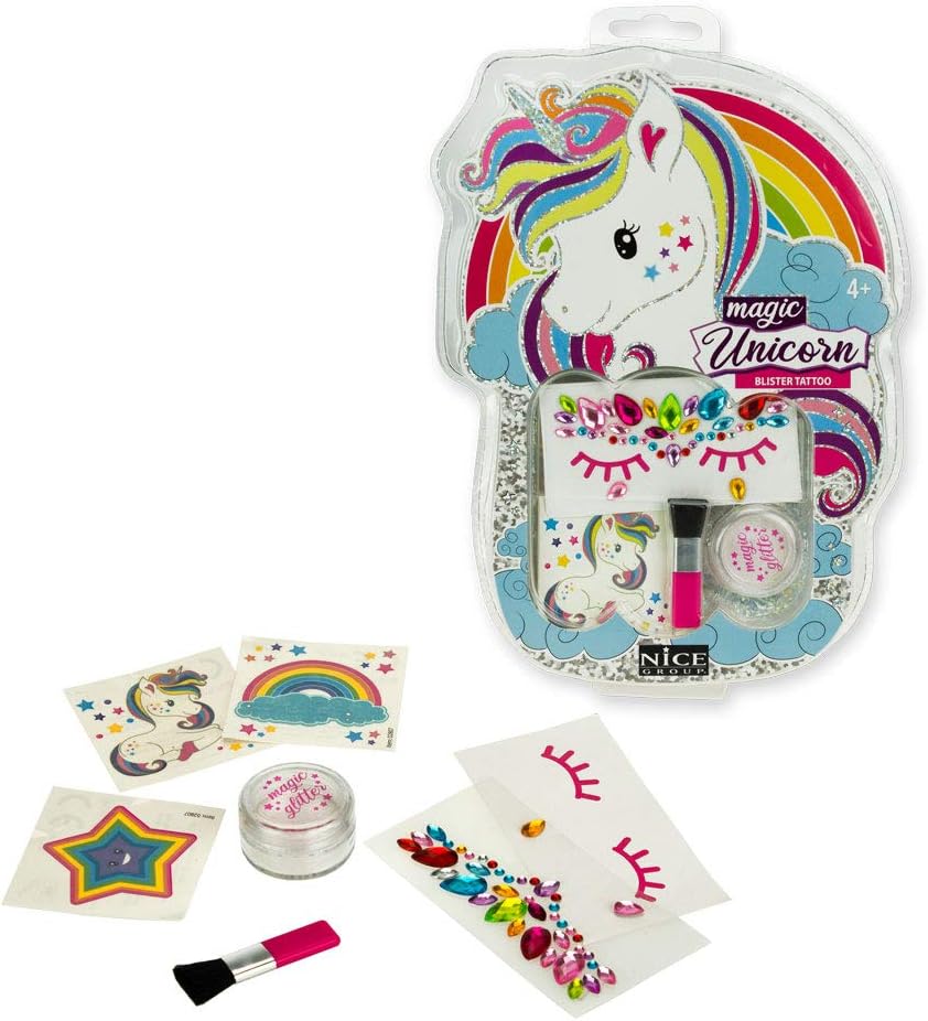 Mini Tattoo Set Tattoo per bambini Blister che include 3 tatuaggi glitterati, 1 foglio di pietre adesive per il viso e polvere glitterata per completare e illustrare il look dell'unicorno! I tatuaggi sono testati e sicuri e si rimuovono facilmente con sapone. Istruzioni facili da seguire in italiano. Età consigliata: 4 anni